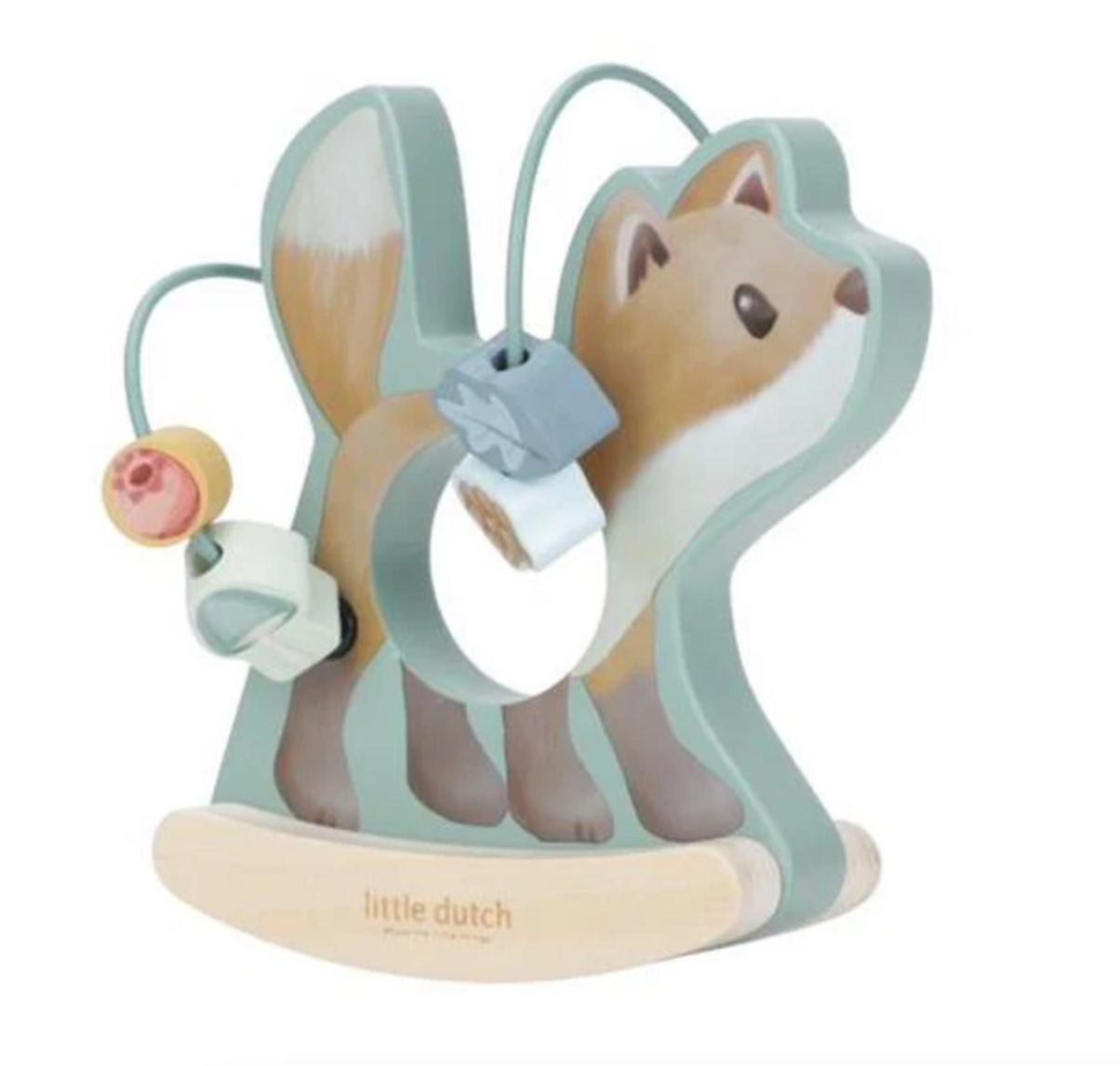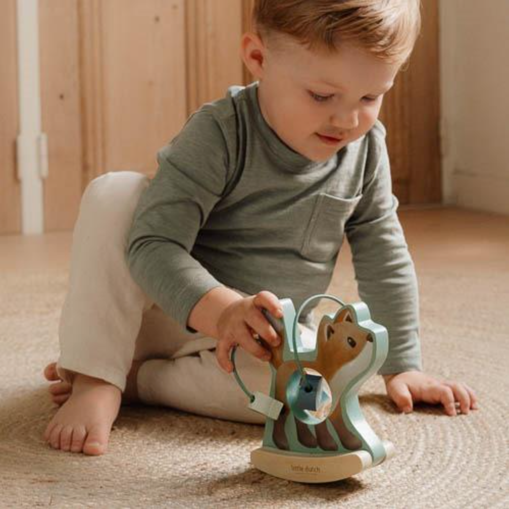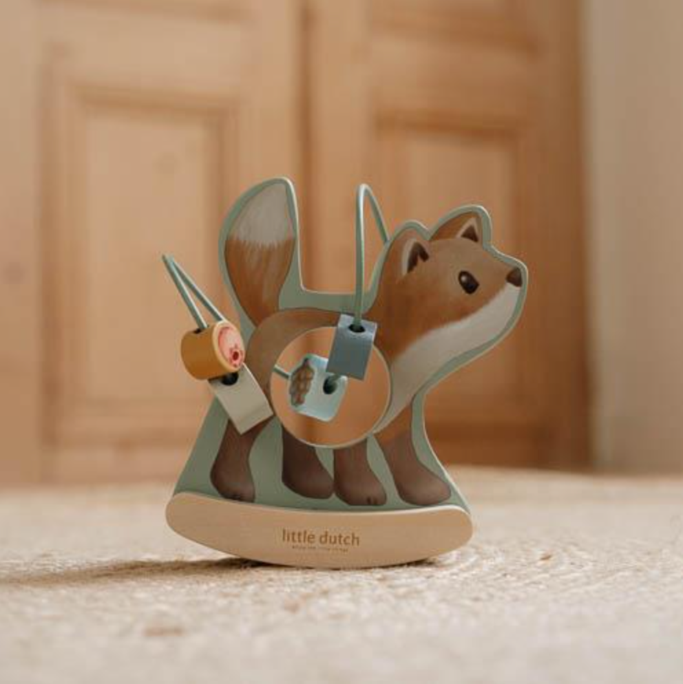 Let the beads spiral around the wooden fox as he rocks back and forth. Encouraging playful interaction, this charming toy invites you to give him a gentle push, setting him in motion to dance around the enchanted forest.