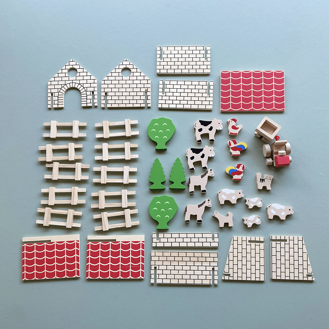 Children can stack the animals, build fences, or create their own scenes, letting the donkey wander, the ducks splash in the pond, and the rooster watch over the farm. This open-ended playset nurtures fine motor skills, spatial awareness, and language development while inviting calm, creative engagement.