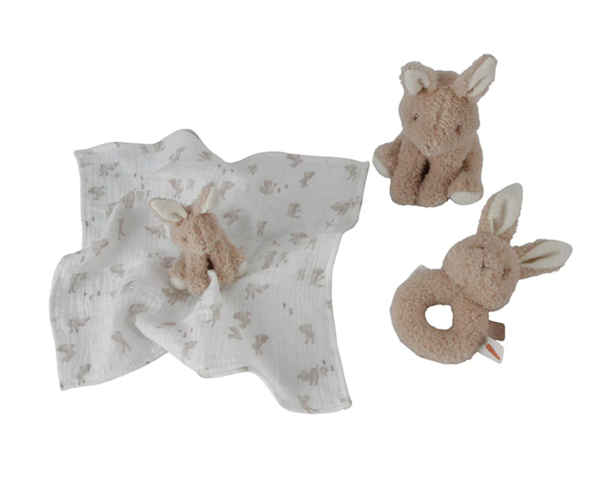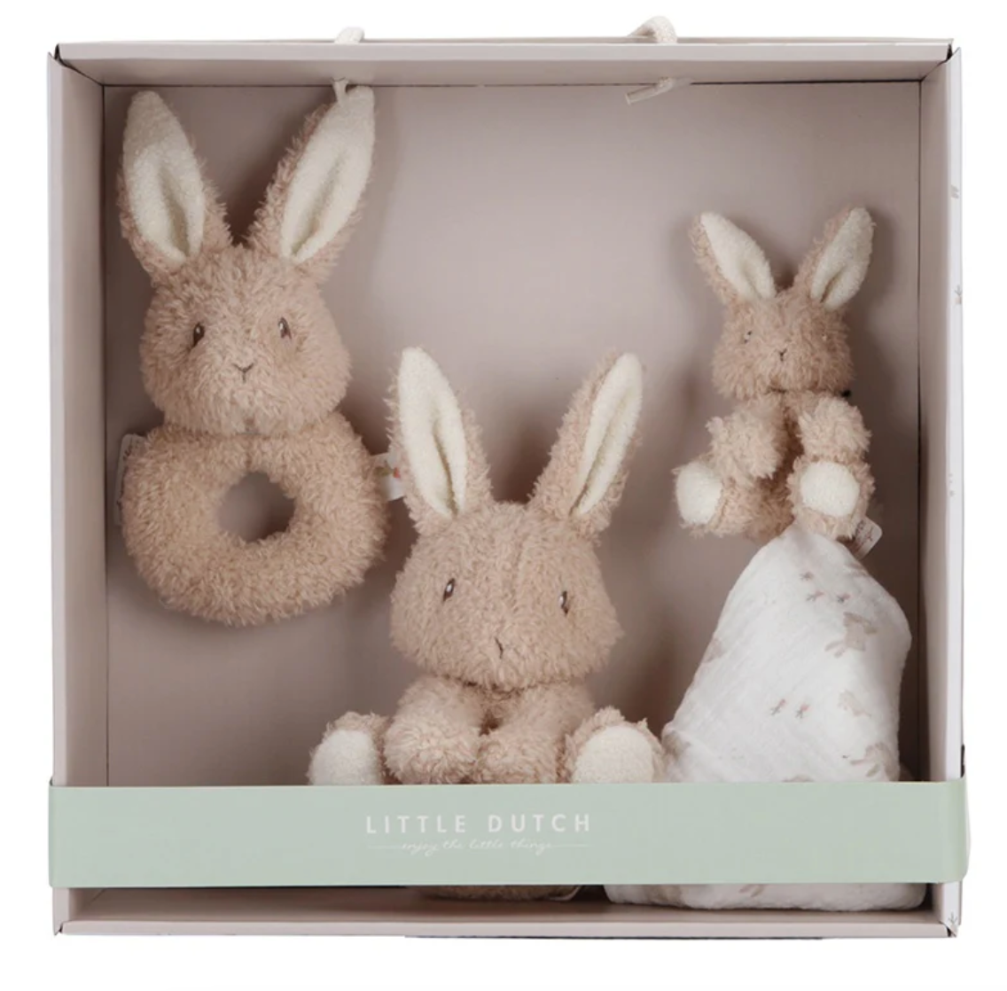 Together, our favourites from the Baby Bunny collection make the perfect maternity or baby shower gift. This pretty box contains three soft products to sleep, cuddle and play with. The cuddly blanket with soft bunny is great for cuddling, but is also fun for a game of peekaboo. The cuddly rabbit is always in for a big cuddle and loves to go everywhere with you. This set includes a rattle with a rattling soft bunny to play with. It stimulates baby's hand-eye coordination and curiosity. The teething ring also offers baby comfort when the first teeth arrive. The products are packed in a nice gift box.
