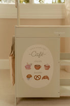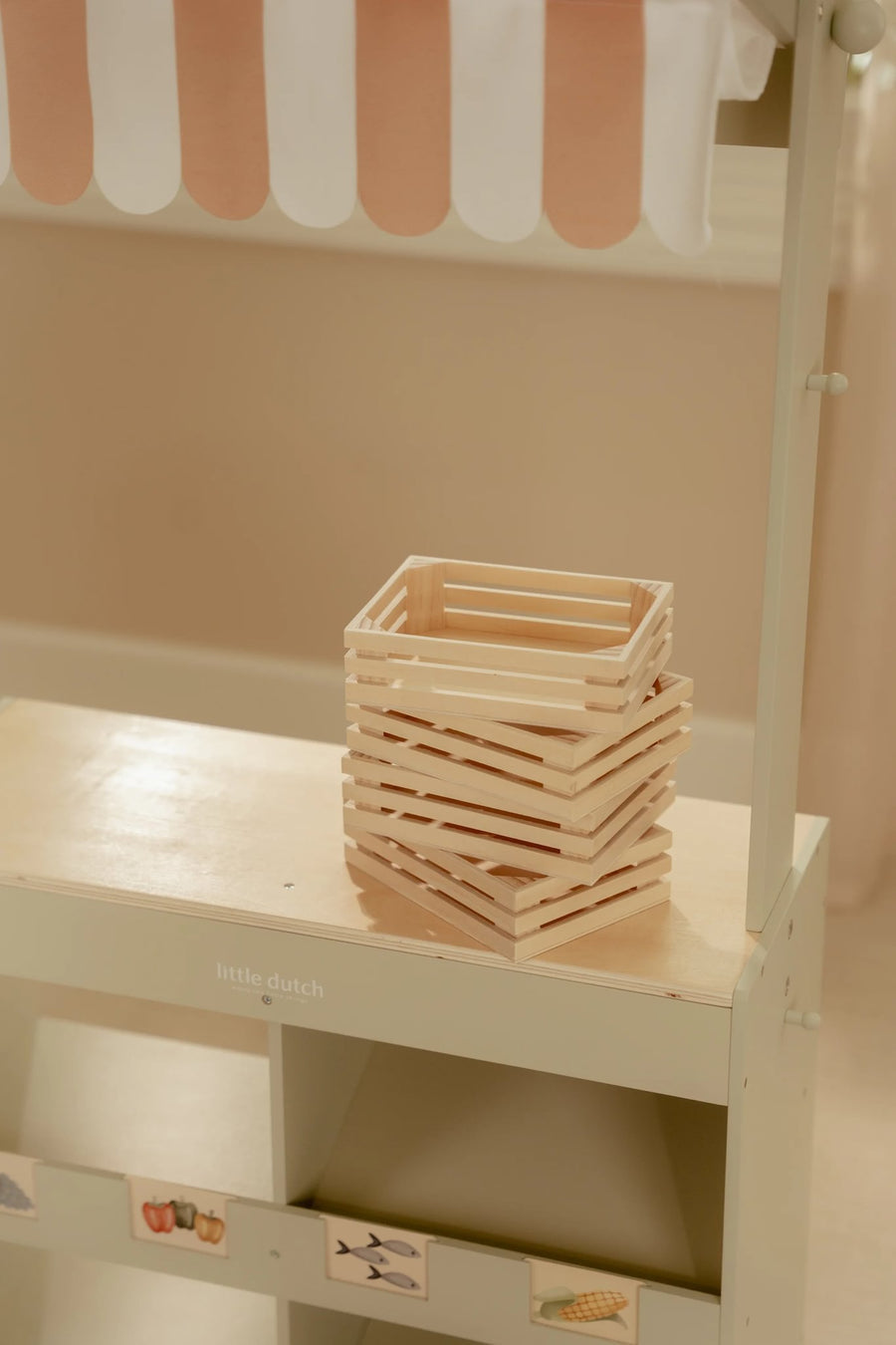Welcome to the market! With this beautiful wooden market stall, children can create their own little shop. The fabric canopy creates an authentic market atmosphere, and the chalkboard and illustrated cards allow them to beautifully display their products. The set also includes a shopping bag and crates for a real shopping experience. Turn the market stall over and it becomes a café, complete with a menu and cheerful illustrations. Combine it with the cash register, scales, or cake stand for even more fun. What's on the menu today?