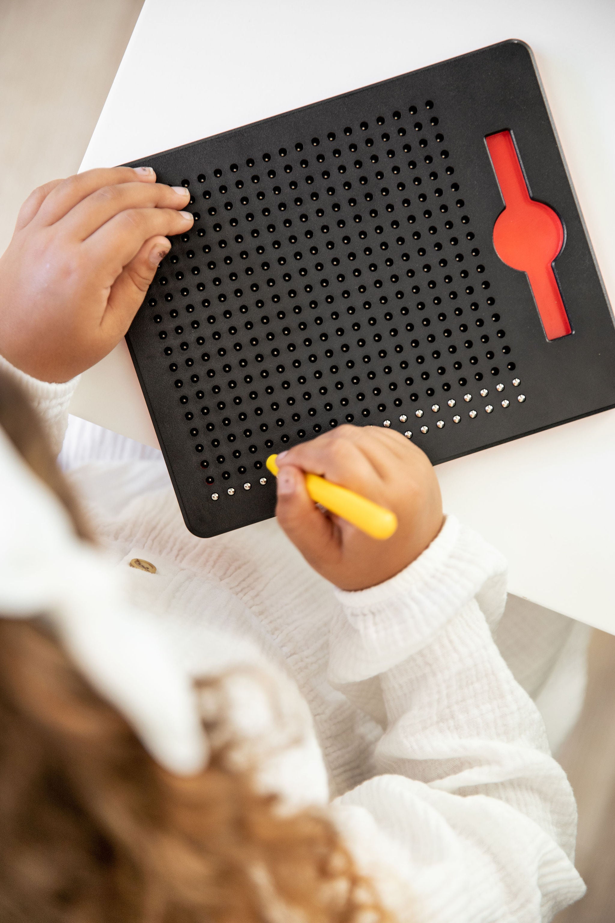 What looks like a drawing toy is actually doing a great deal of developmental work. Using the magnetic stylus requires a functional pencil grip and deliberate hand pressure, the same skills needed for writing. The bead surface provides rich tactile feedback as children draw, which supports sensory processing and helps reinforce letter and shape formation in a way that paper simply cannot.