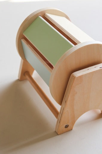 Pastel Spinning Drum Pull the handle down and watch the colours spin, a bell rings inside as a reward. Develops cause and effect understanding, grip strength, and bilateral coordination. Can be used upright or during tummy time. Best from 6 months.
