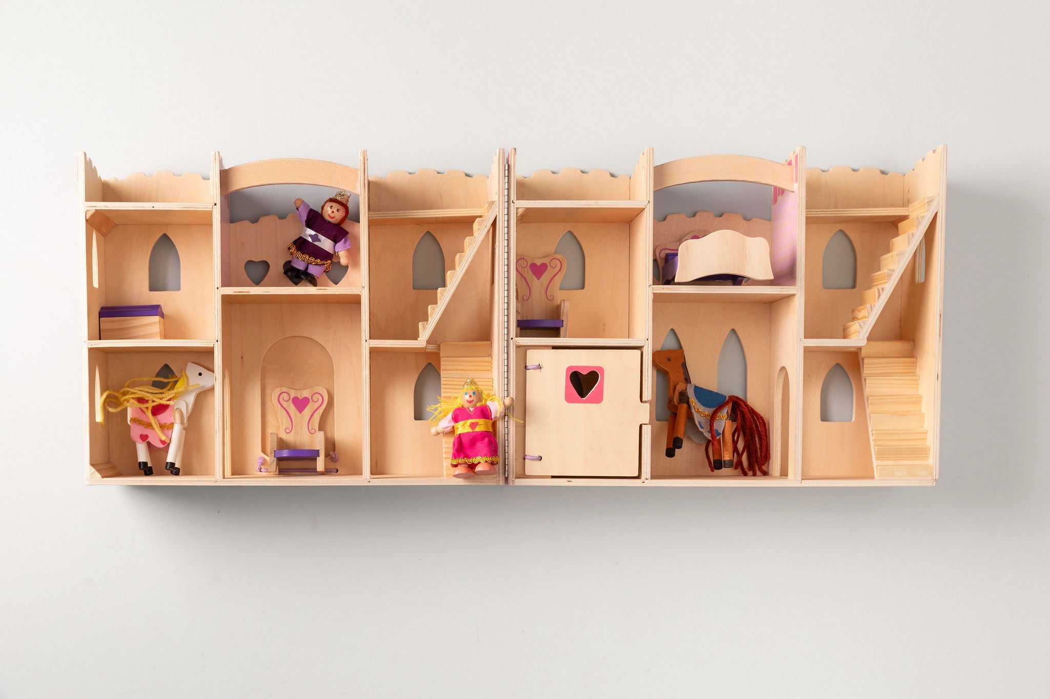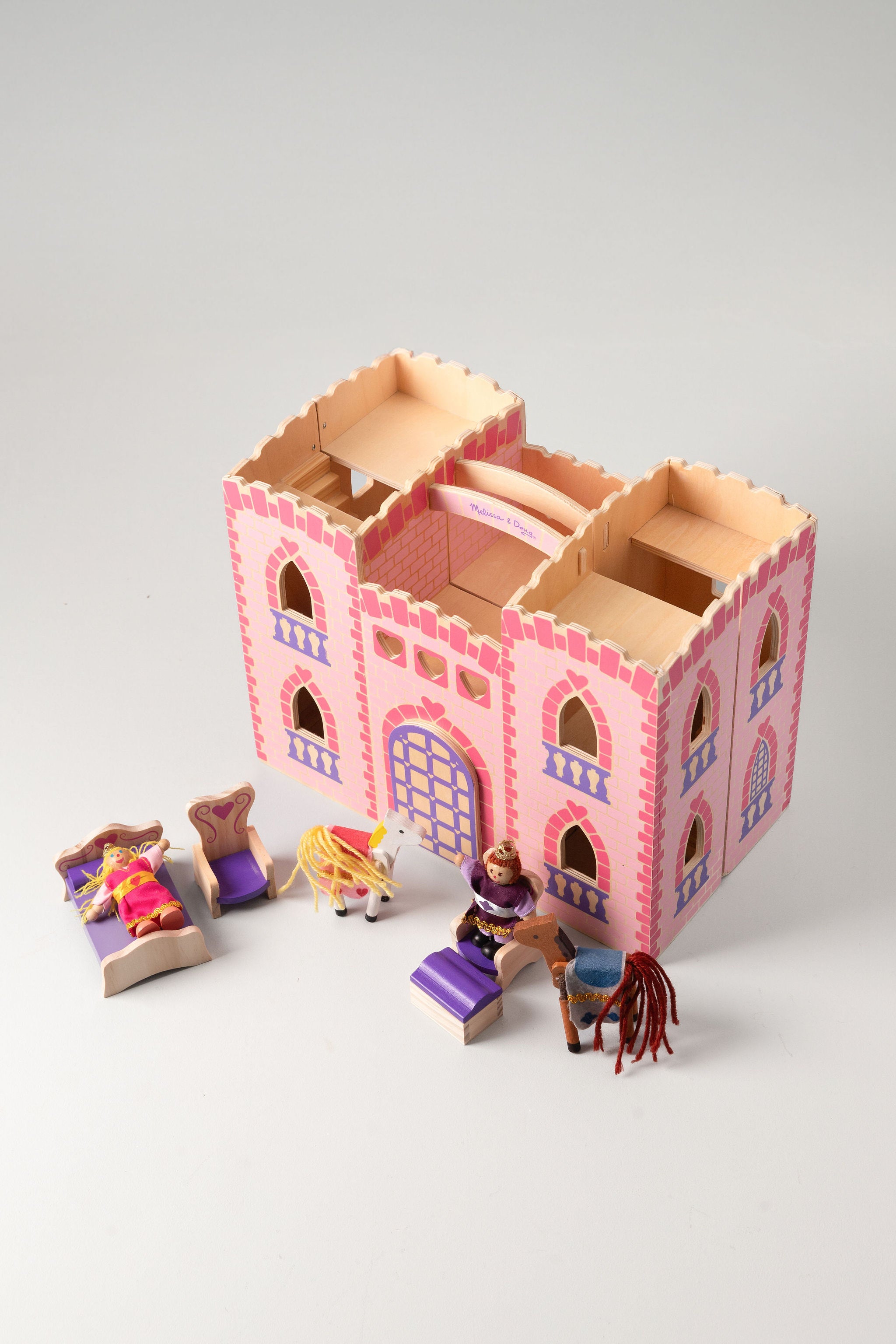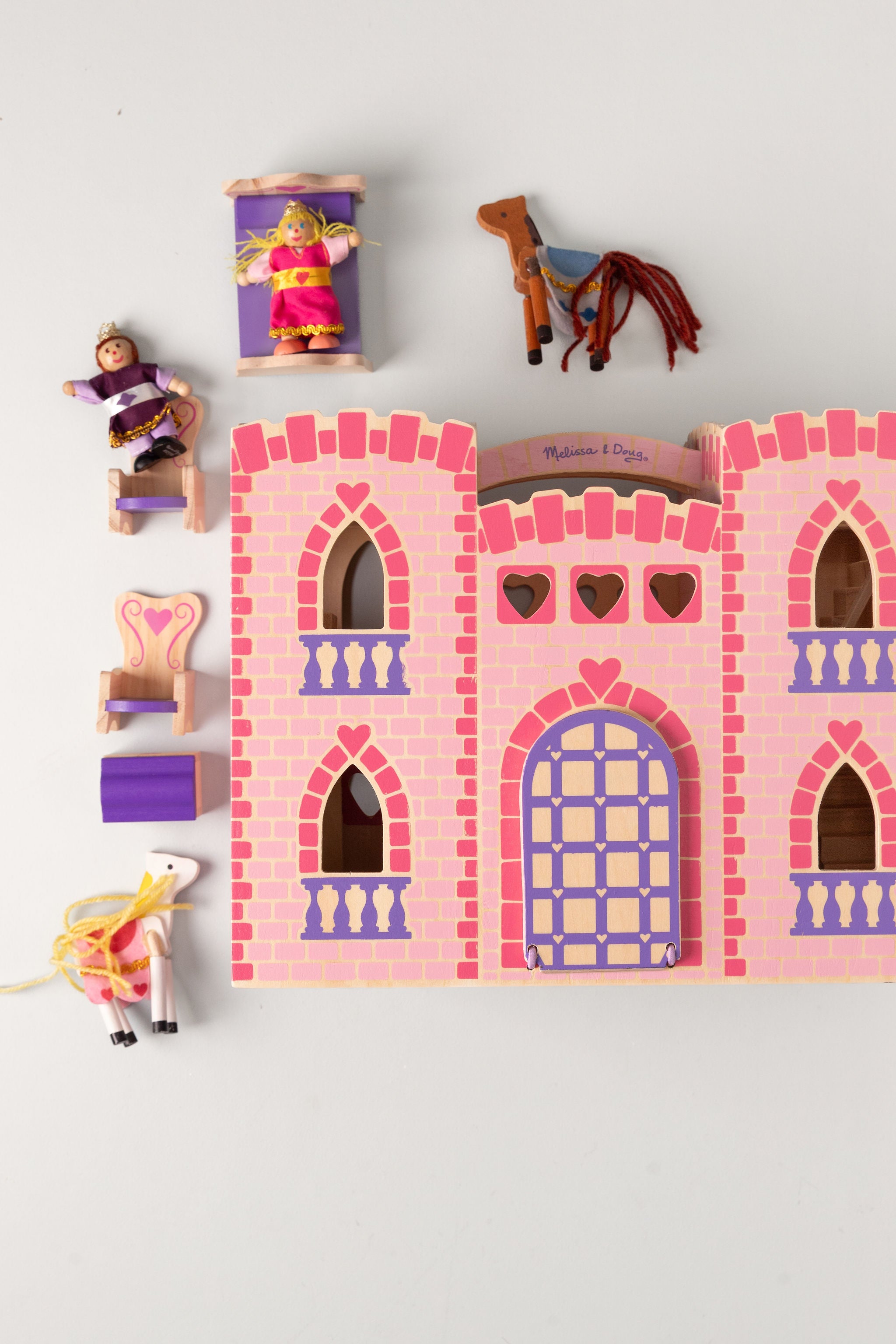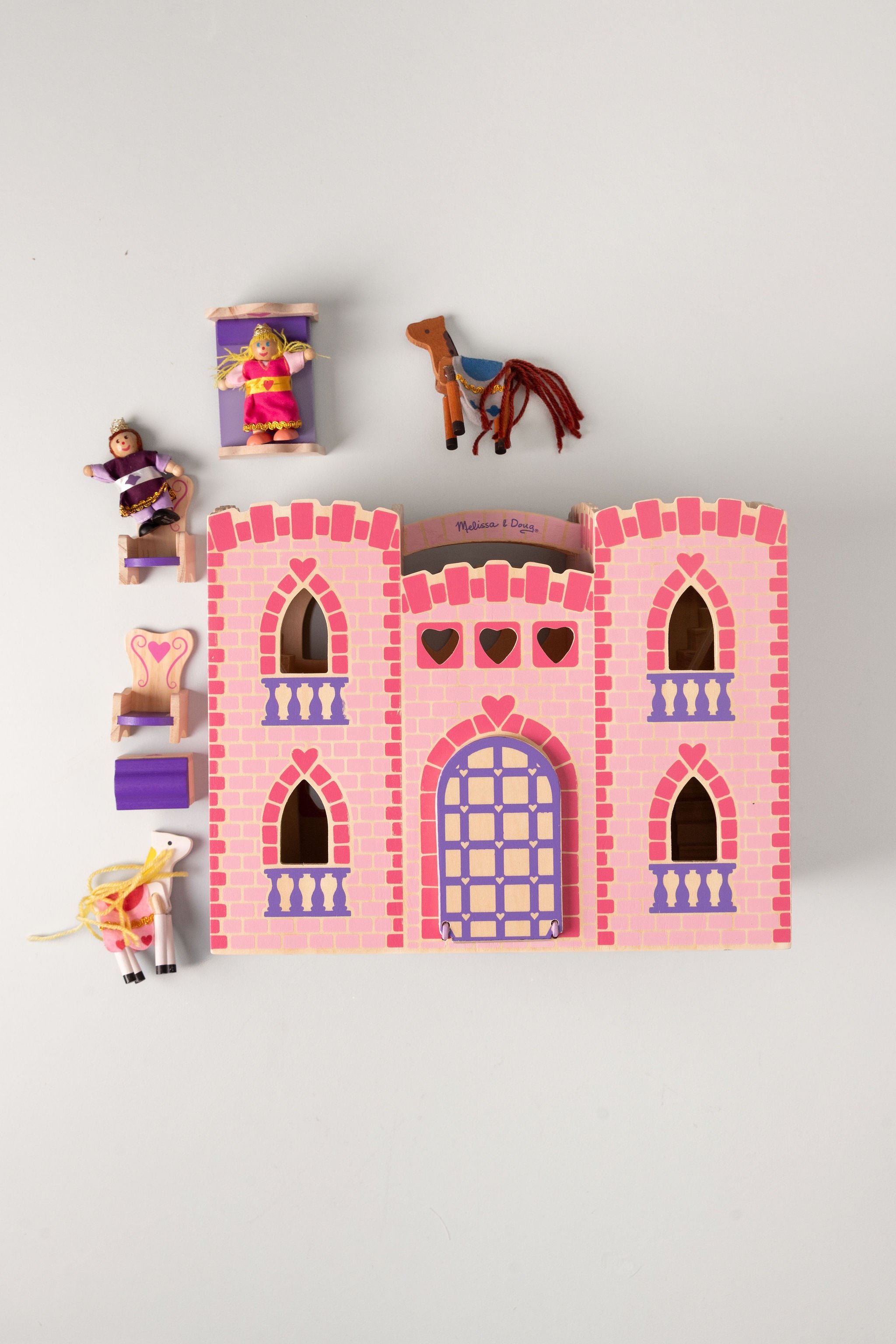 - FOLDING WOODEN PRINCESS CASTLE: The Melissa & Doug Fold and Go Wooden Princess Castle opens for expanded play and royal adventures. It features a prince, princess, 2 thrones, 2 royal horses, a bed, and a chest, and includes a working drawbridge and convenient handle.