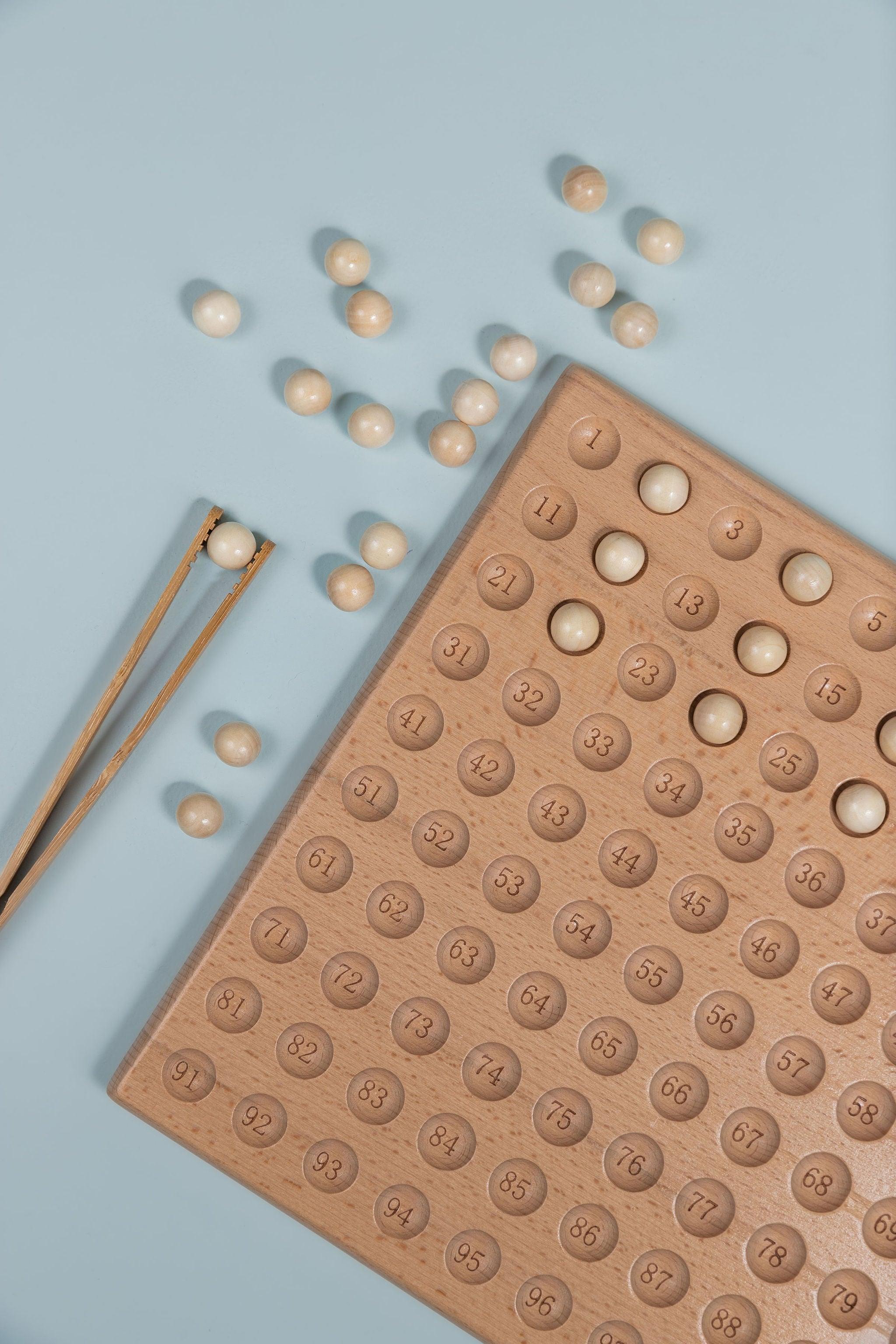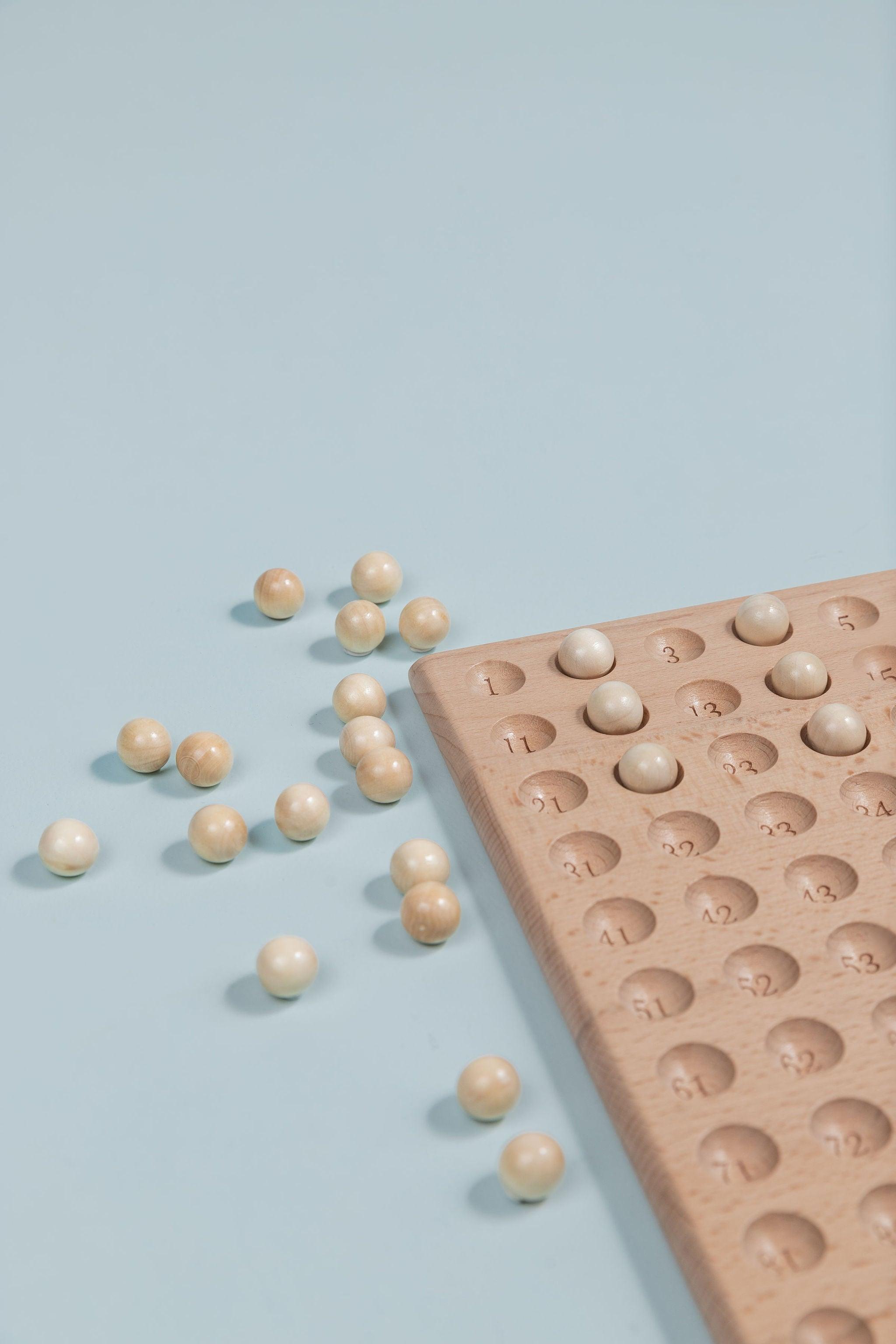 The Hundred Board is a wooden math tool featuring 100 round holes arranged in 10 rows of ten holes each. The initial hole contains the number one, serving as the starting point for children. Additionally, a set of 100 wooden balls accompanies the numbered holes. As children engage with the Hundred Board, they develop the ability to sequentially order numbers from 1 to 100, strengthen their rote counting skills, and grasp the concept of numbers in groups of tens.