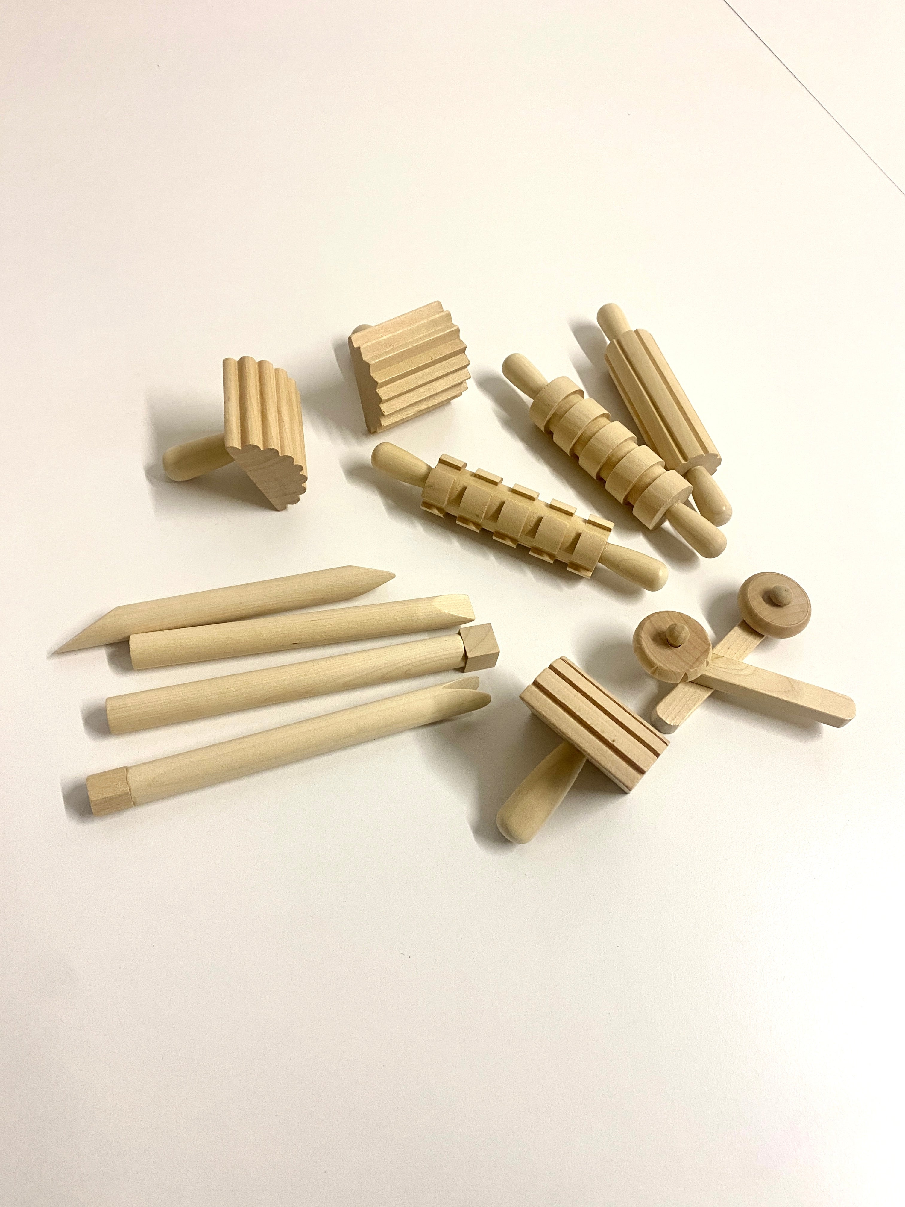 Rolling pins, smooth or textured to roll out dough into sheets or create textured patterns. Stampers to add fun patterns. Wooden wheel for added lines and textures. Wooden rocker to press and rock into the play dough making different patterns. Chisels are used to sculpt and design.