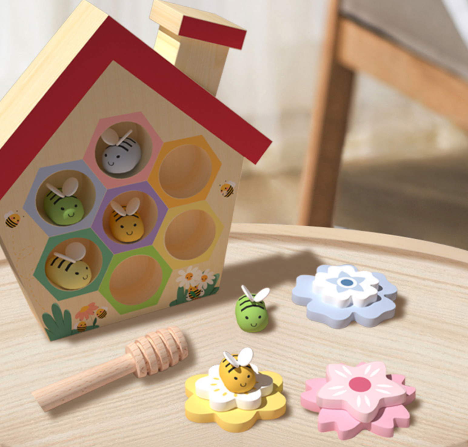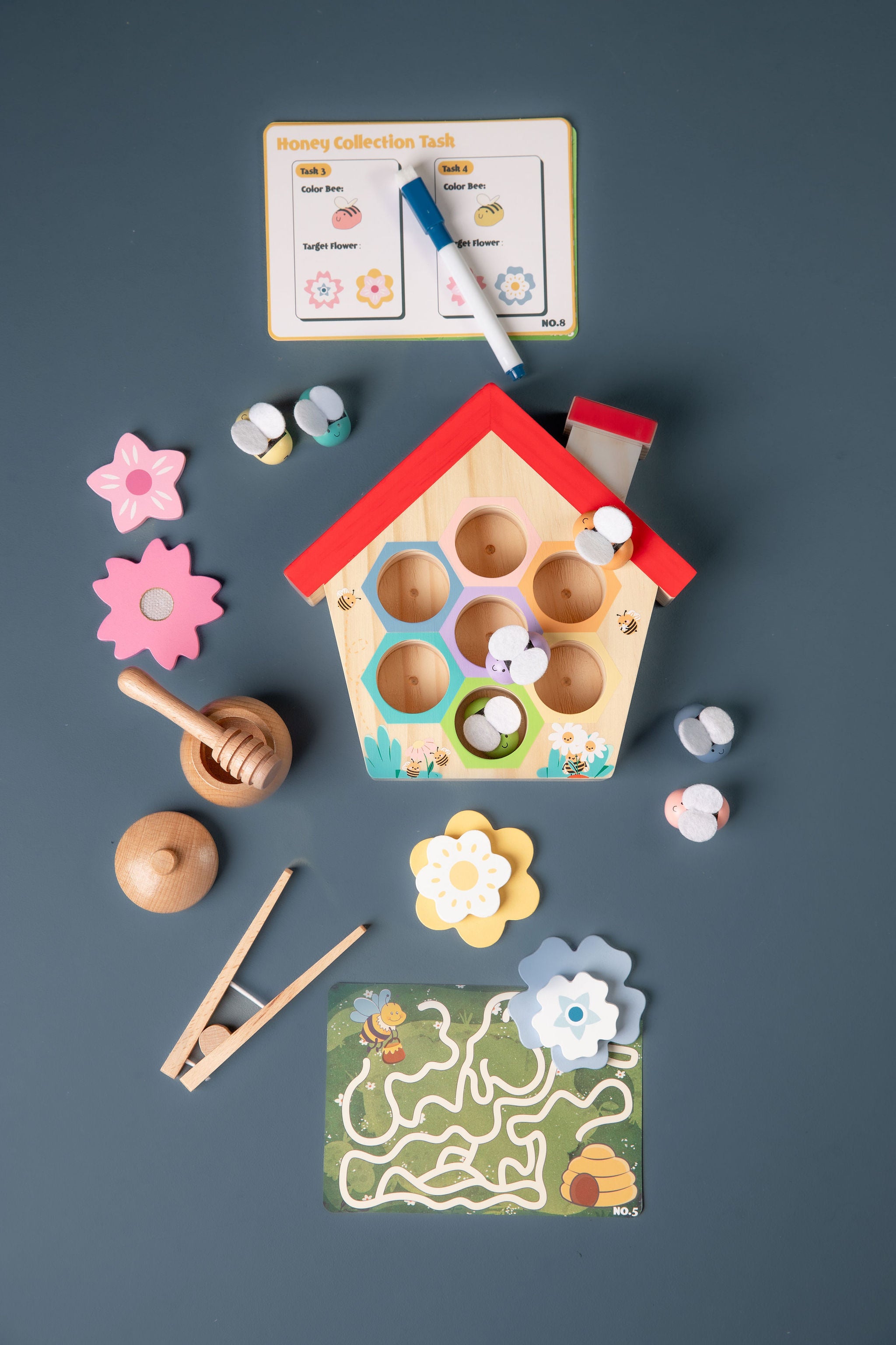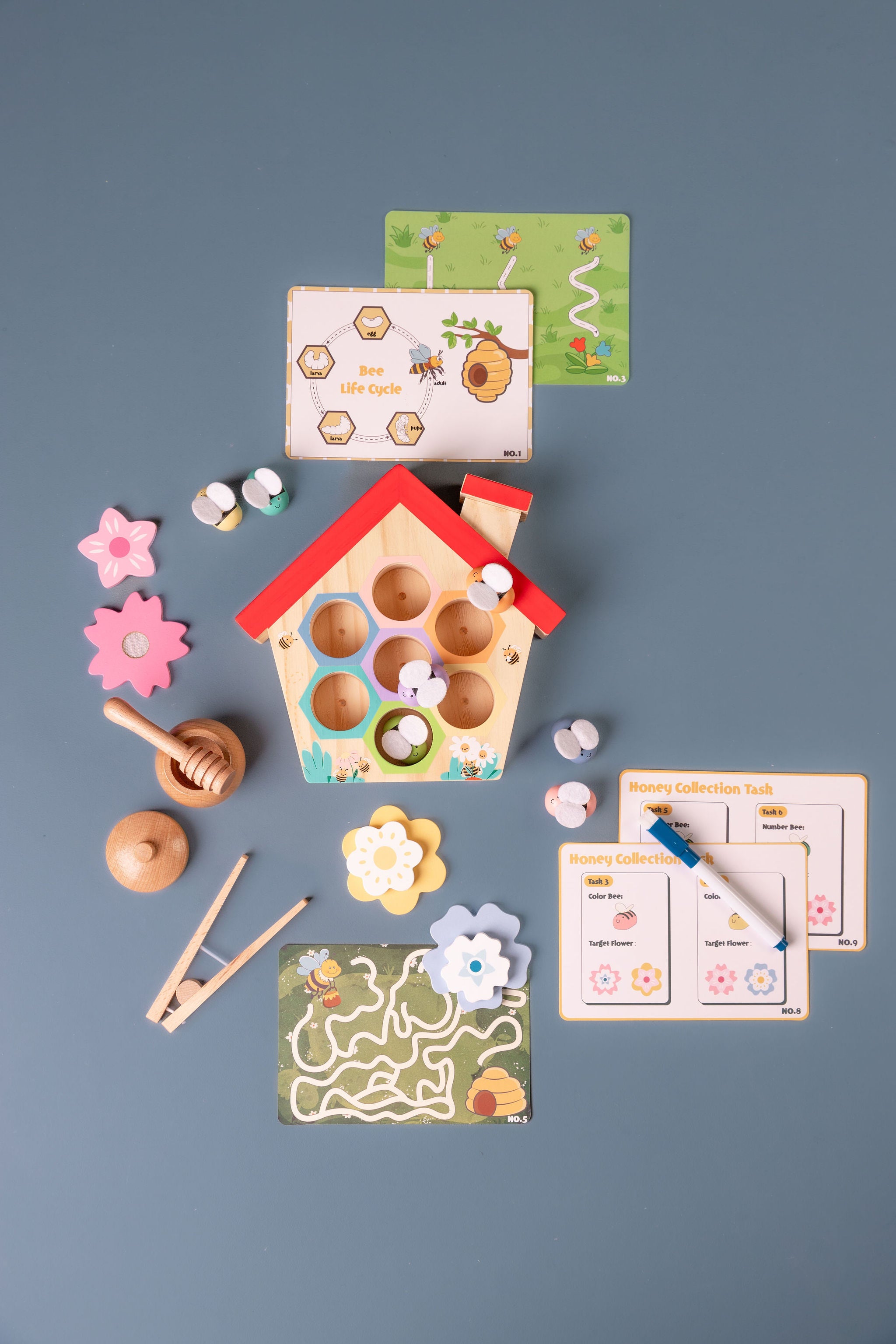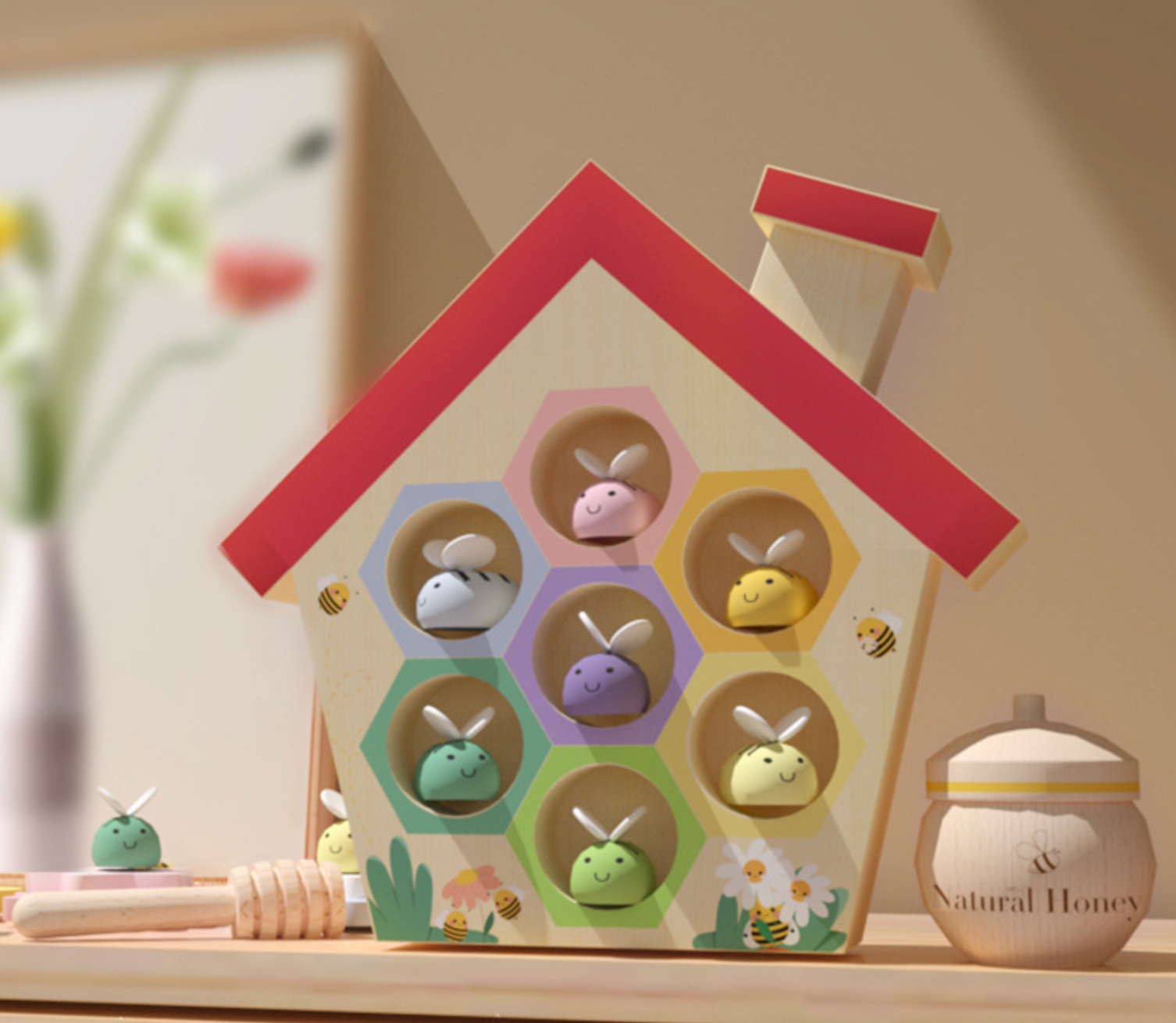 The Little House of Bees play set is sure to create fun and engaging learning experiences for your child! With 23 pieces ranging from a wooden beehive to honey pot with lid, the set would be a great add on to any sensory play area, colour and shape recognition, hand-eye coordination, and learning numbers and quantities. Let them explore the world of bees with this interactive set!