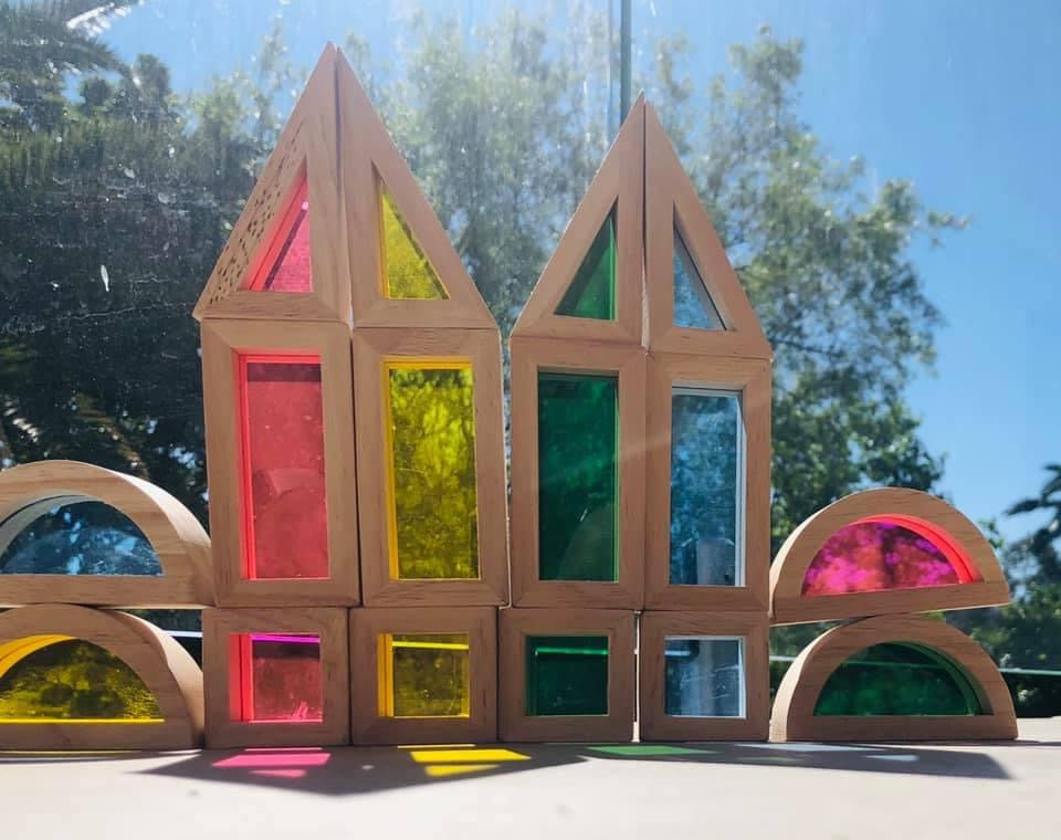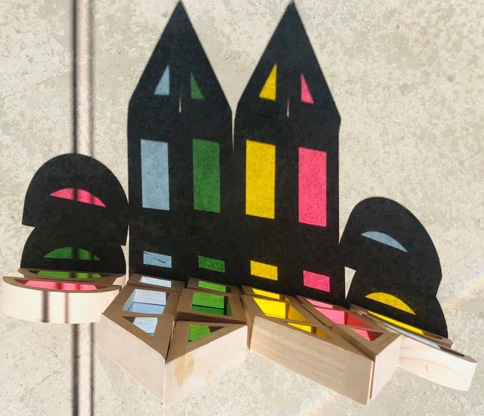 - Playing with light: The best part is playing with these on a light table or the sun. Building patterns and pictures, seeing how the sun reflects the different colours on the floor will create some special “wow” moments.