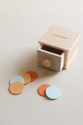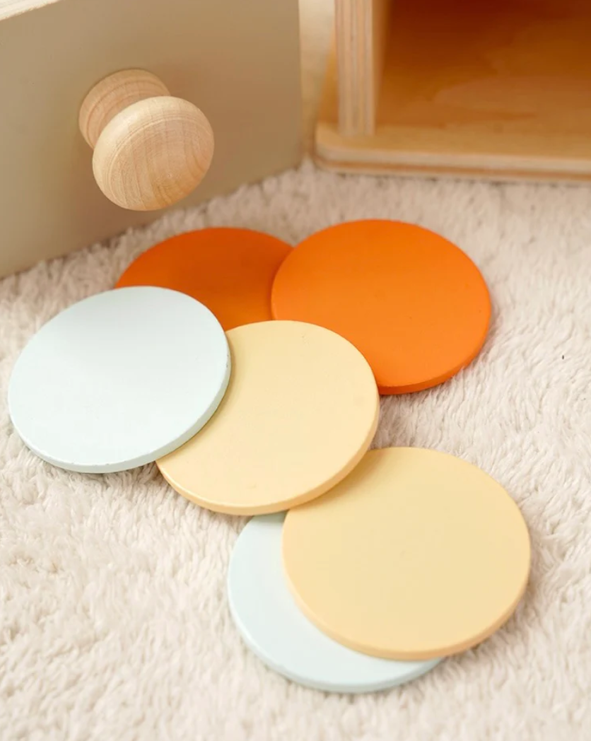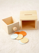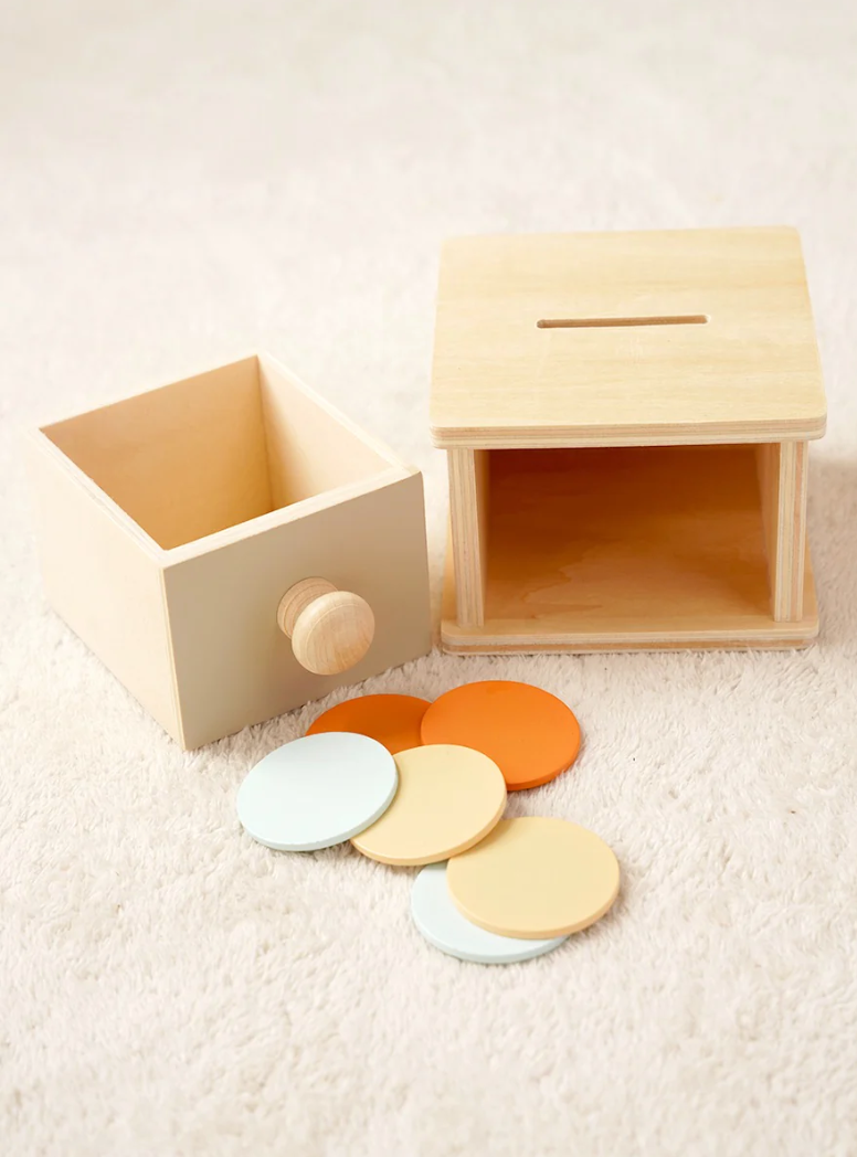 This wooden toy box with coins is ideal for babies developing coordination of movement, hand dexterity, and fine motor and concentration skills.