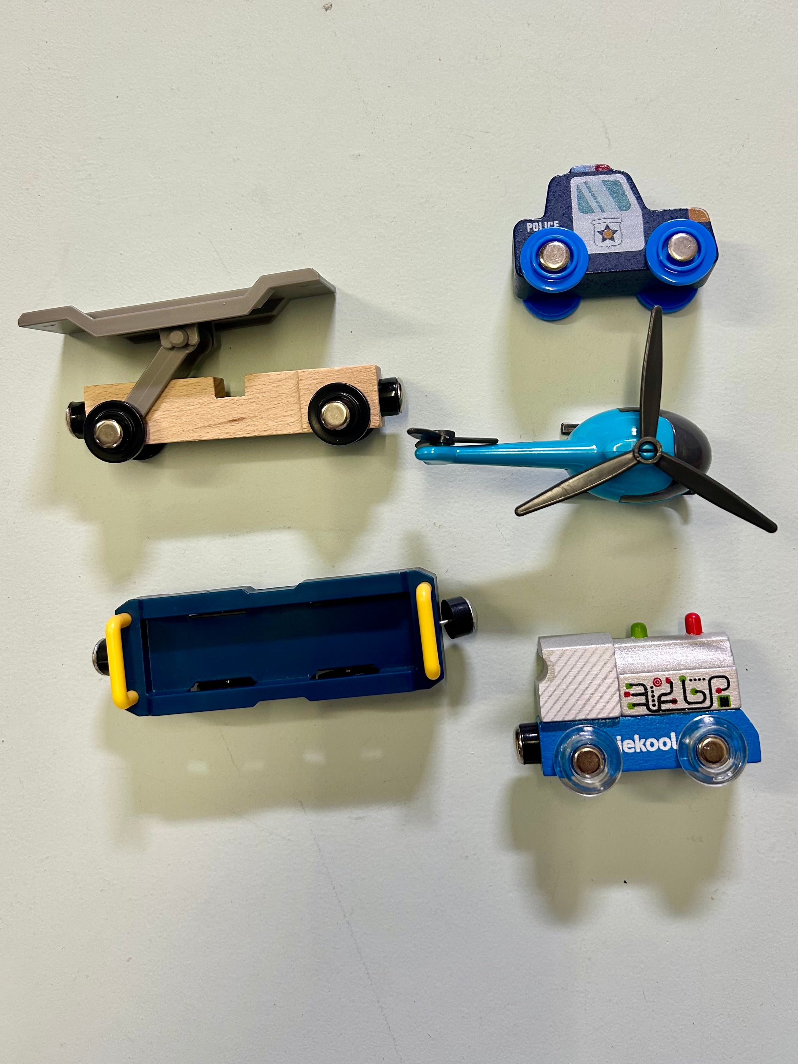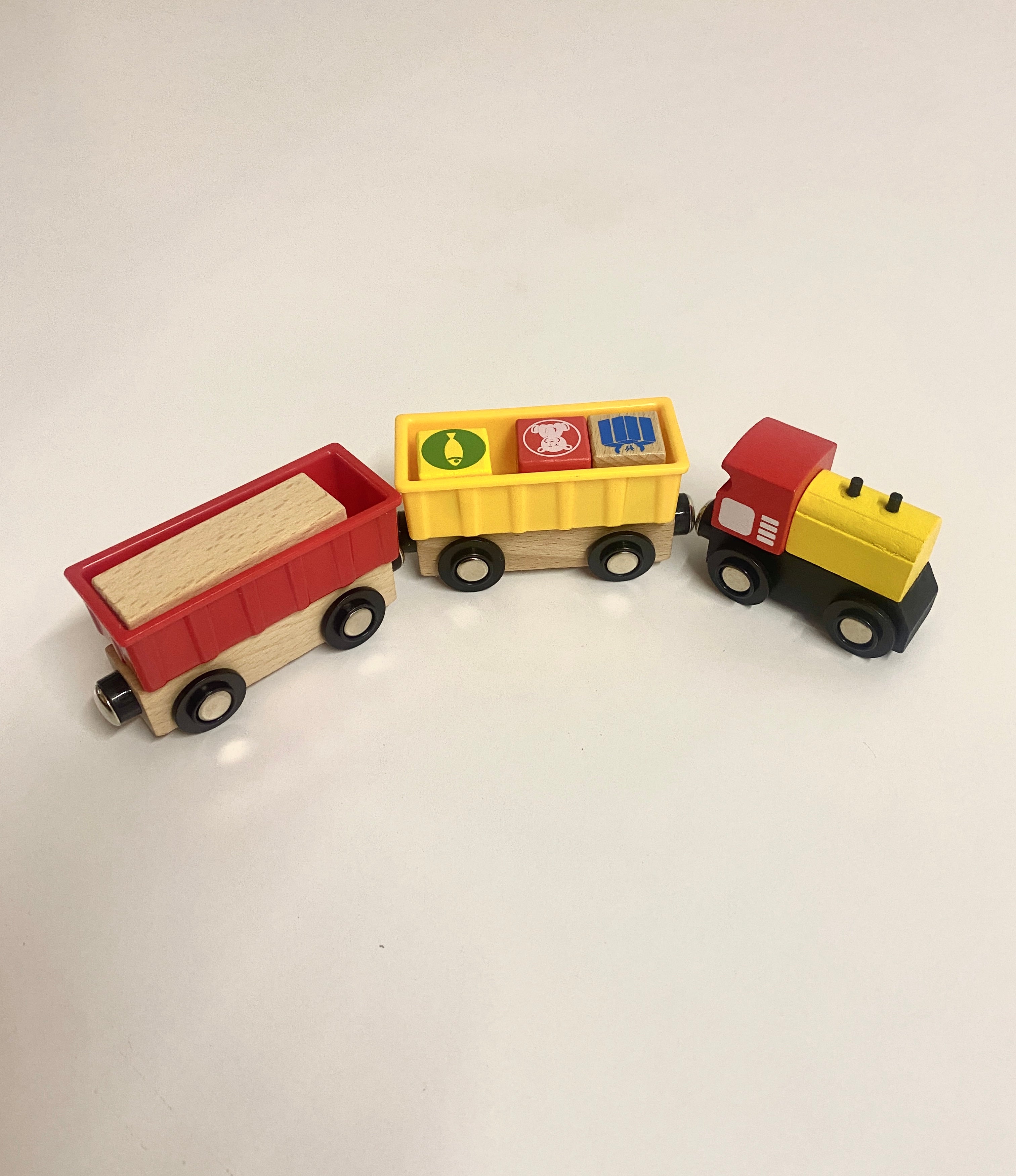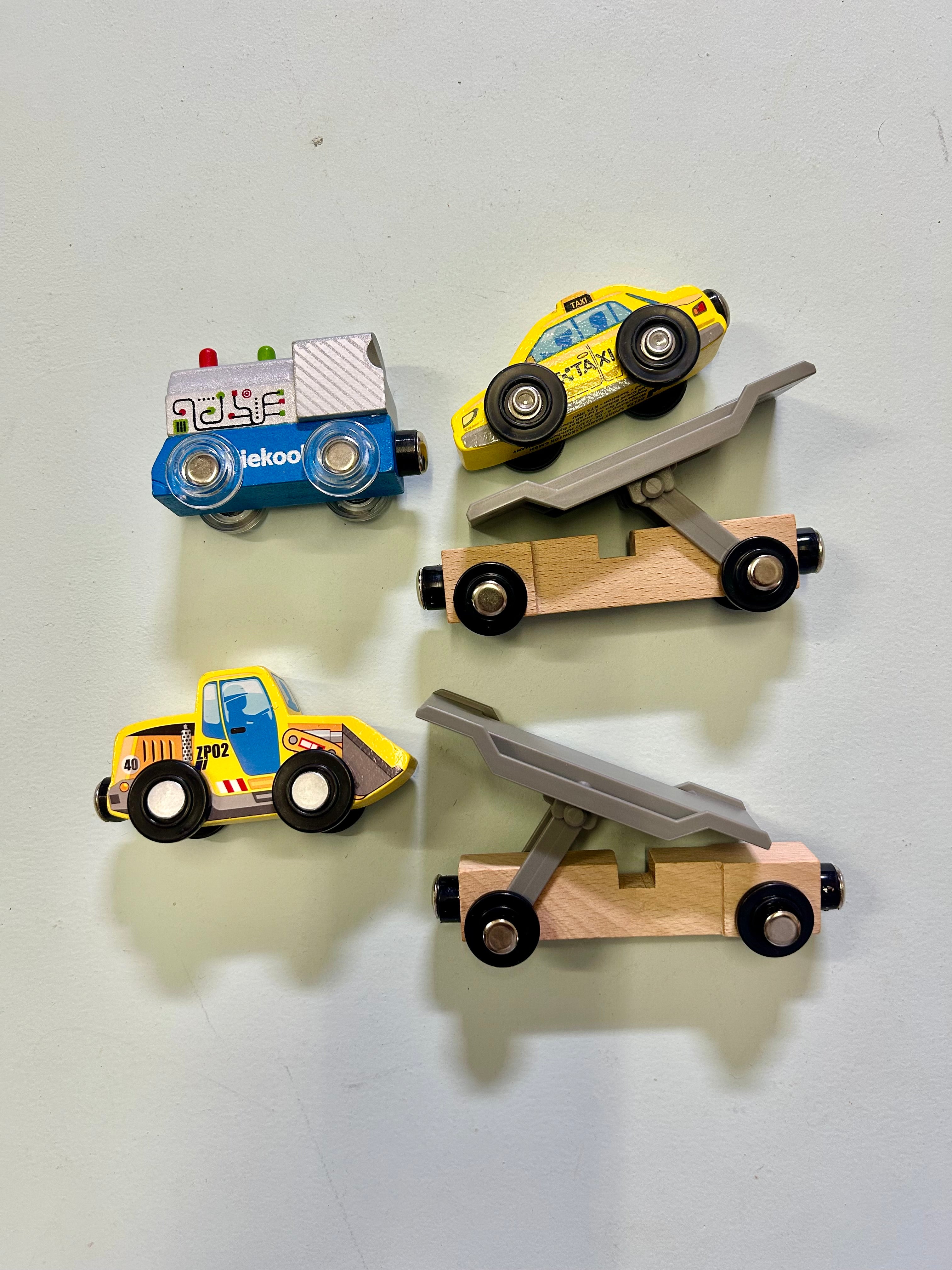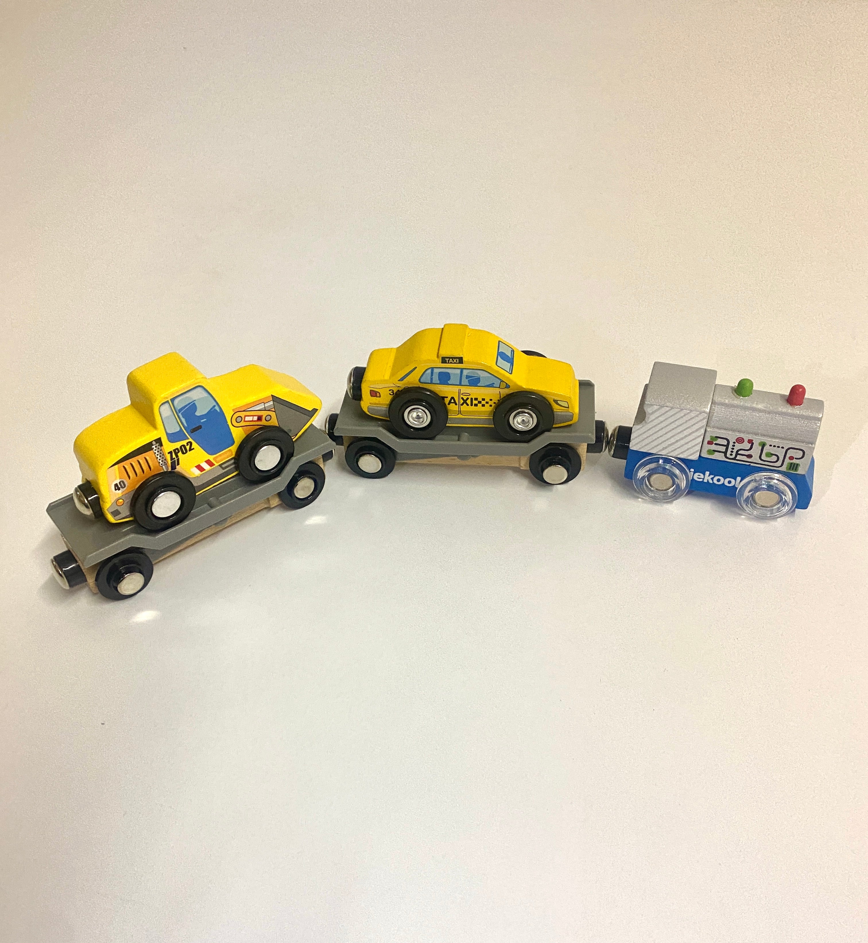 - Iekool Train with Taxi & Diggerloader (Front of train: 7.5cm x 5cm, 2 x carriages: 11cm x 5.5cm)