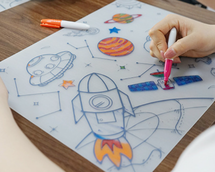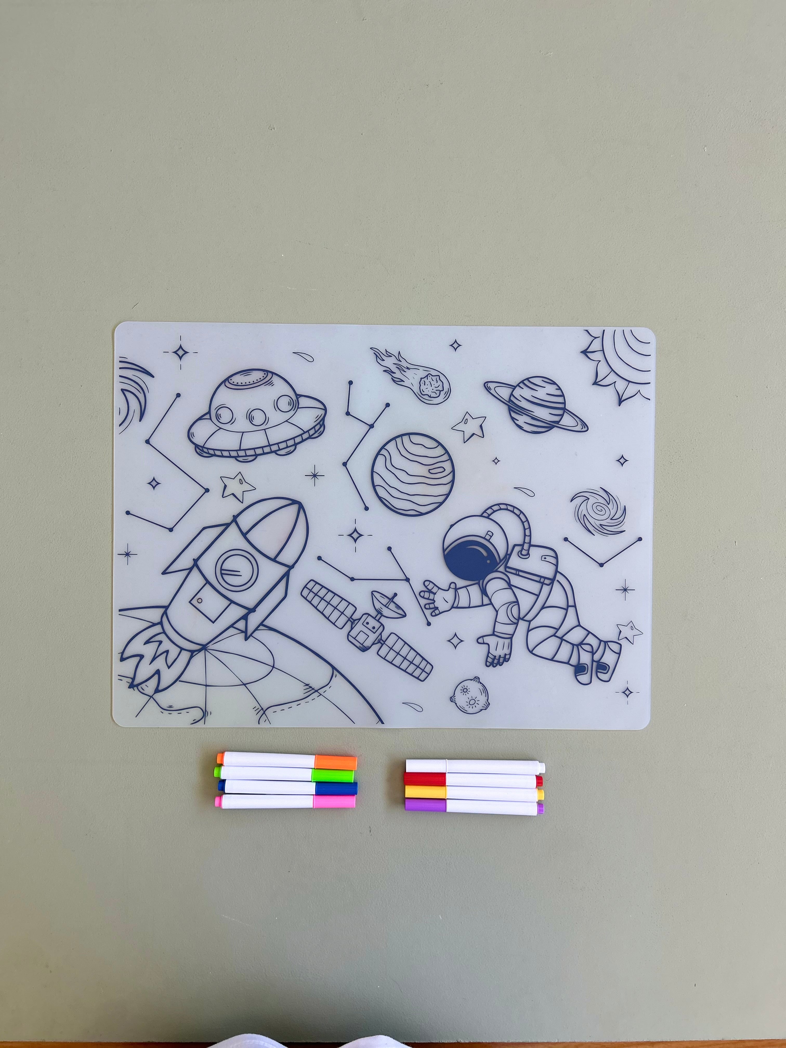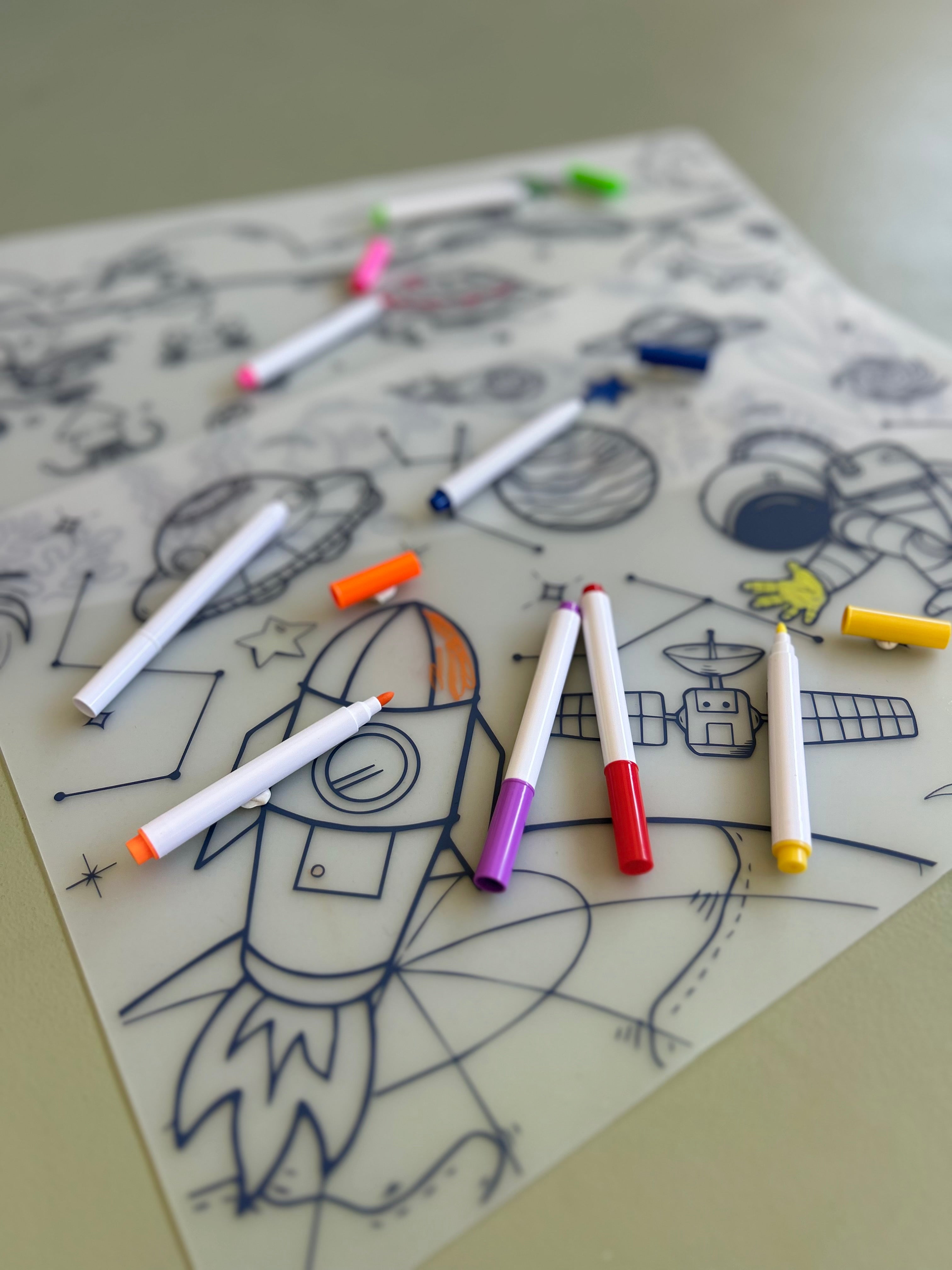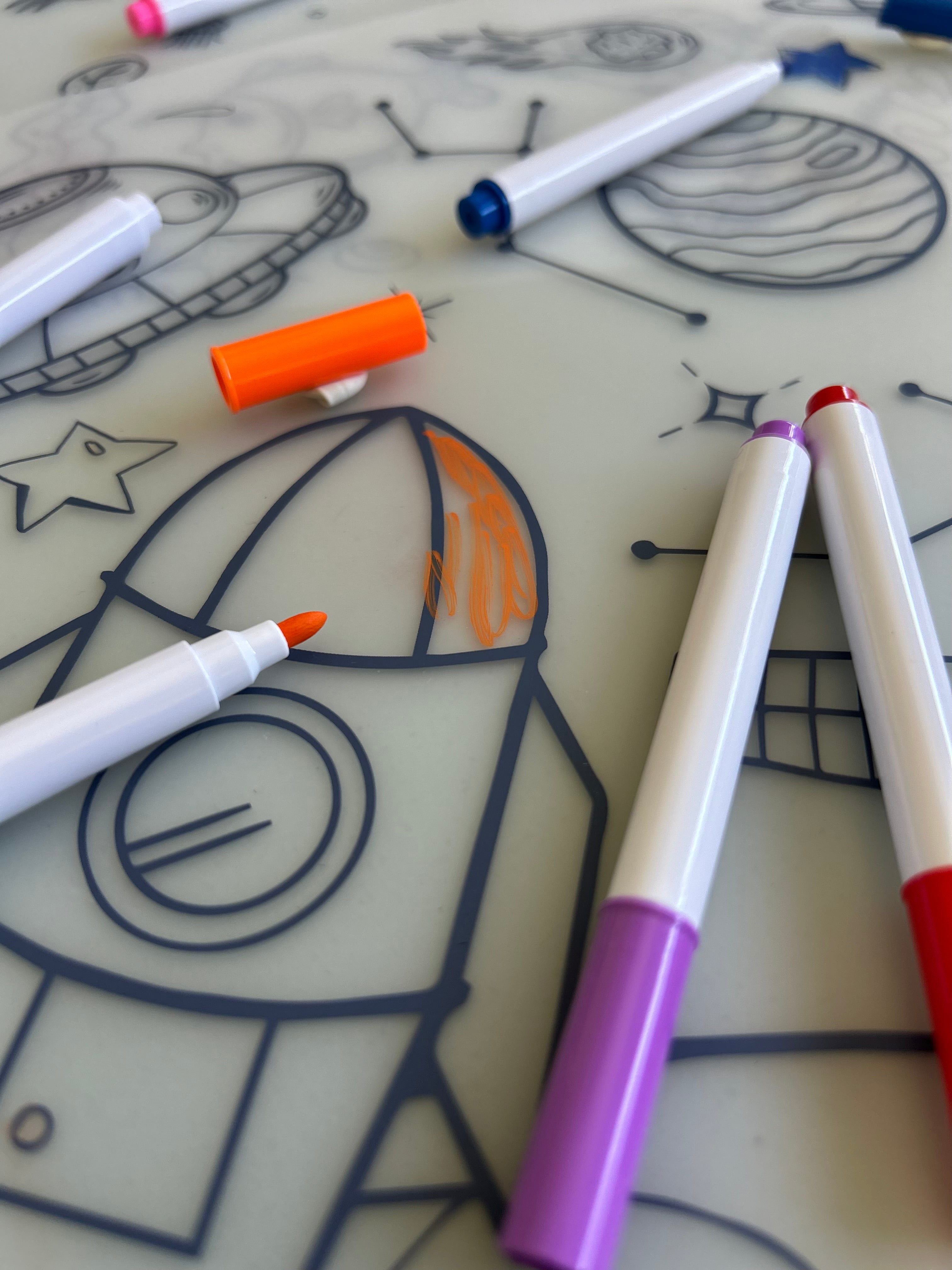Silicone colouring mats are a fantastic travel companion for kids! These mats are designed for easy colouring and wiping, making them reusable and mess-free. Each set includes 8 vinyl coloring pens, allowing children to color, decorate, and create to their heart's content. Once they're done, simply wash the mat clean and it's ready for the next adventure. These mats are perfect for keeping kids entertained in restaurants, on planes, or while waiting for meals to be served. They offer a fun and creative way to pass the time, ensuring that kids stay engaged and happy wherever they go.