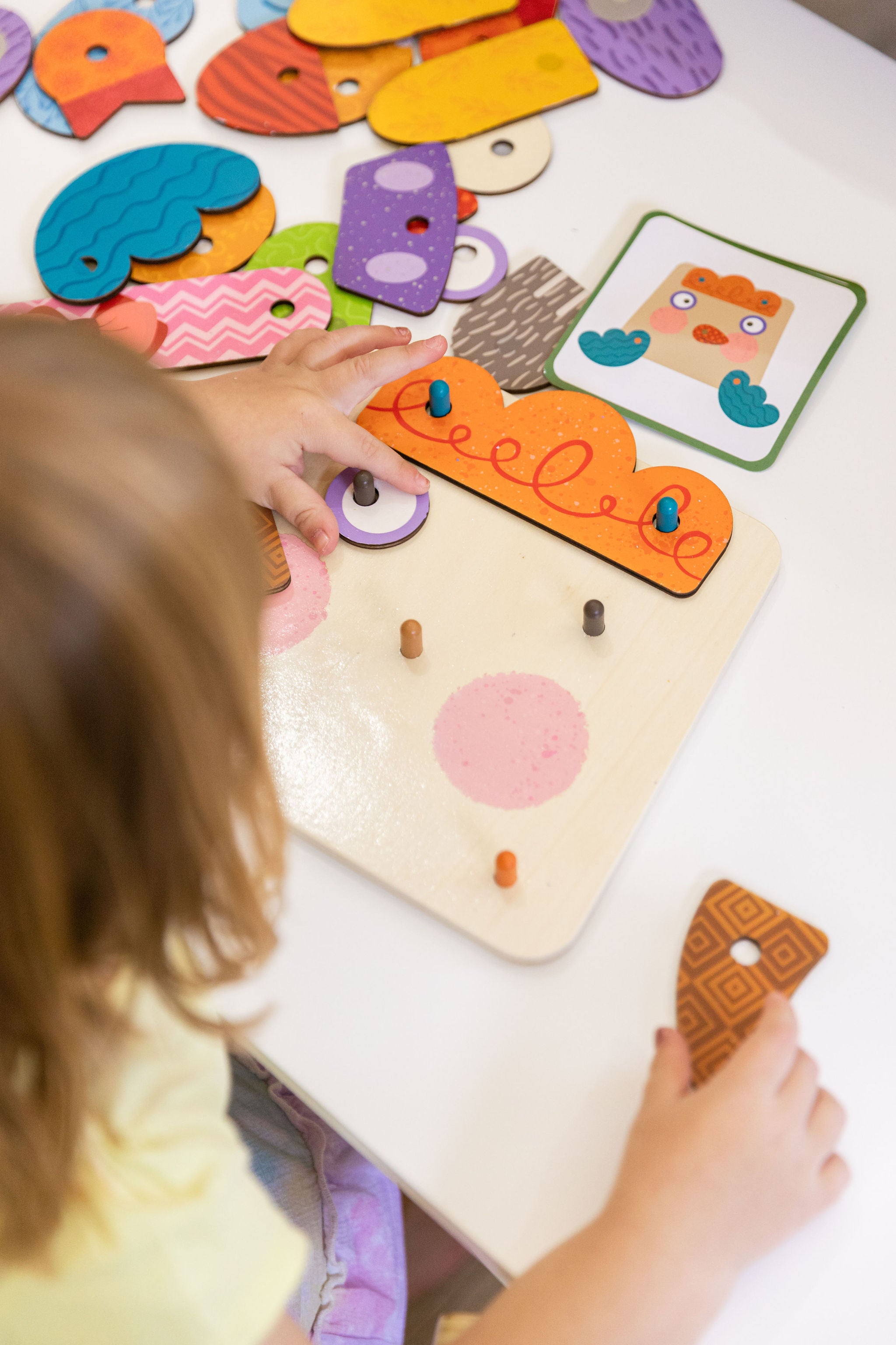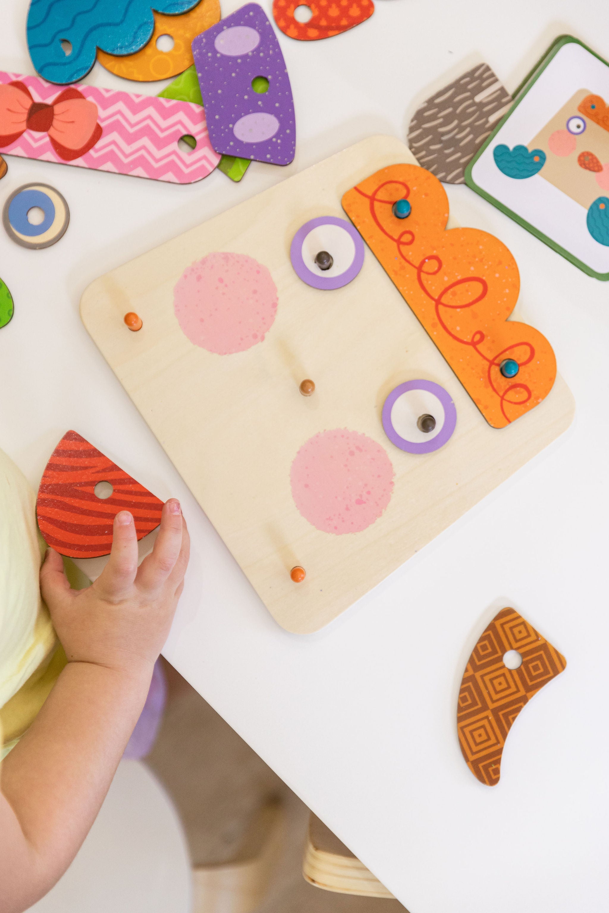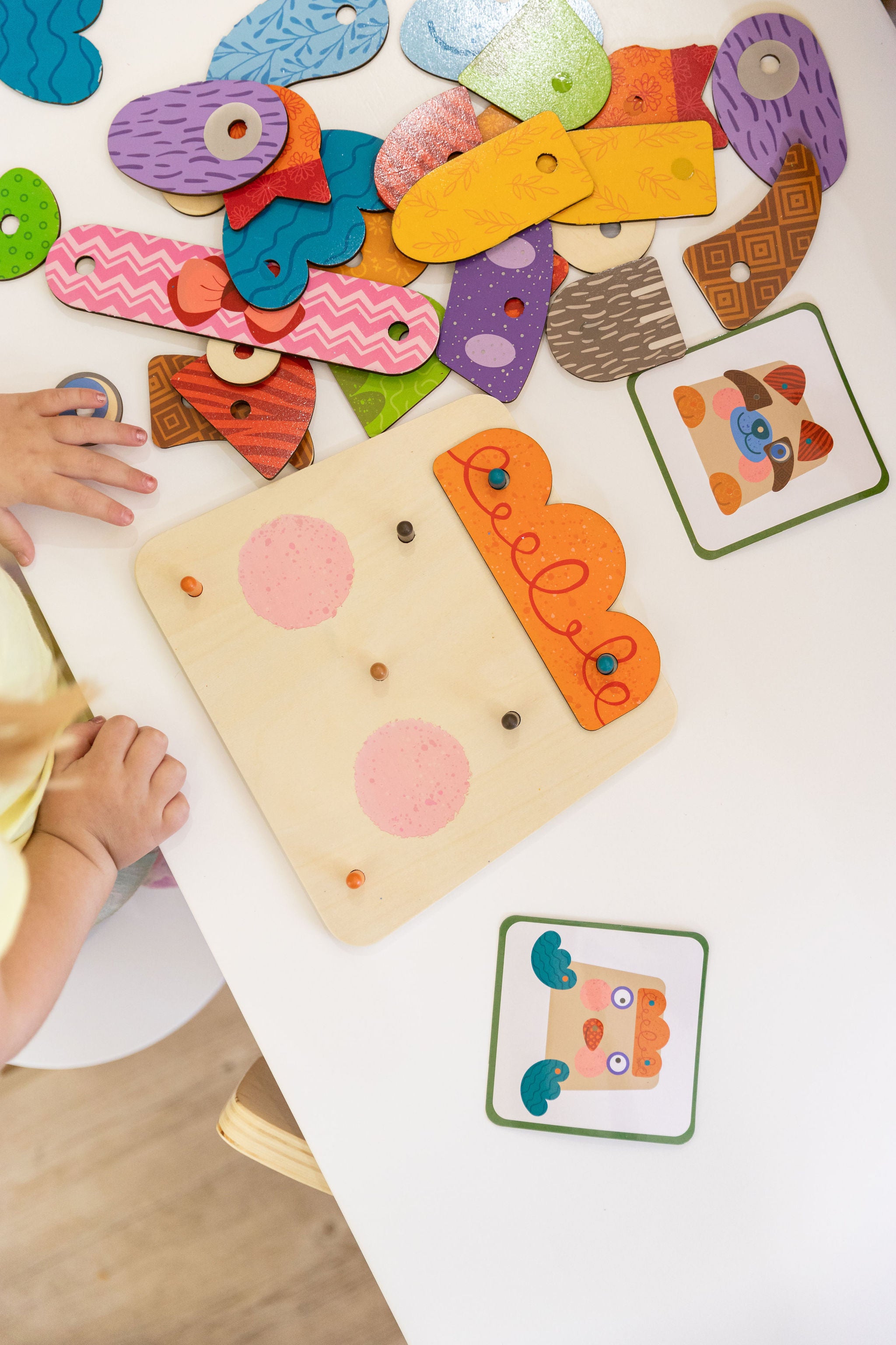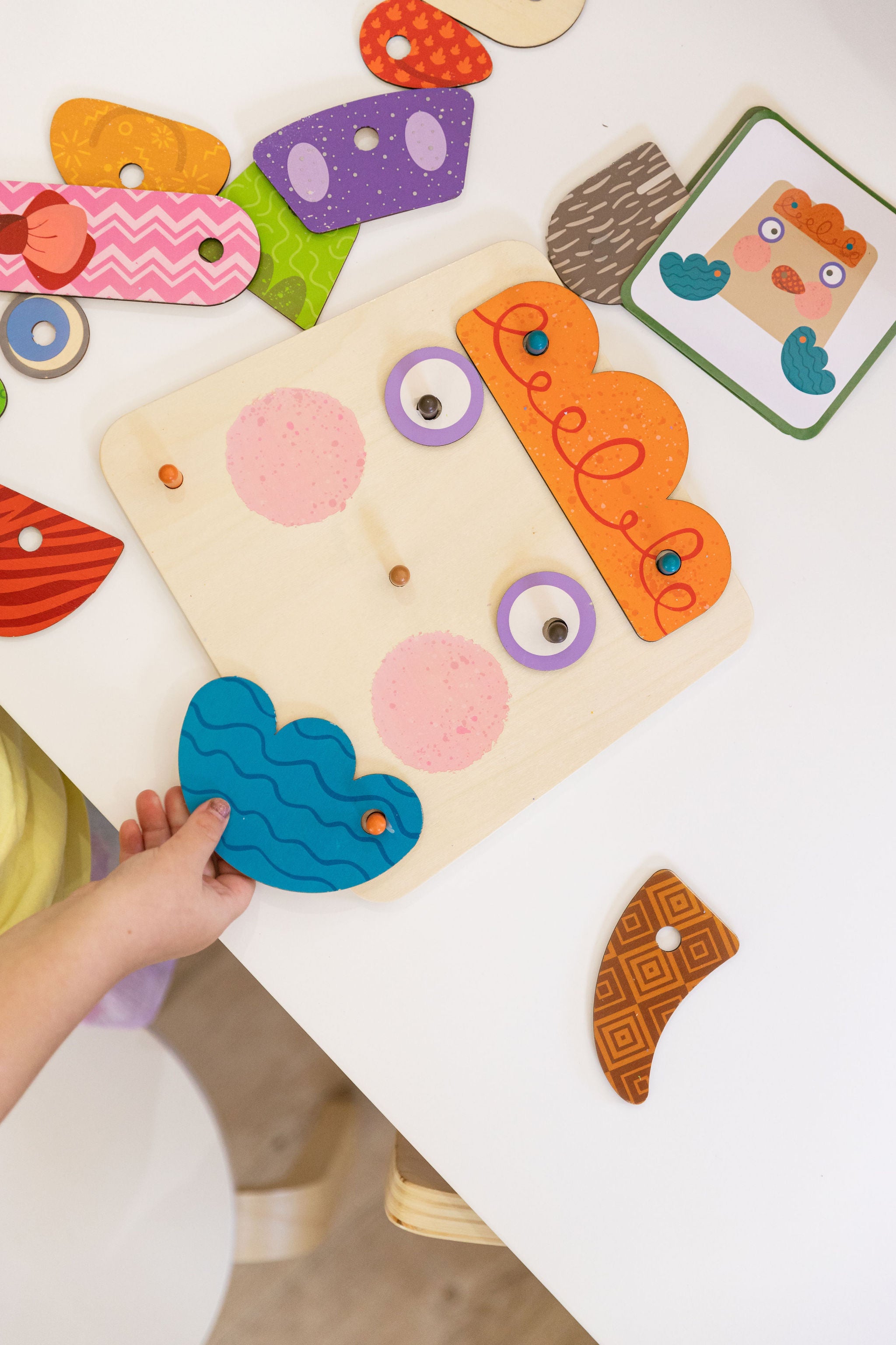Everyone loves making silly faces and with this Funny Faces Puzzle, kids can build them, talk about them, and explore emotions through play. Using the wooden face pieces and patterned cards, children can copy the examples or invent completely unique characters. It's a delightful mix of fine motor work, visual discrimination, and creative expression that feels more like fun than practice.
