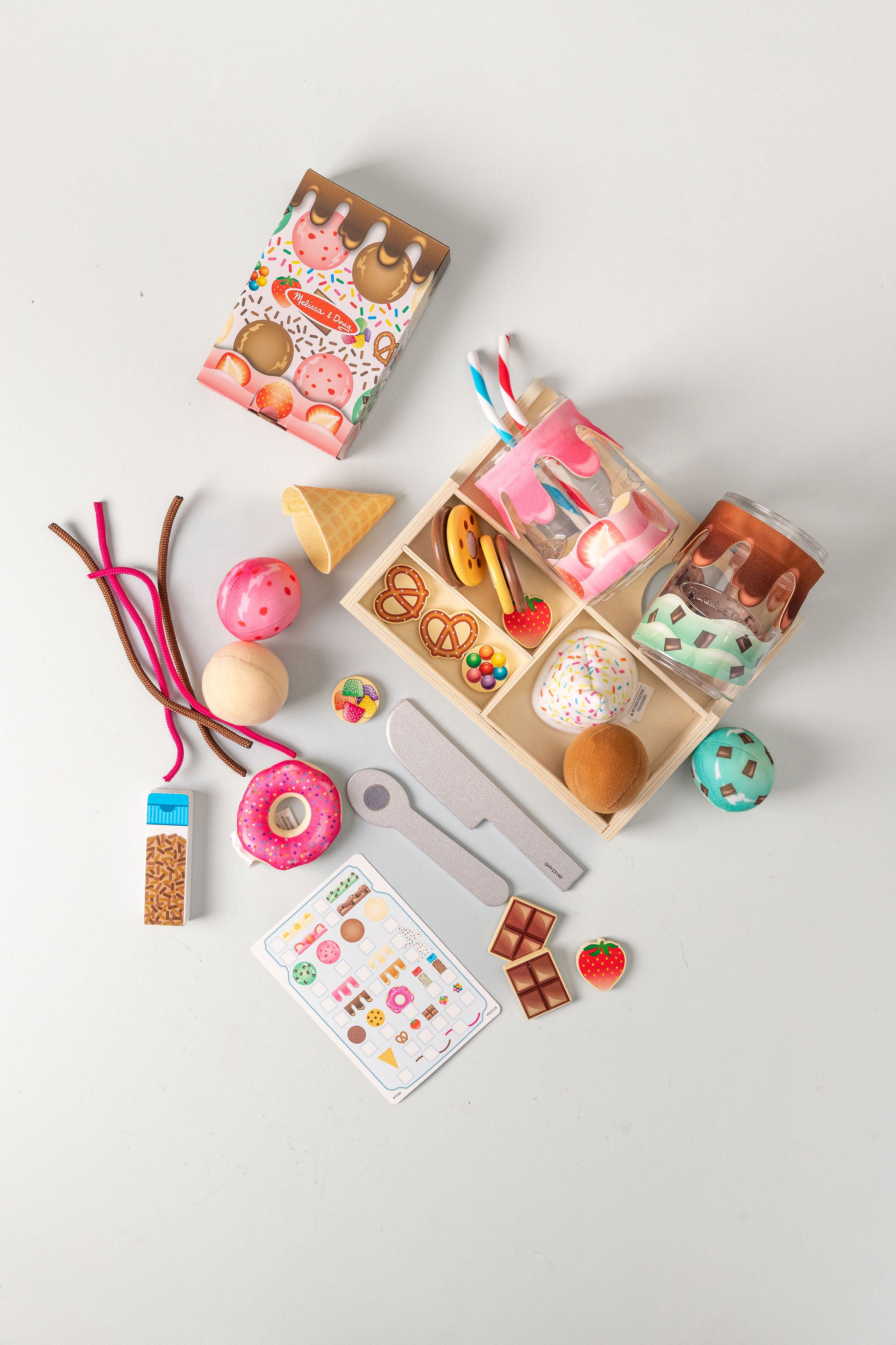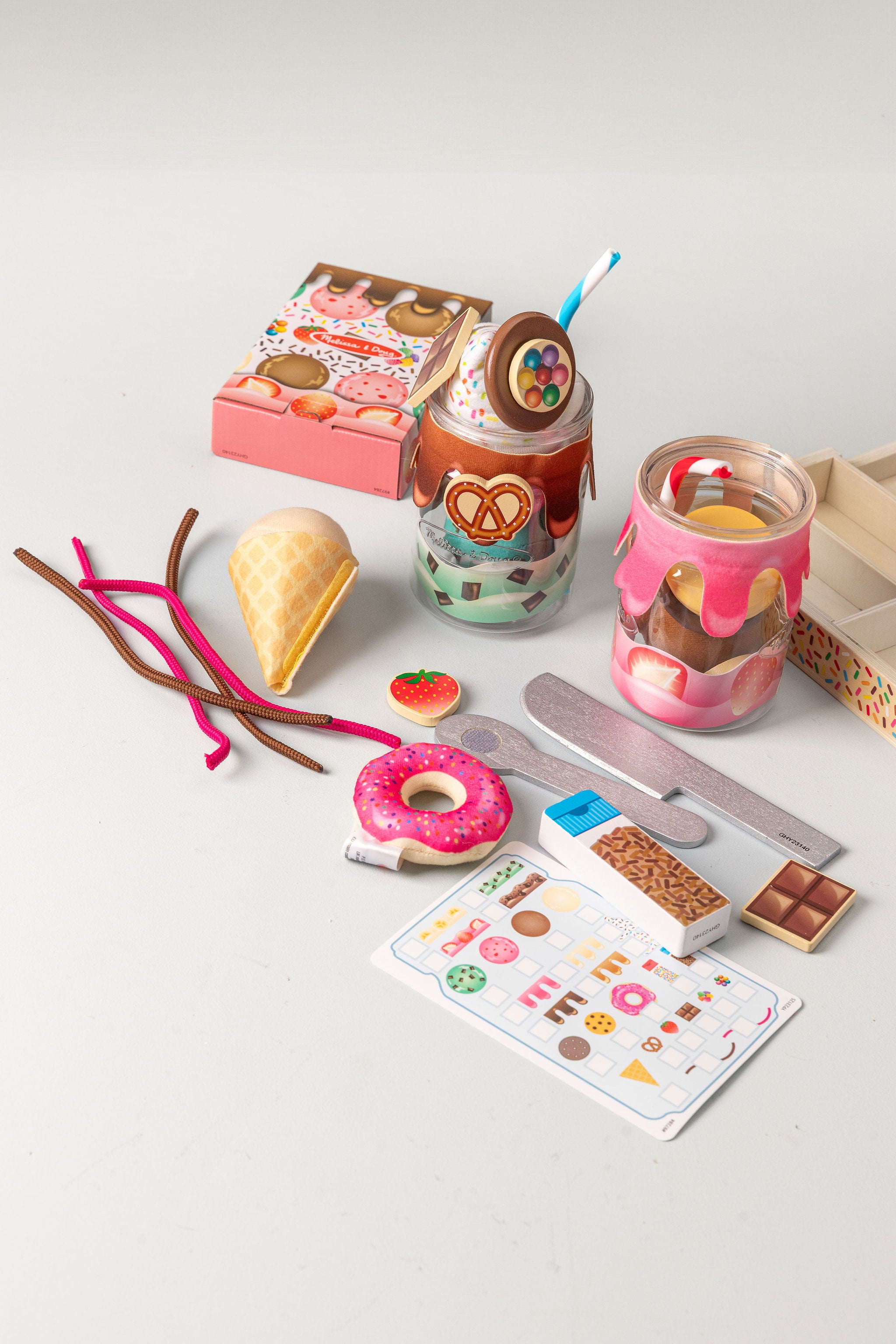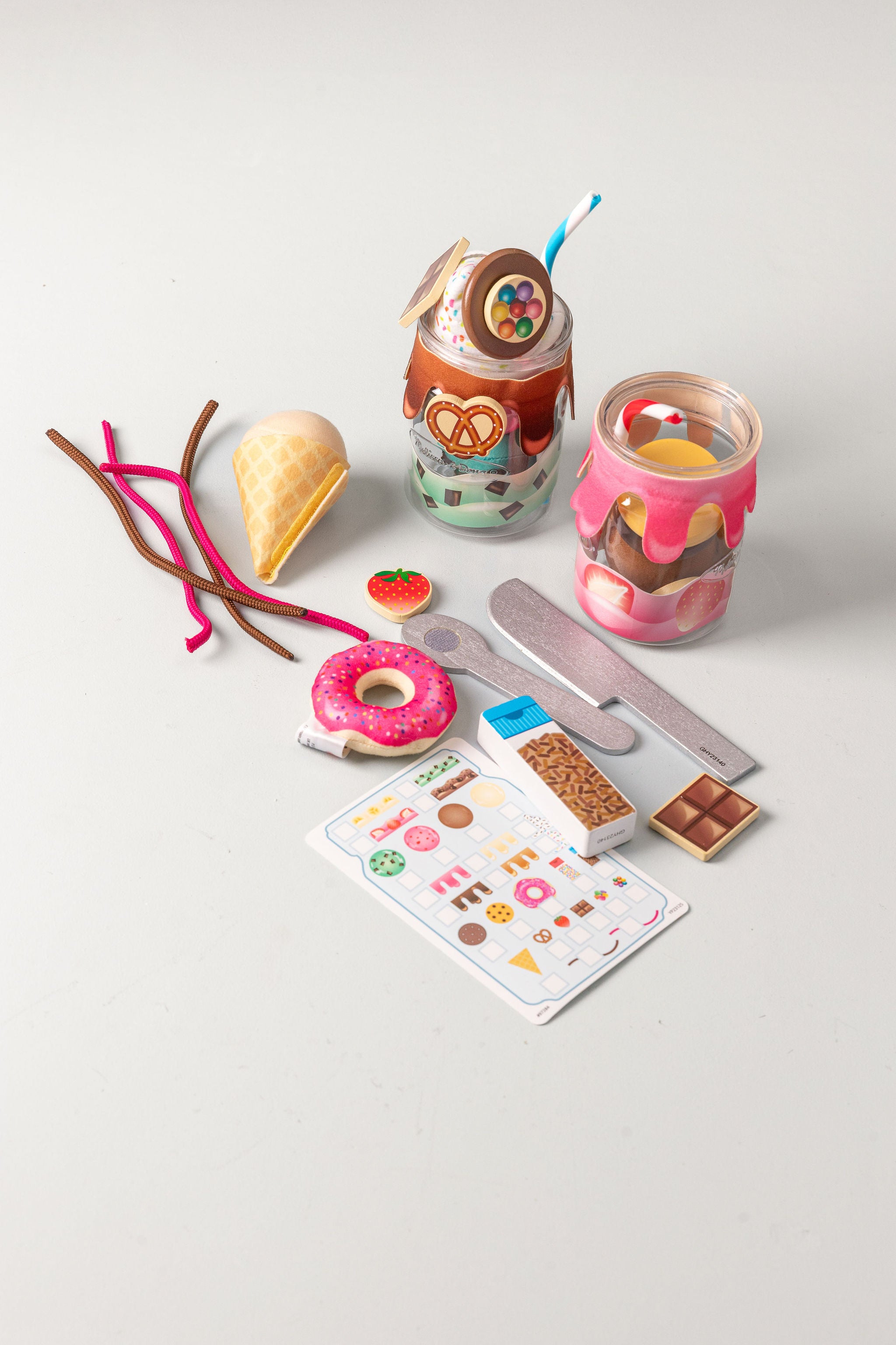 The deliciously realistic milkshake bottle toy combines soft desserts and wood with layers of ingredients for a mix. Put the ice cream in. Soft ice cream spoon Swirl Cord Sauce And top the dessert sticks with soft whipped cream, waffle cones, or donuts. Then attach the “”drip”” cheesecloth sauce to the self-adhesive strip on the bottle for an amazingly cool treat.