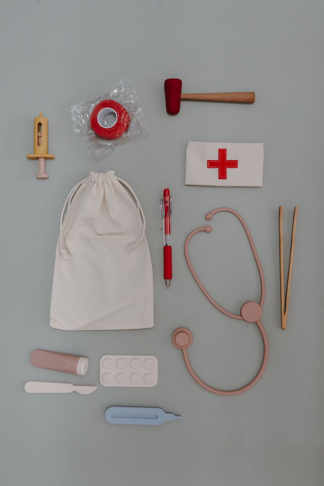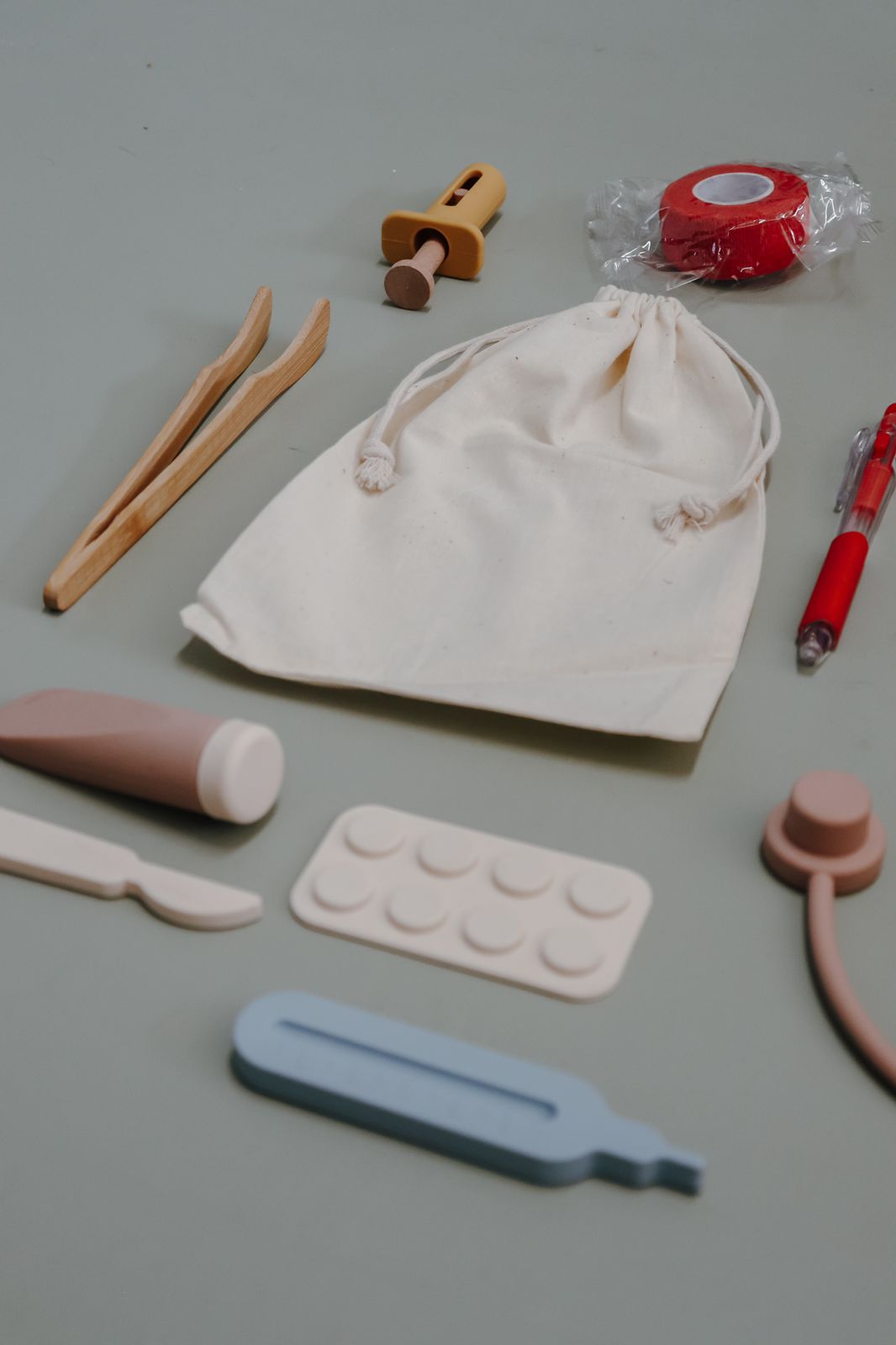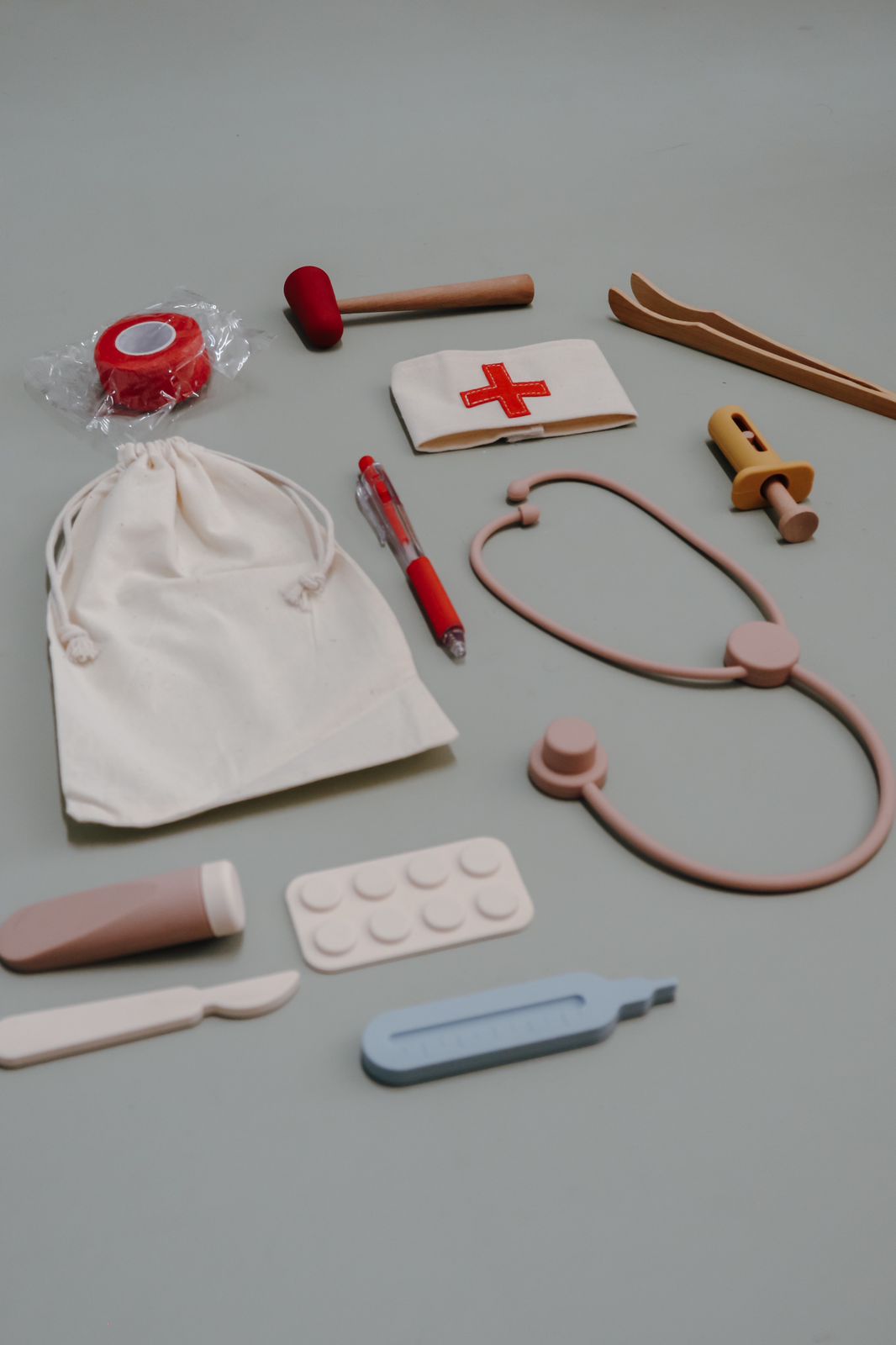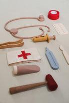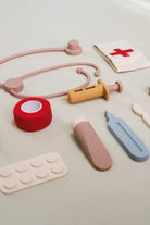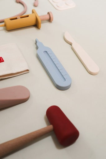Play doctor anywhere with the most versatile and practical Doctor Play Set made of 100% silicone. All 6 pieces are perfect for tiny hands and can even be played with in the water! A combination of food grade silicone and natural wood makes this set irresistible.