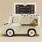 Crafted from FSC®-certified wood, this vintage-style Café Van is painted in a delightful pistachio green and white and features intricate artwork on all sides. The flip-opening roof reveals a coffee and tea menu display board, while the front-opening service hatch allows little baristas to serve their customers with ease. Complete with a coffee mug and croissant on a serving tray, this set encourages creative role play.