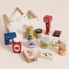 Perfect for pretend play, counting and developing language skills, this set comes with a basket and 12 grocery items, plus a barcode scanner, all made from FSC™-certified wood. Groceries include butter, honey, cookies, cereal, ketchup, olive oil, chocolate, tea, sweet corn, baby food, spaghetti and tuna.