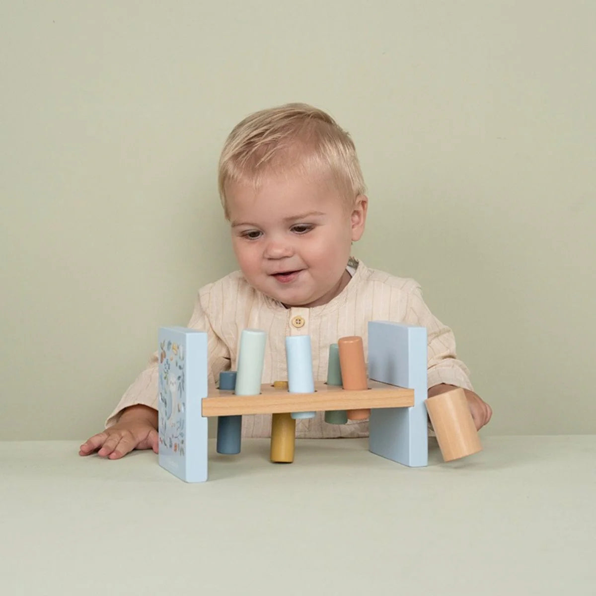 Tap tap tap! Use the mallet to pound the 6 coloured pegs into the wooden pounding bench and explore the magic of Friends. Finished pounding? Turn the bench around and start again! This is a very good exercise for the development of motor skills that will surely keep your little one entertained for a while.