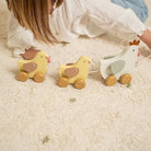 These chickens like to go on an adventure with you through the house. Pull the string and go on an adventure together! These pull-along toys are made of durable wood. It encourages your child to walk and helps with motor development.