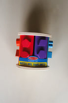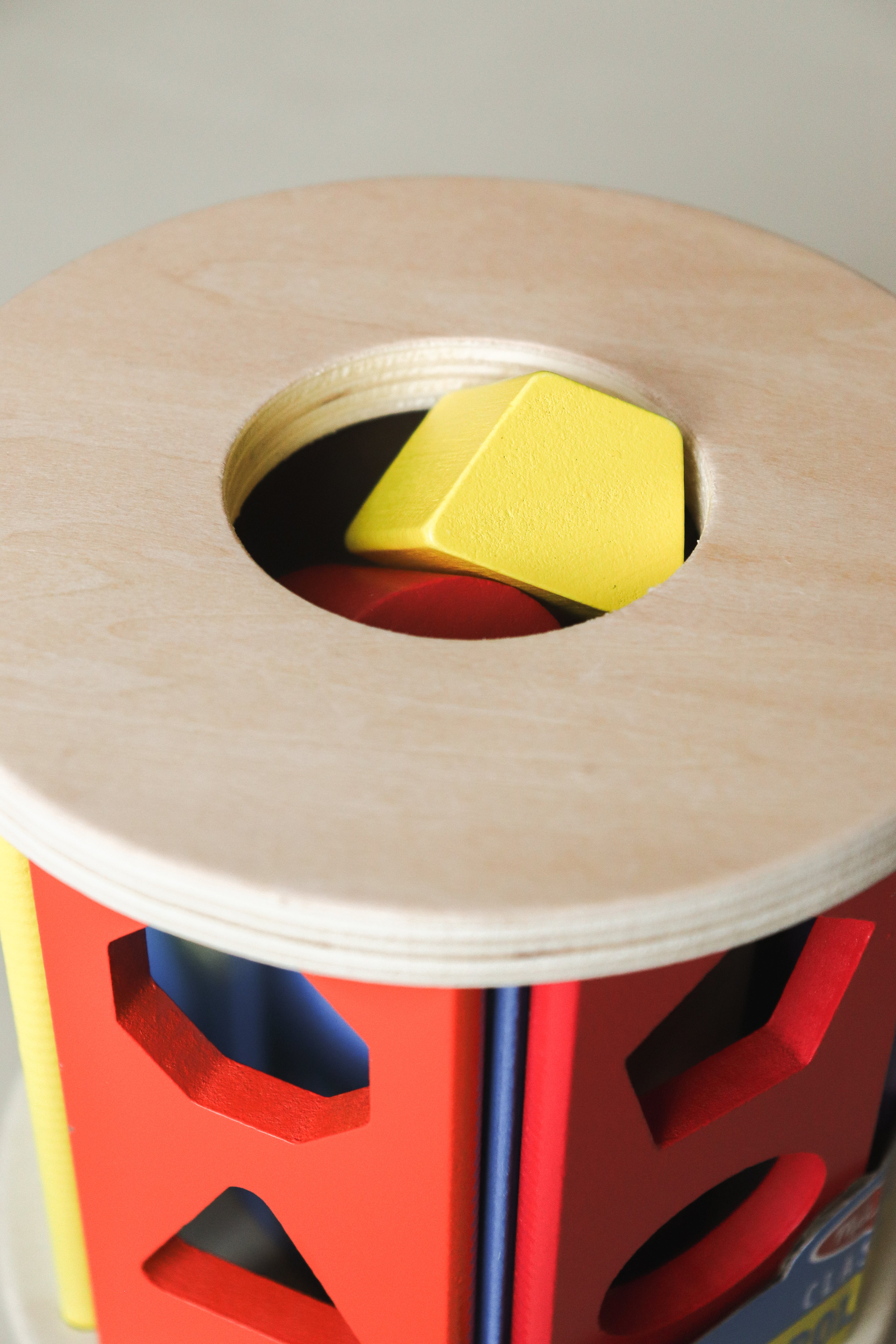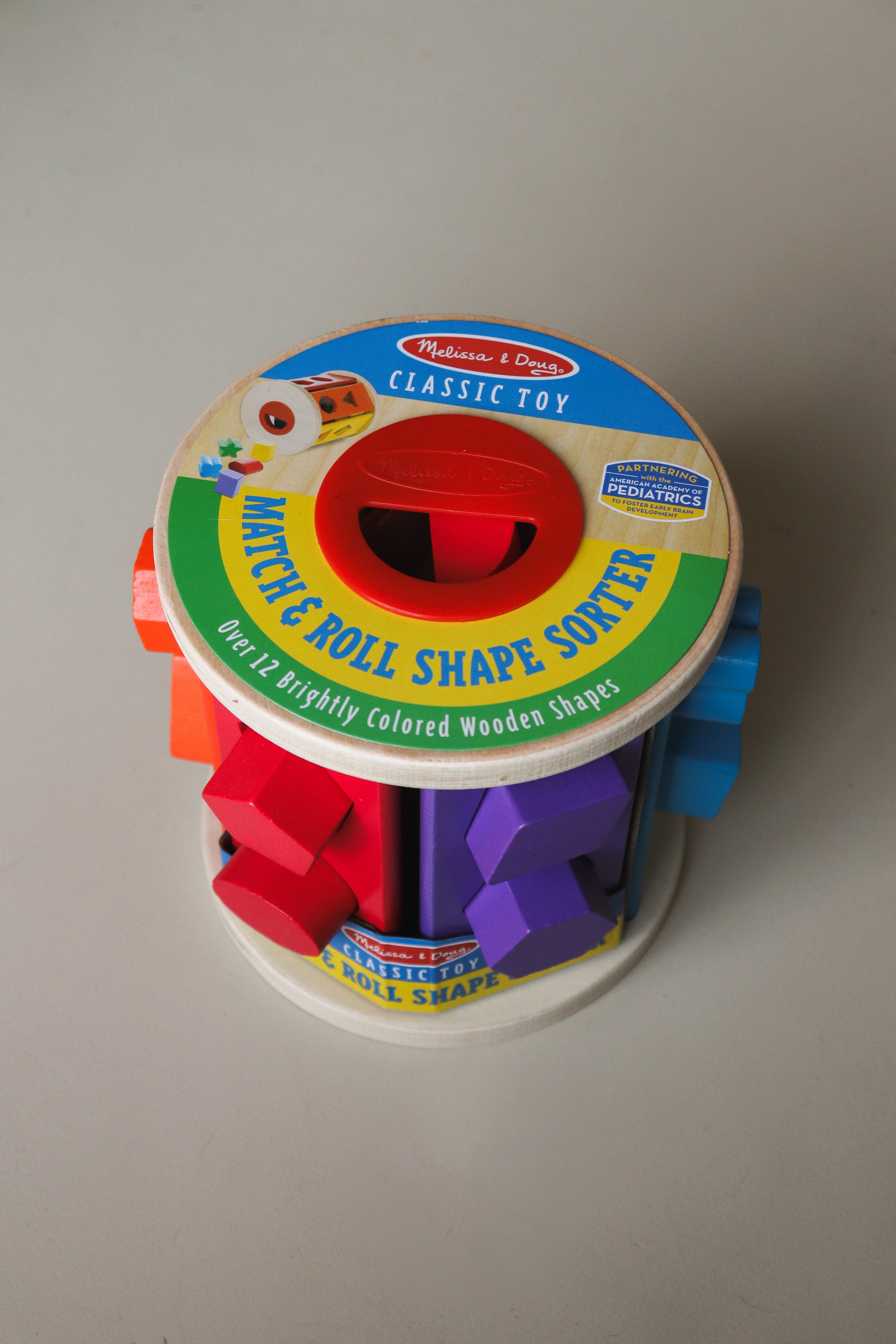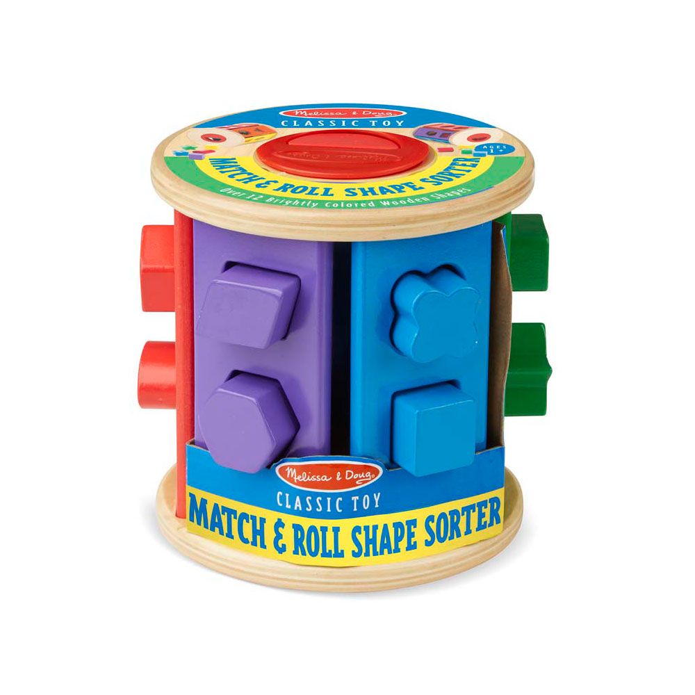 This brightly colored wooden shape sorter is an exciting update on a classic toy! Toddlers can drop the dozen-plus vibrant wooden shapes–including a triangle, octagon, star, rectangle, square, trapezoid, hexagon–through the color-matched holes, then roll the drum along, open the lid, and start all over again. An early-learning powerhouse that encourages color and shape recognition, manual dexterity, and more!