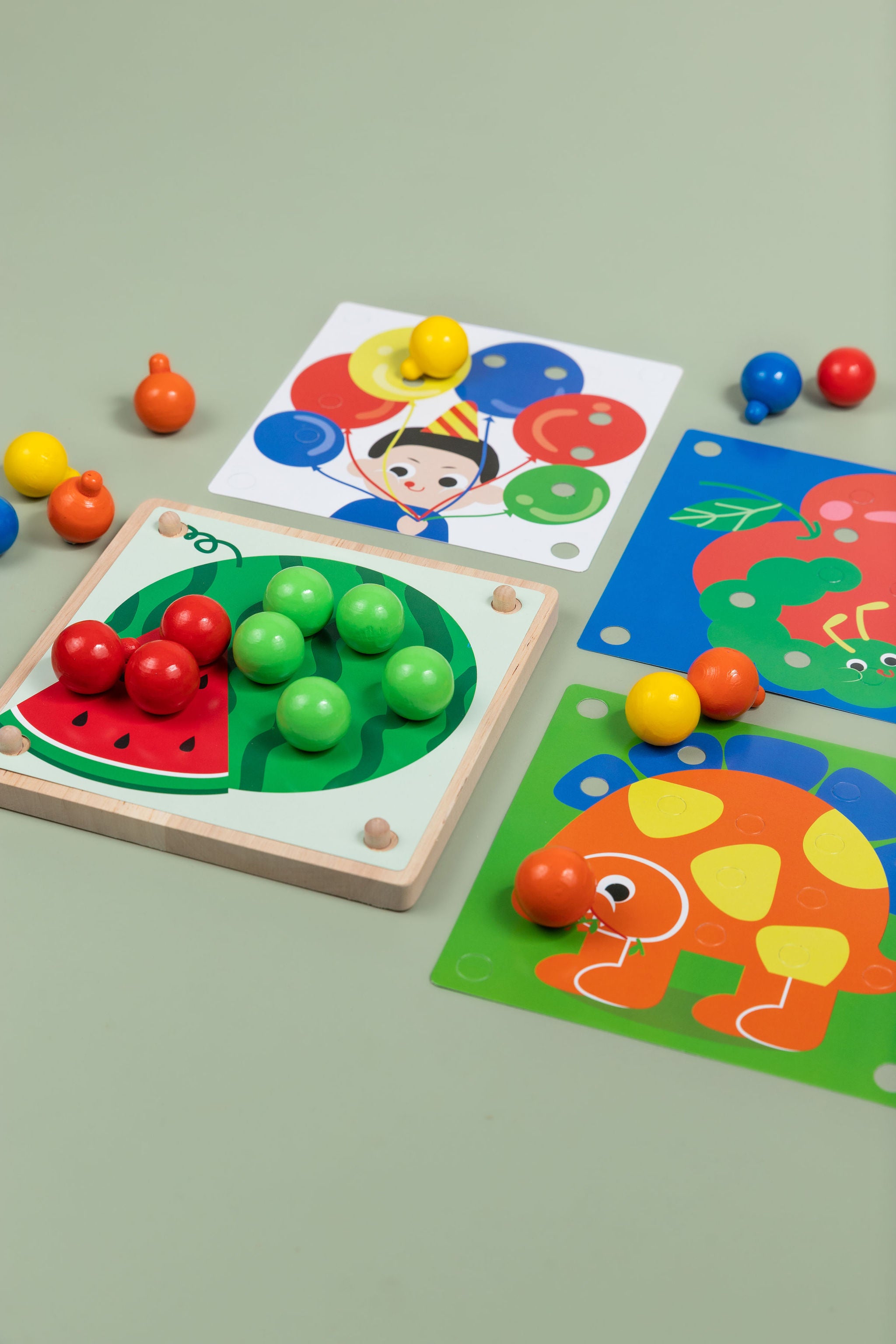 With vibrant round pegs that are chunky and easy to grab as well as playful picture cards, kids can match colours and complete the scenes by placing the pegs in the right spots.