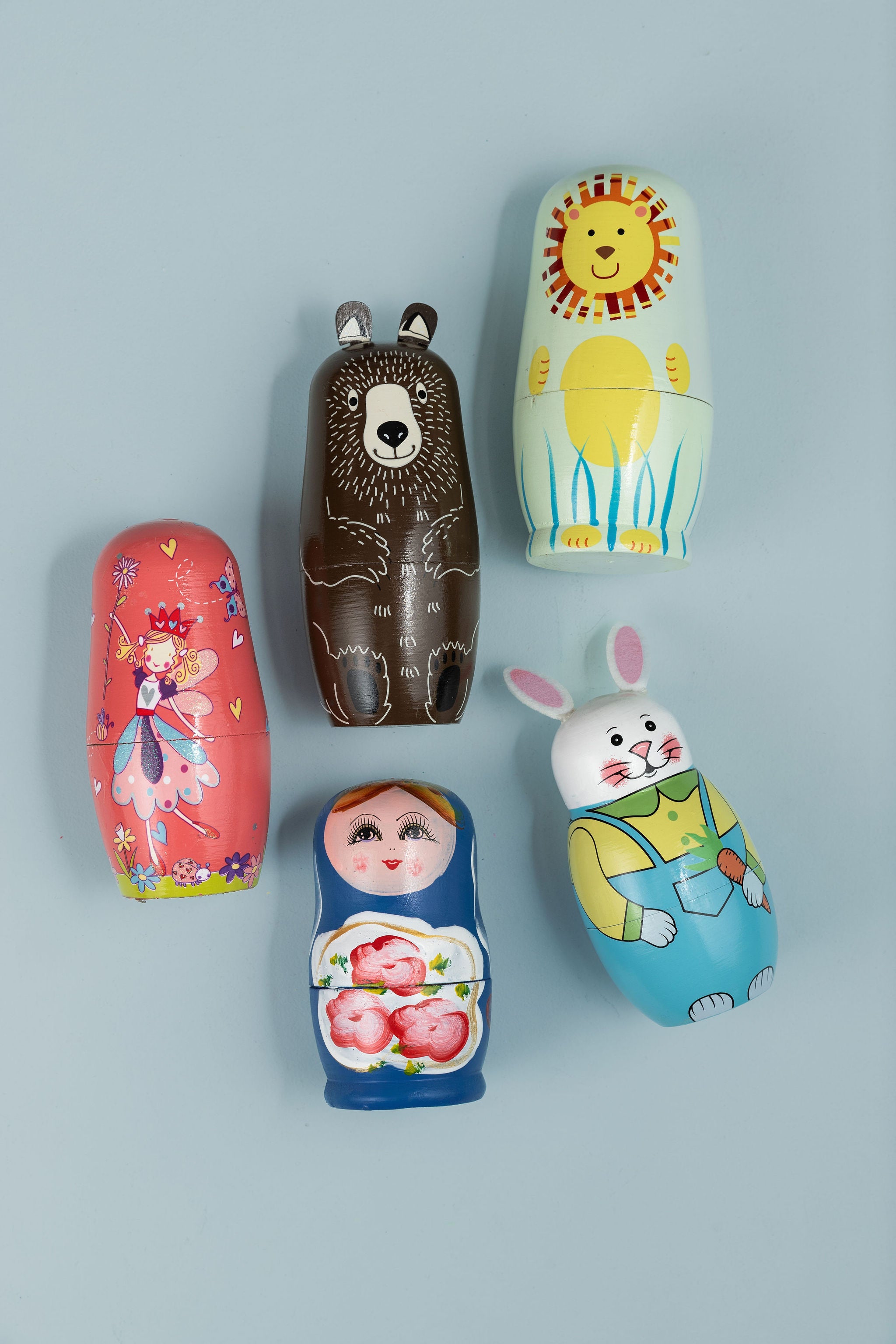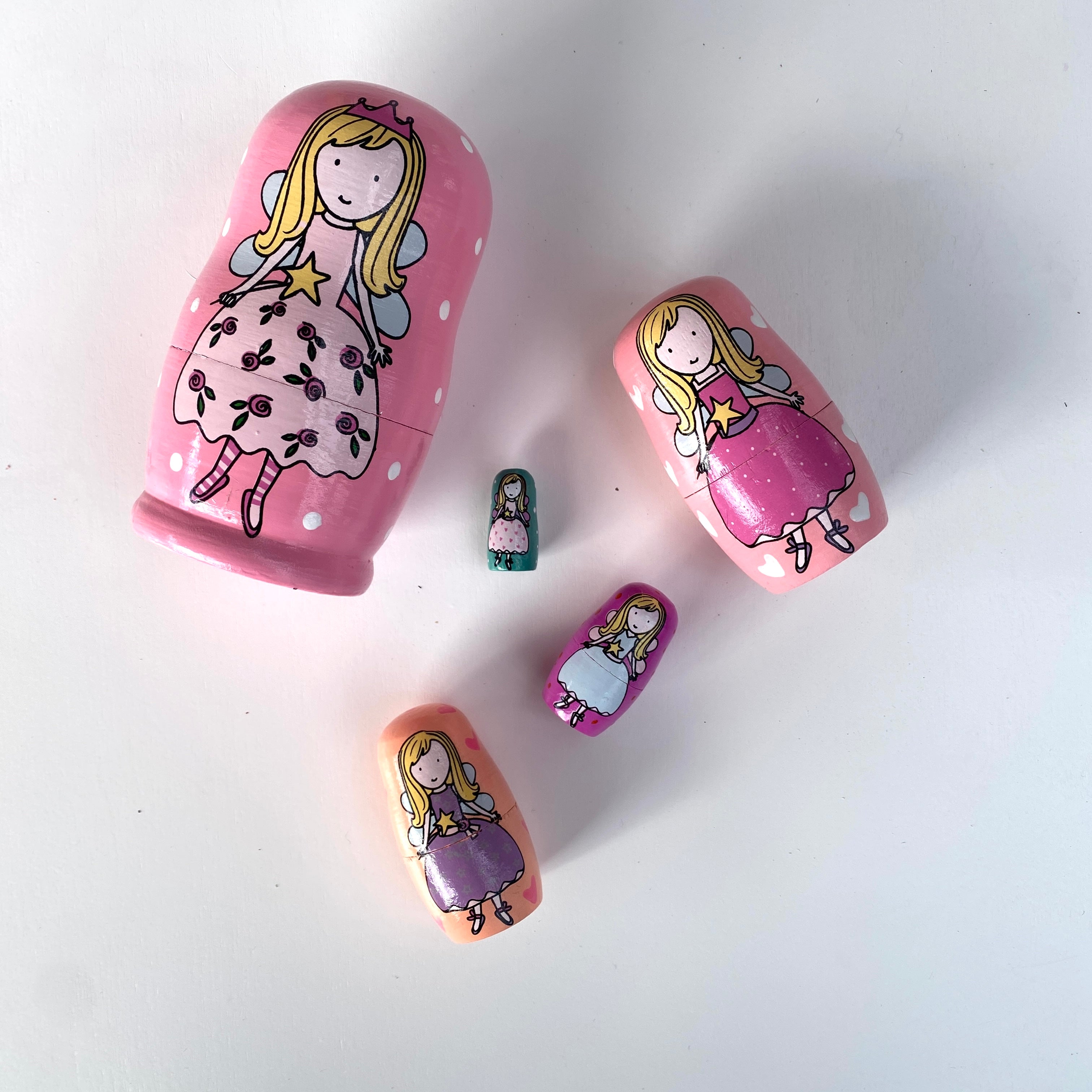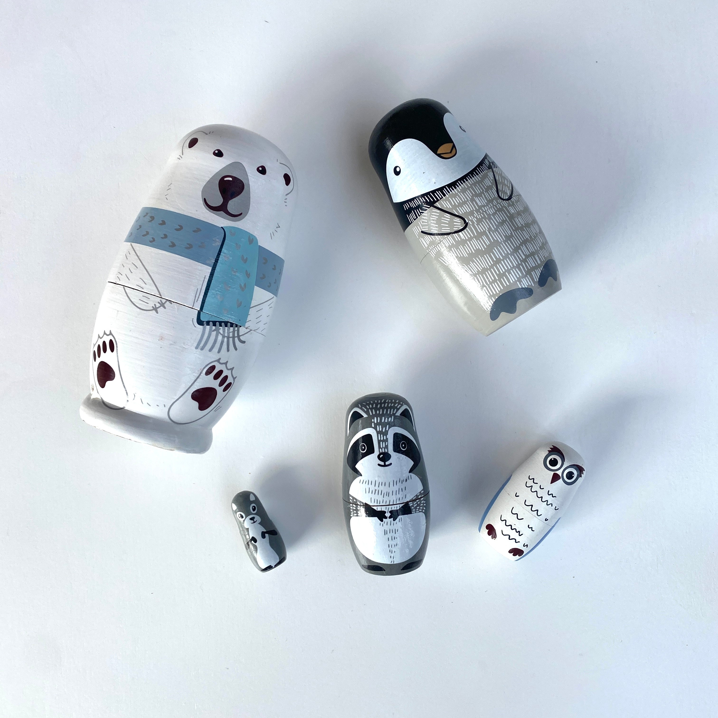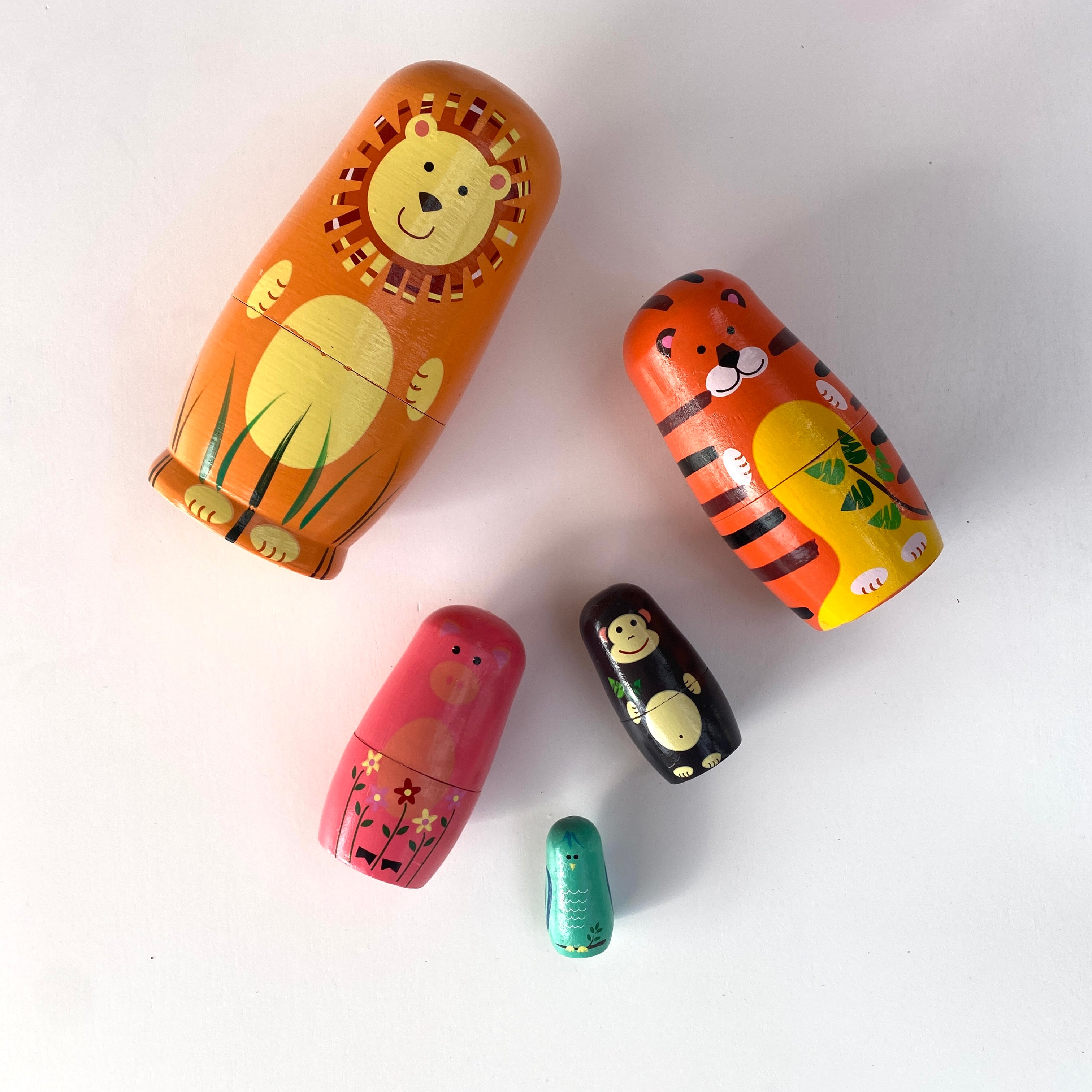 These nesting dolls are inspired by the classic matrioska concept—five beautifully designed dolls that fit neatly inside one another. Each layer reveals a new size and design, inviting children to explore order, size, and sequence through simple, hands-on play.