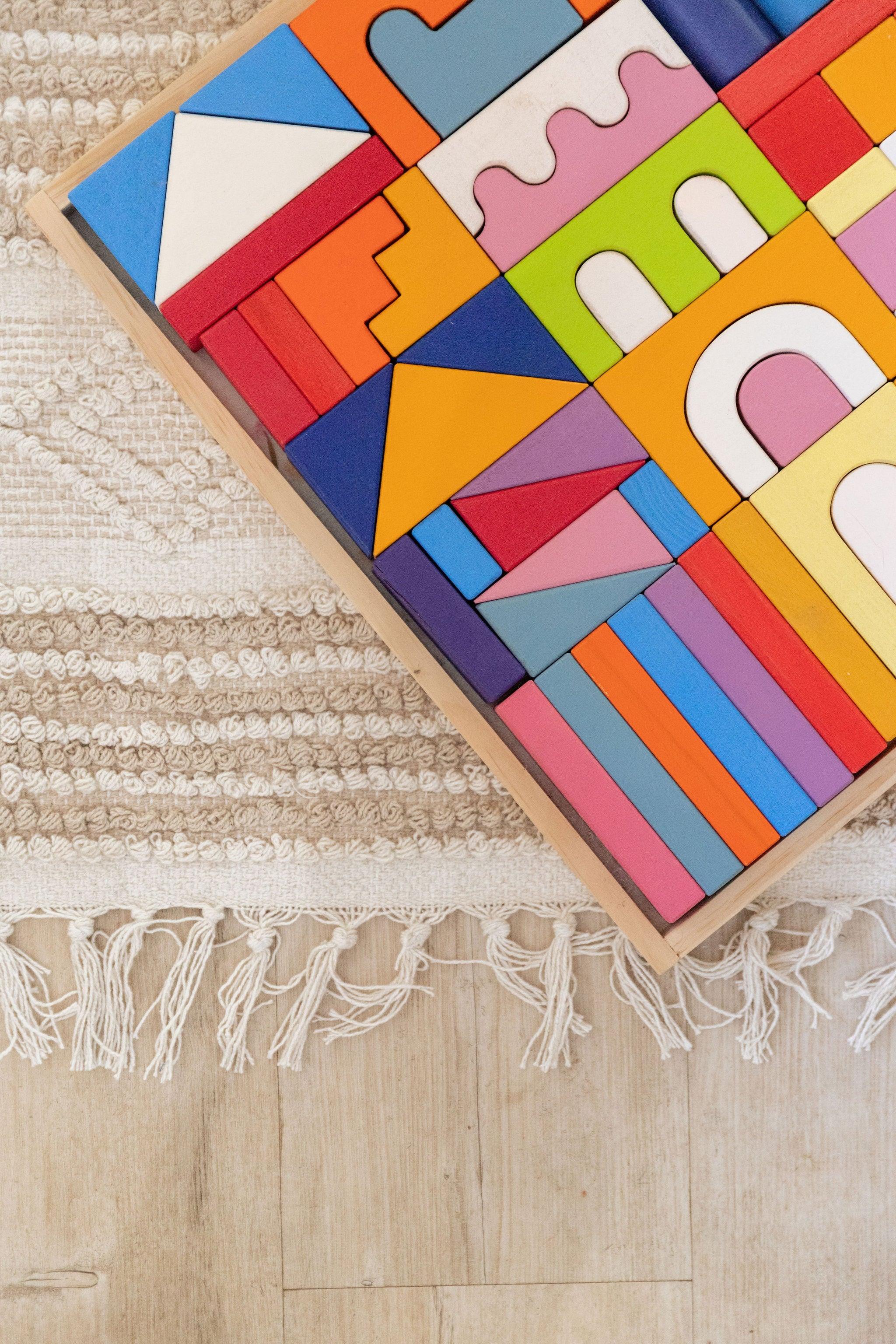 100 whopping building blocks in a wooden frame! Besides endless ways for building simple mathematical foundations in counting, these blocks also function as walls, fences, stalls as well as bricks for towers, and castles. These vibrantly colored rainblw blocks are an exciting way for children to discover more about numbers and learn the colour sequence of the rainbow! Through tactile touch, each number can be counted by feeling with the hands, they are also useful for showing fractions. Two small turquoise blocks are as high as one dark green block, and two dark green blocks are as high as one yellow block, and so on. This set makes a beautiful piece in the kids room too as it invites everyone to play. By building and playing with these blocks, children develop fine motor skills and spatial thinking skills.