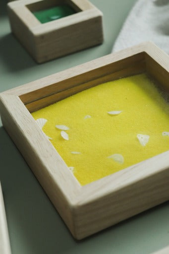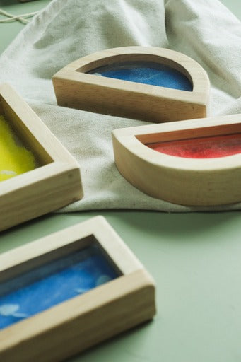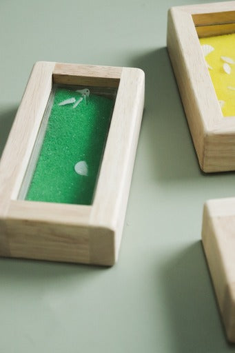 - Material: Hardwood frames with primary coloured, transparent acrylic windows and coloured sand