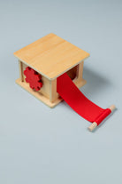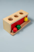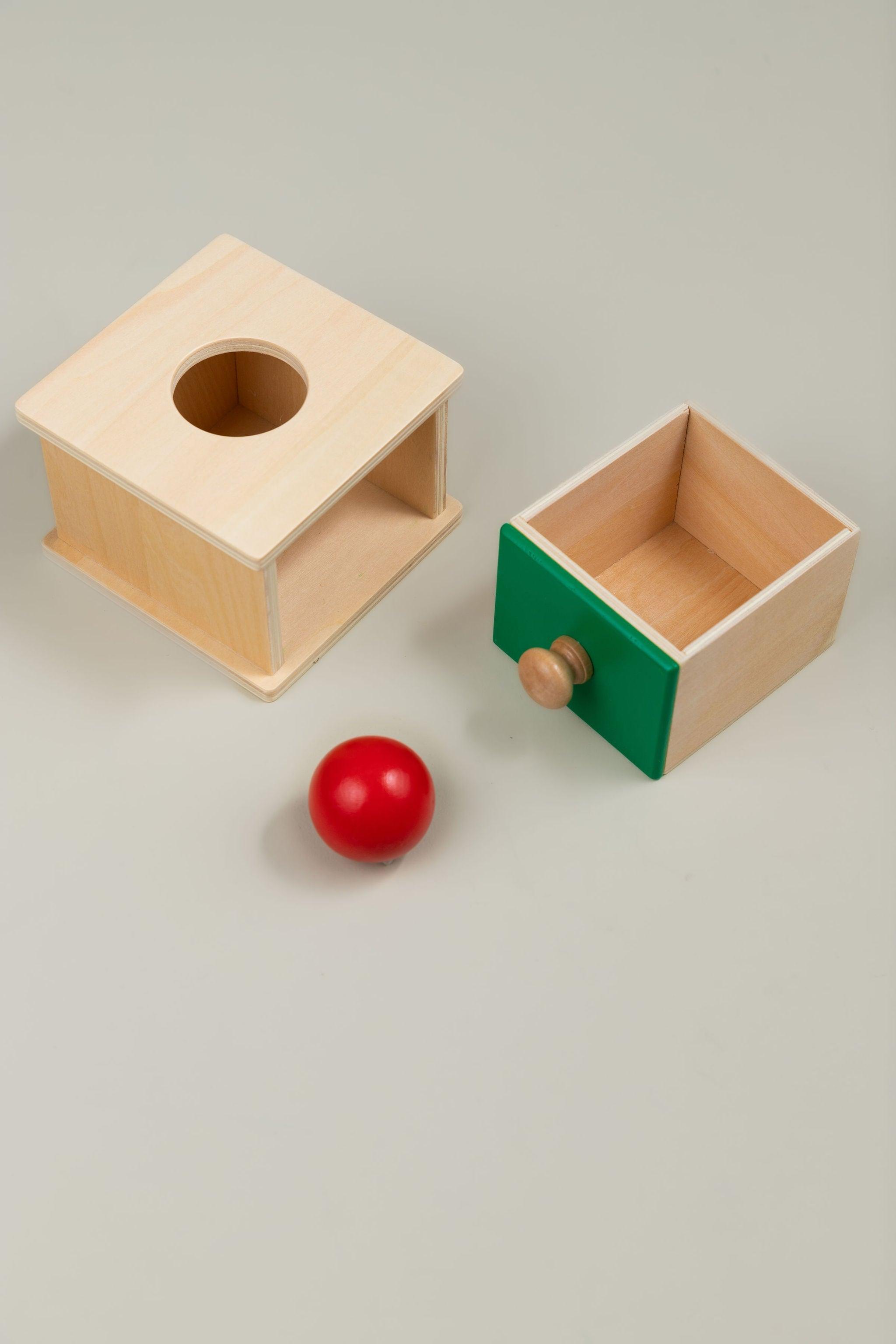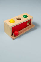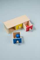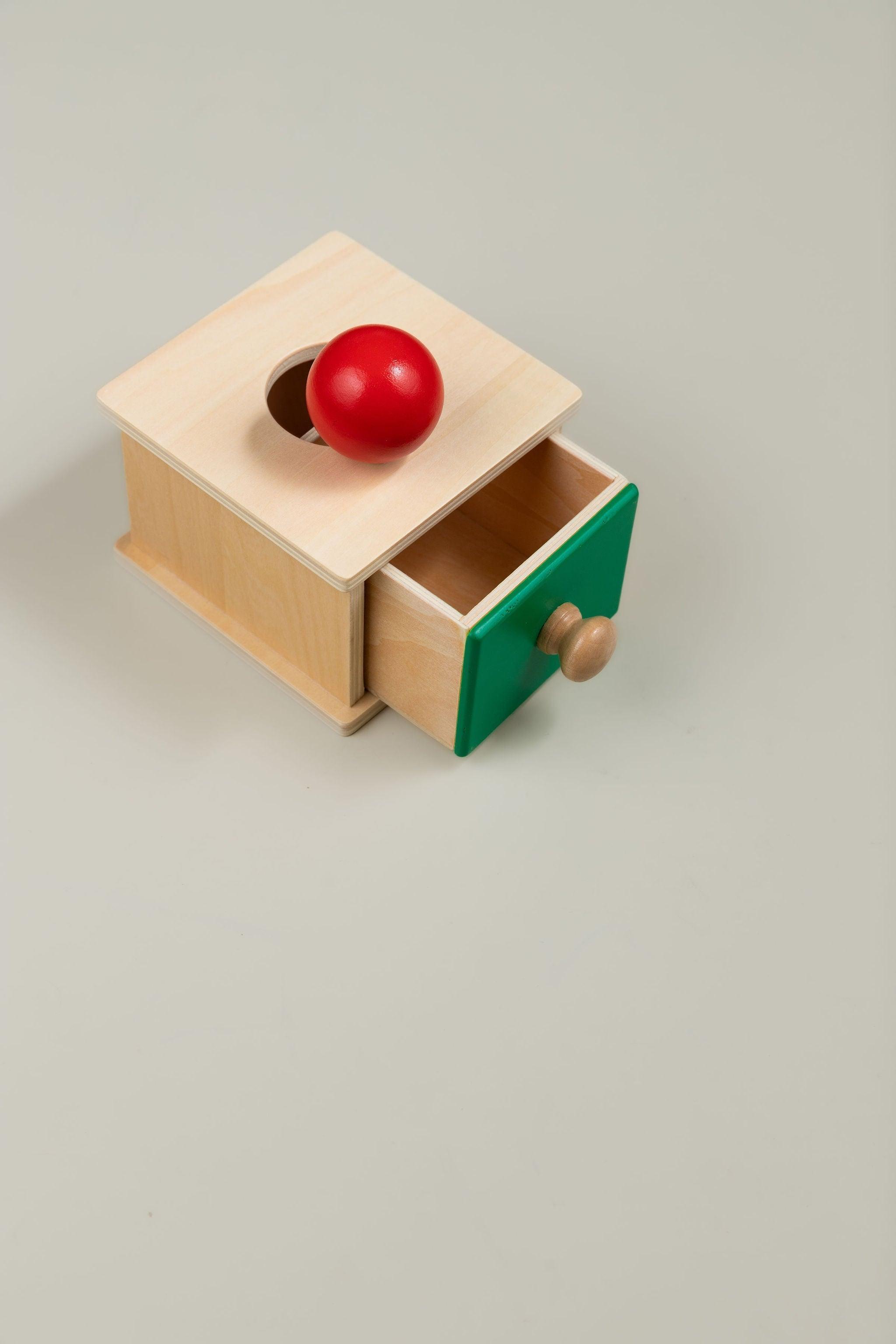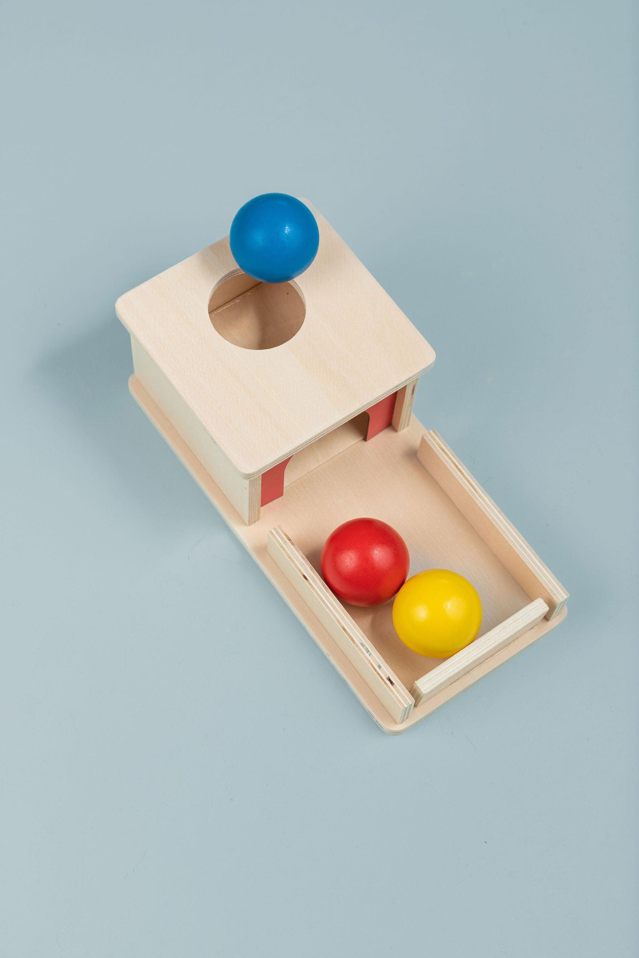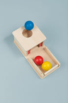 Wooden Object Permanence Box with Ball and Tray - the perfect toy to help your little one develop refined hand movements and cognitive skills! This compact and colourful puzzle is an essential tool for your child's development and experience of object permanence.