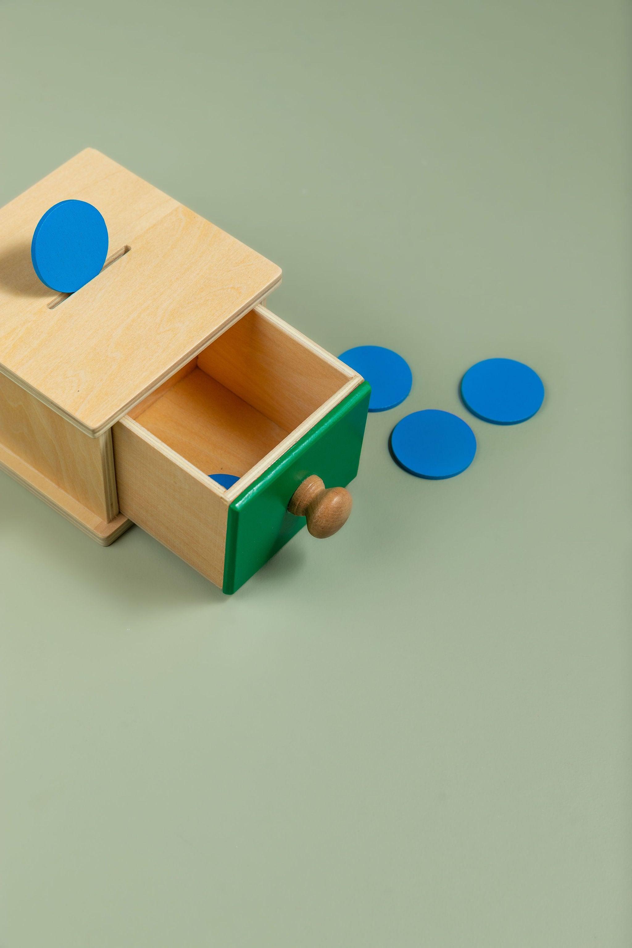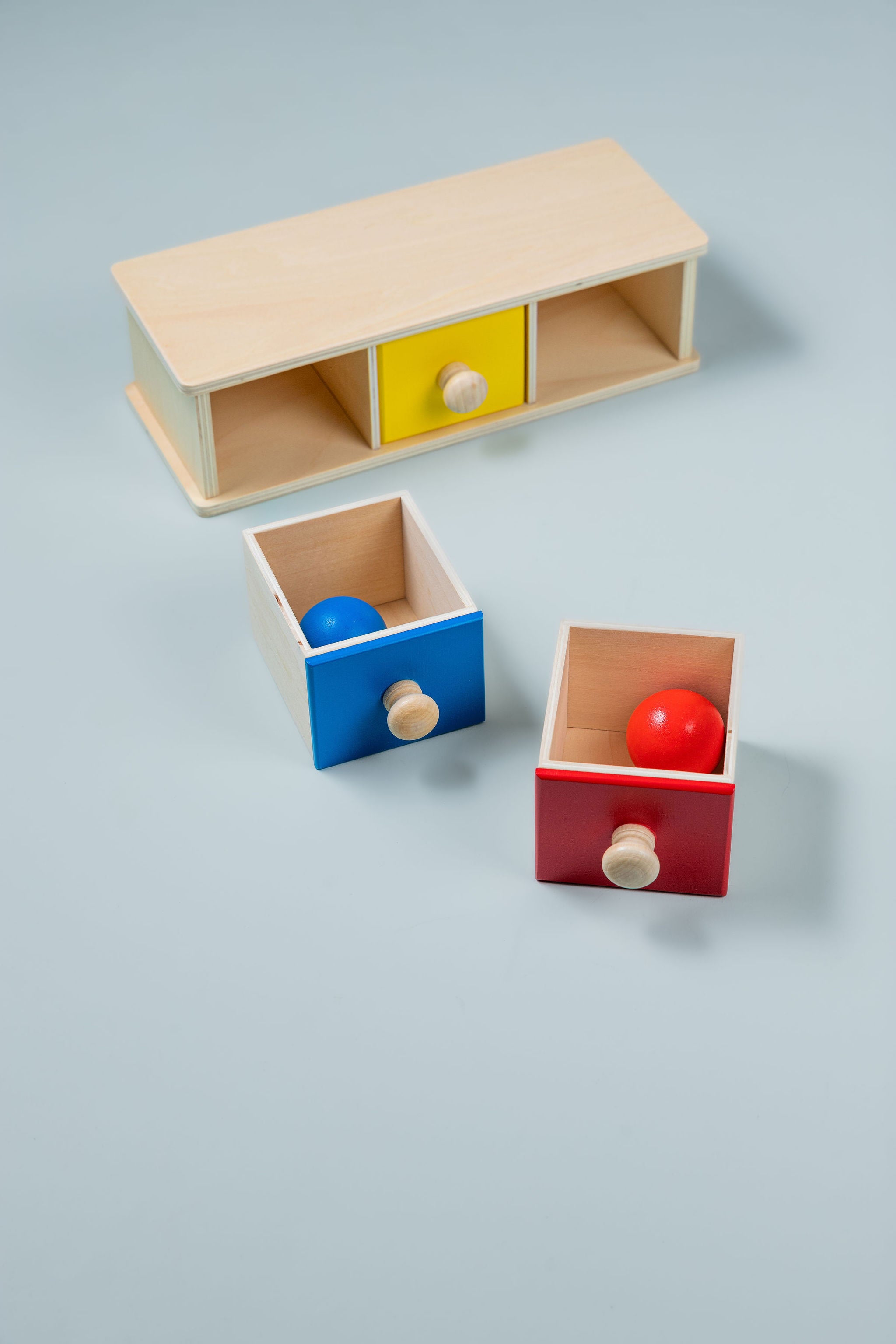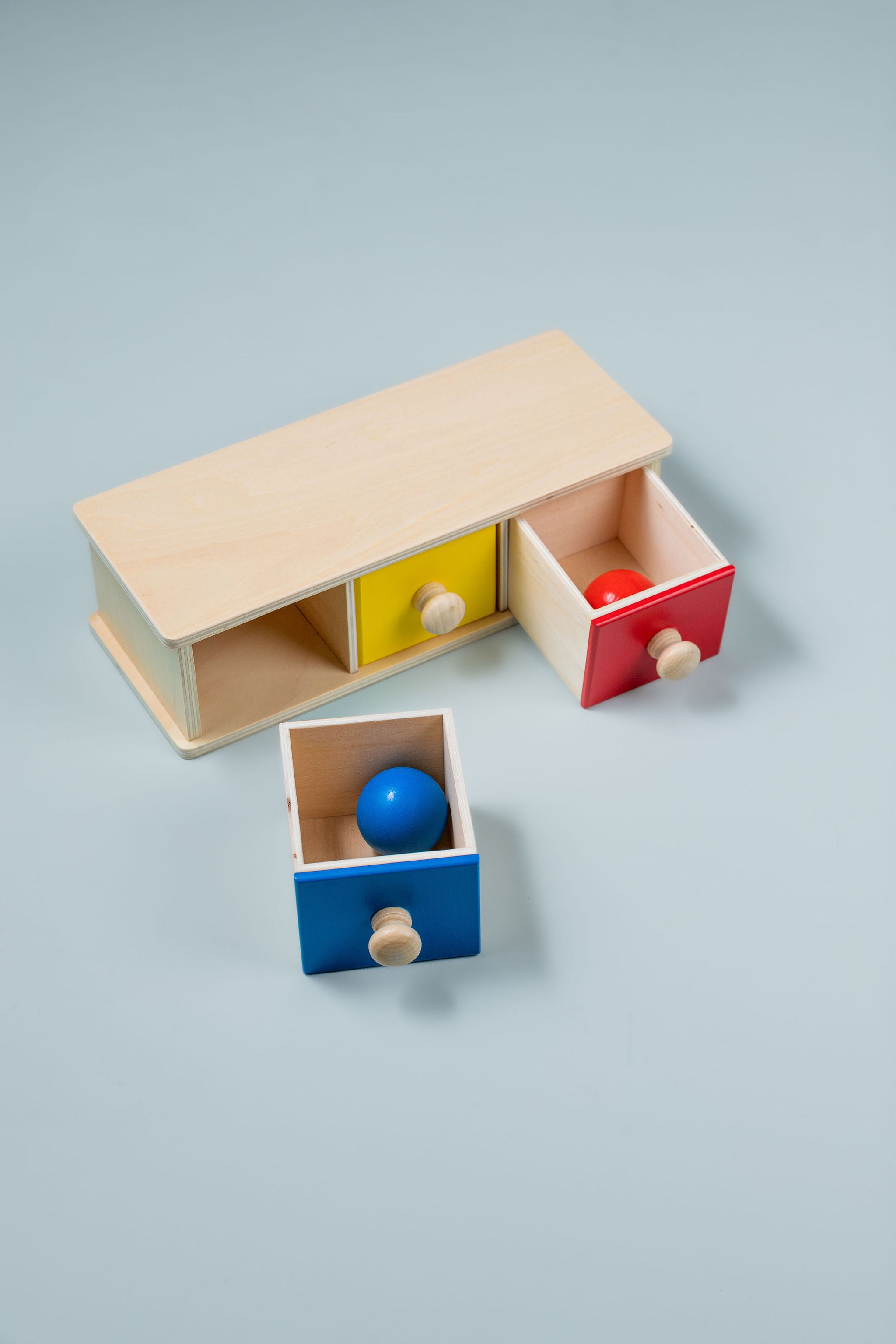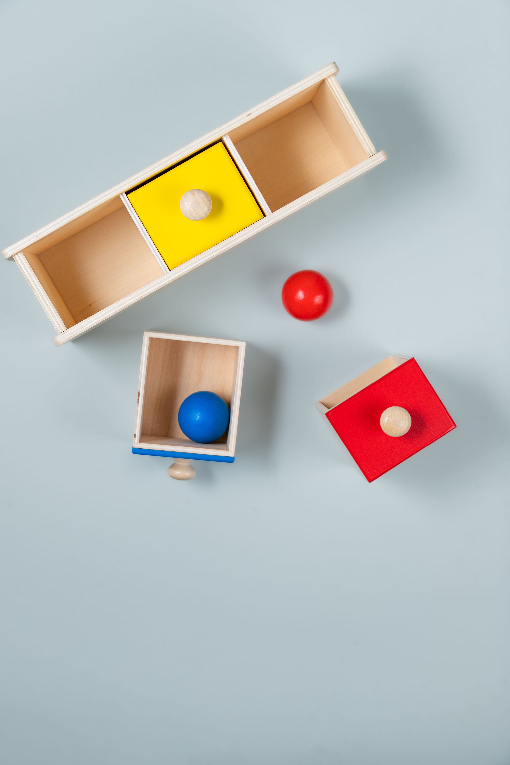 Wooden Object Permanence Box with Ball and Tray - the perfect toy to help your little one develop refined hand movements and cognitive skills! This compact and colourful puzzle is an essential tool for your child's development and experience of object permanence.