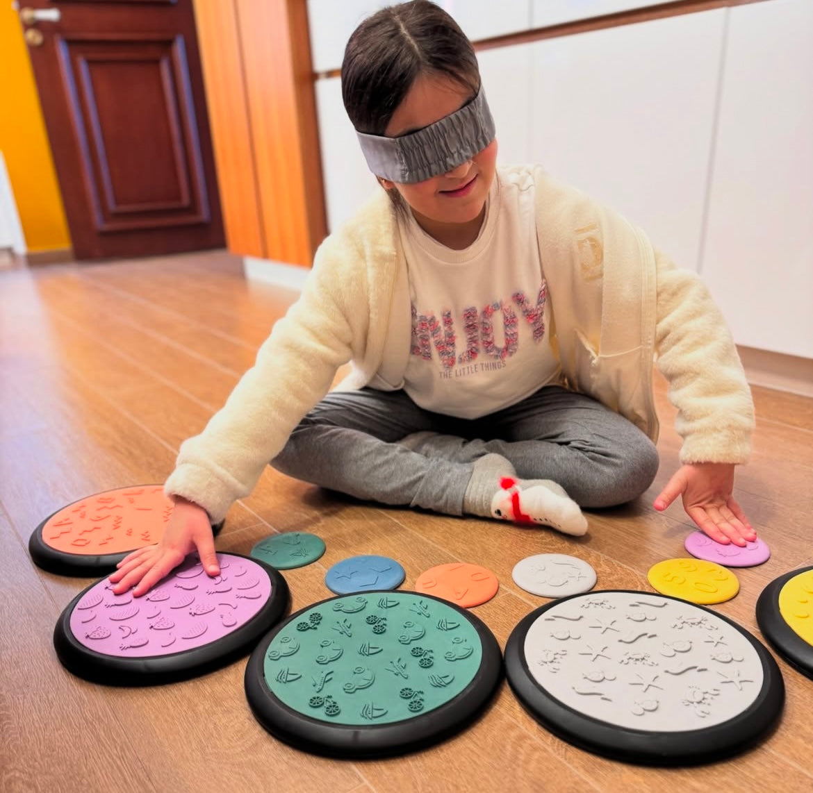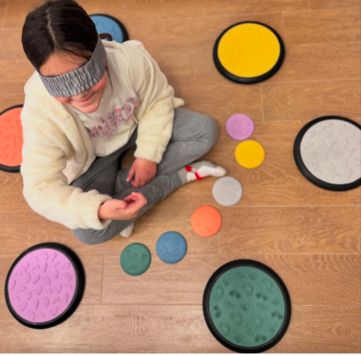 Feel the thrill of the challenge as you match the tactile discs to the corresponding stepping stones by touch. This interactive game not only promotes tactile discrimination but also adds an element of friendly competition. See who can match them all first and master the art of sensory perception.