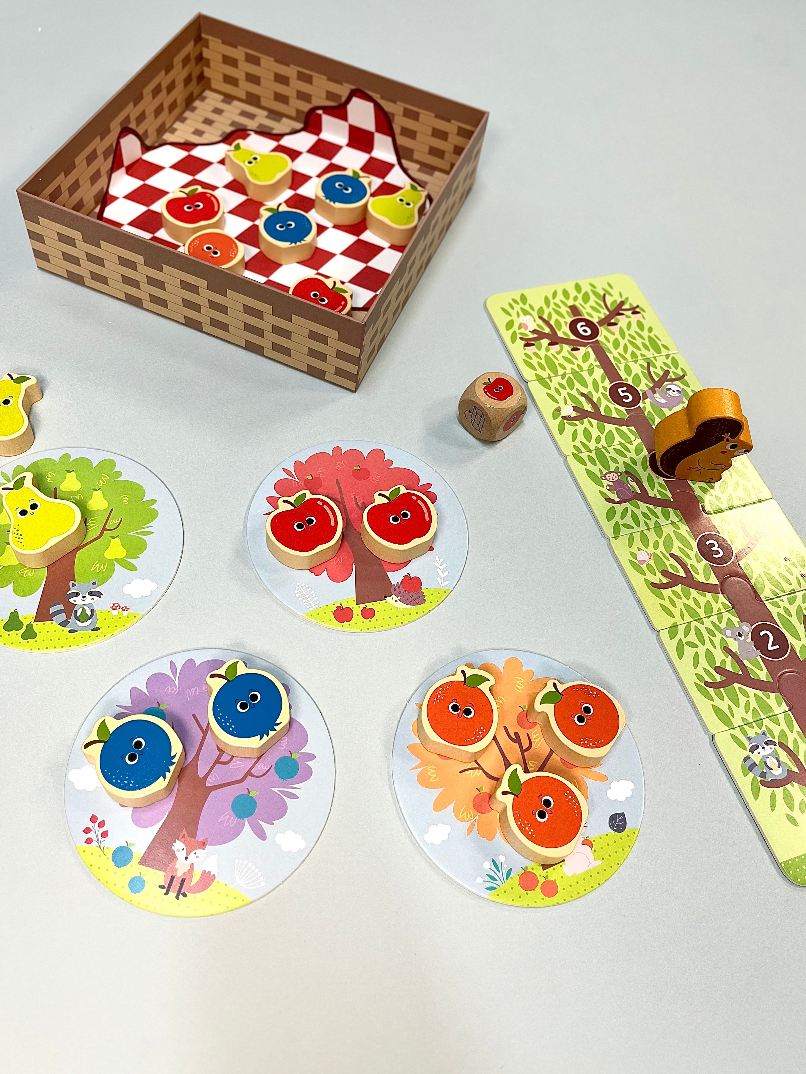 Squirrel Orchard is a fun cooperative game that helps children build colour recognition, fine motor skills and teamwork. Players roll the dice to collect matching fruit, pick any fruit or move the squirrel closer to the top of the tree.