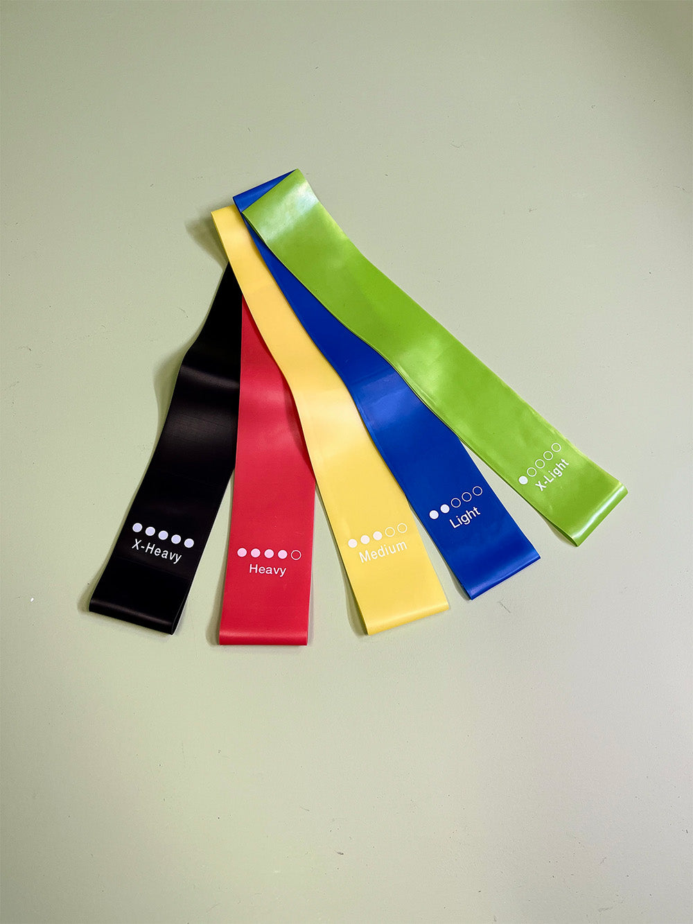 - 5 x Resistance Bands of various degrees of resistance (31 cm long, 5 cm wide)