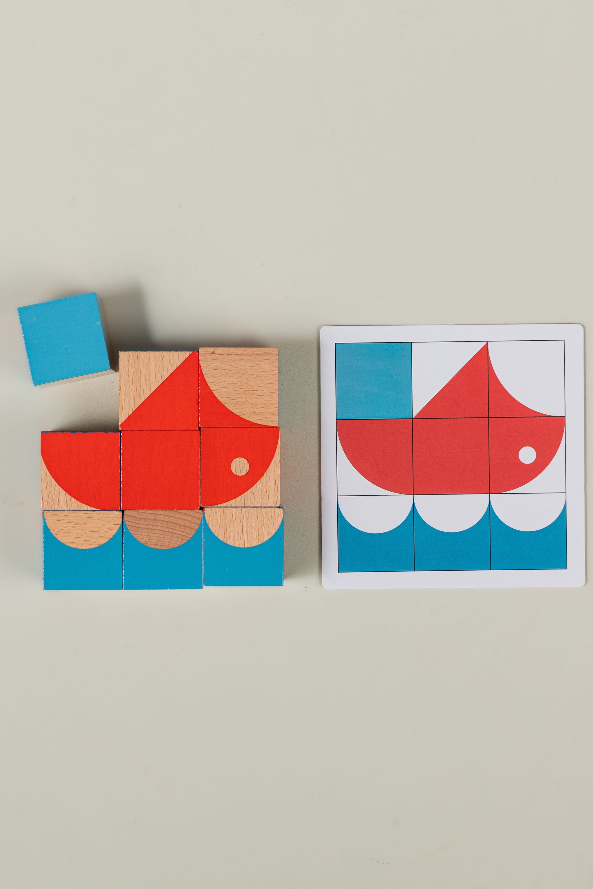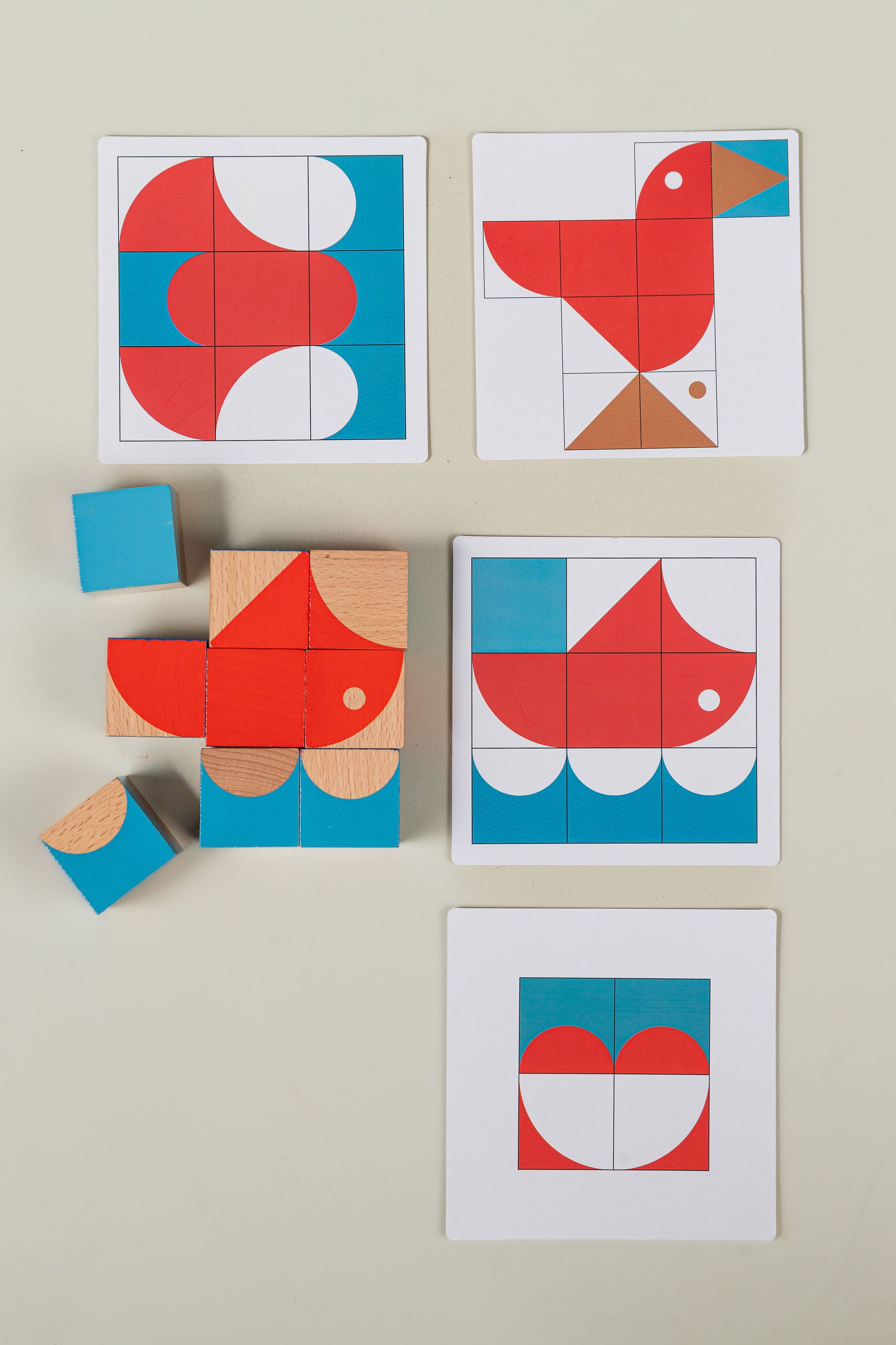 Using these 9 wooden cubes in 3 colours, children can use their imagination to build hundreds of different patterns not only horizontally but vertically too. They can experiment by recreating the templates or make up totally new combinations and figures. There is no limit to the number of combinations. Arrange your pattern, mix again and again!