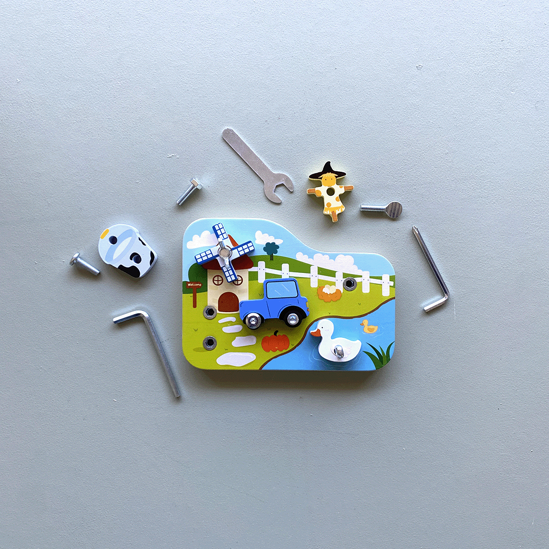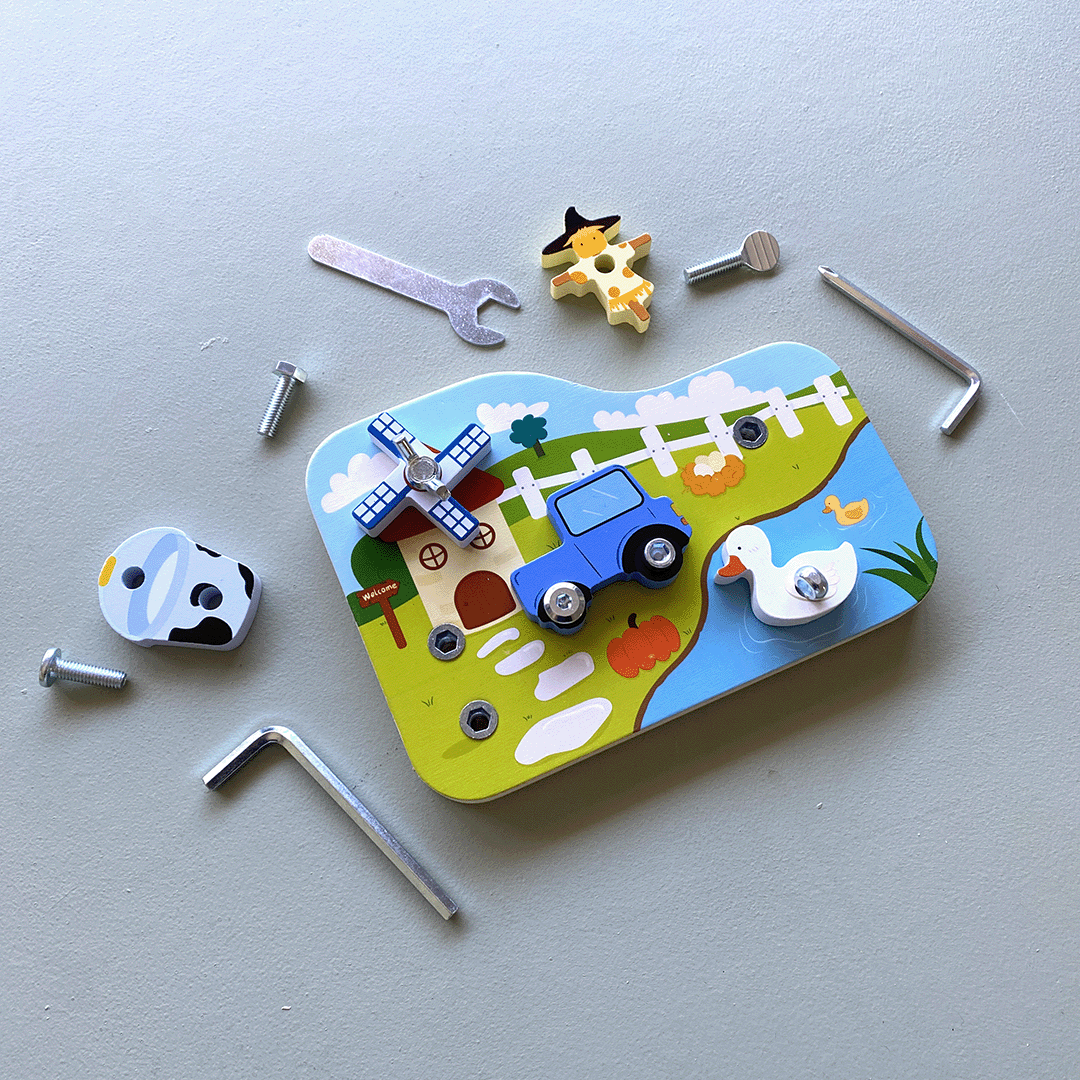 Let little hands explore, twist, and build their way through this cheerful wooden farmyard. The Twist & Screw Farm is more than just a busy board, it’s a hands-on invitation to strengthen fine motor control, problem-solving, and concentration through real, meaningful play.