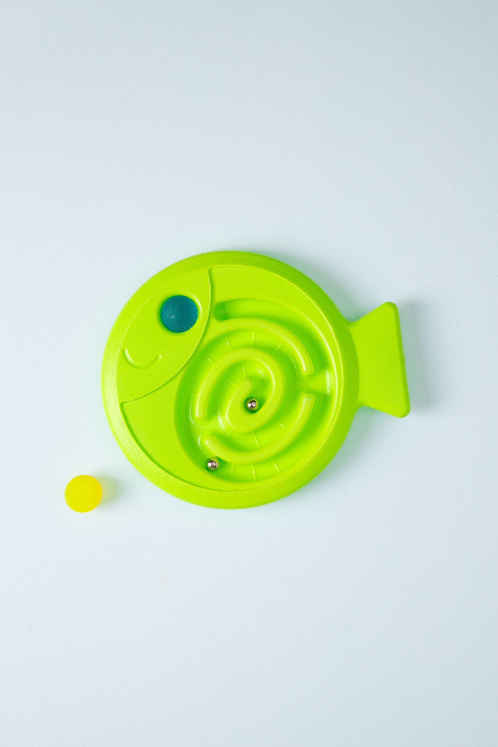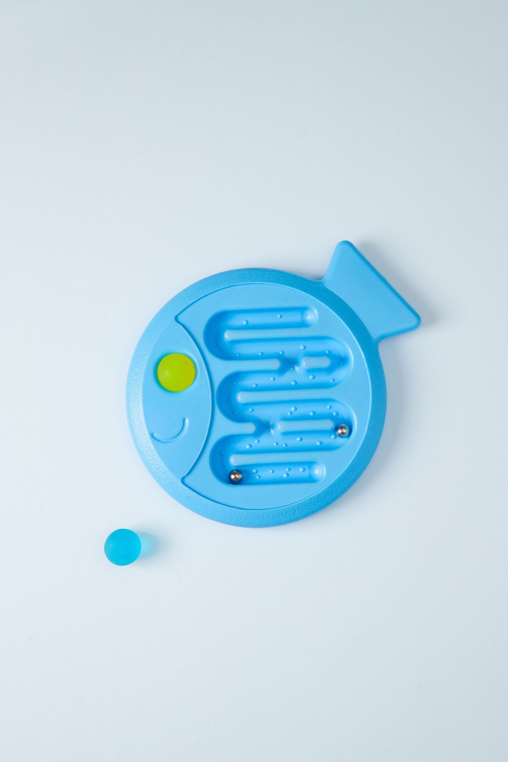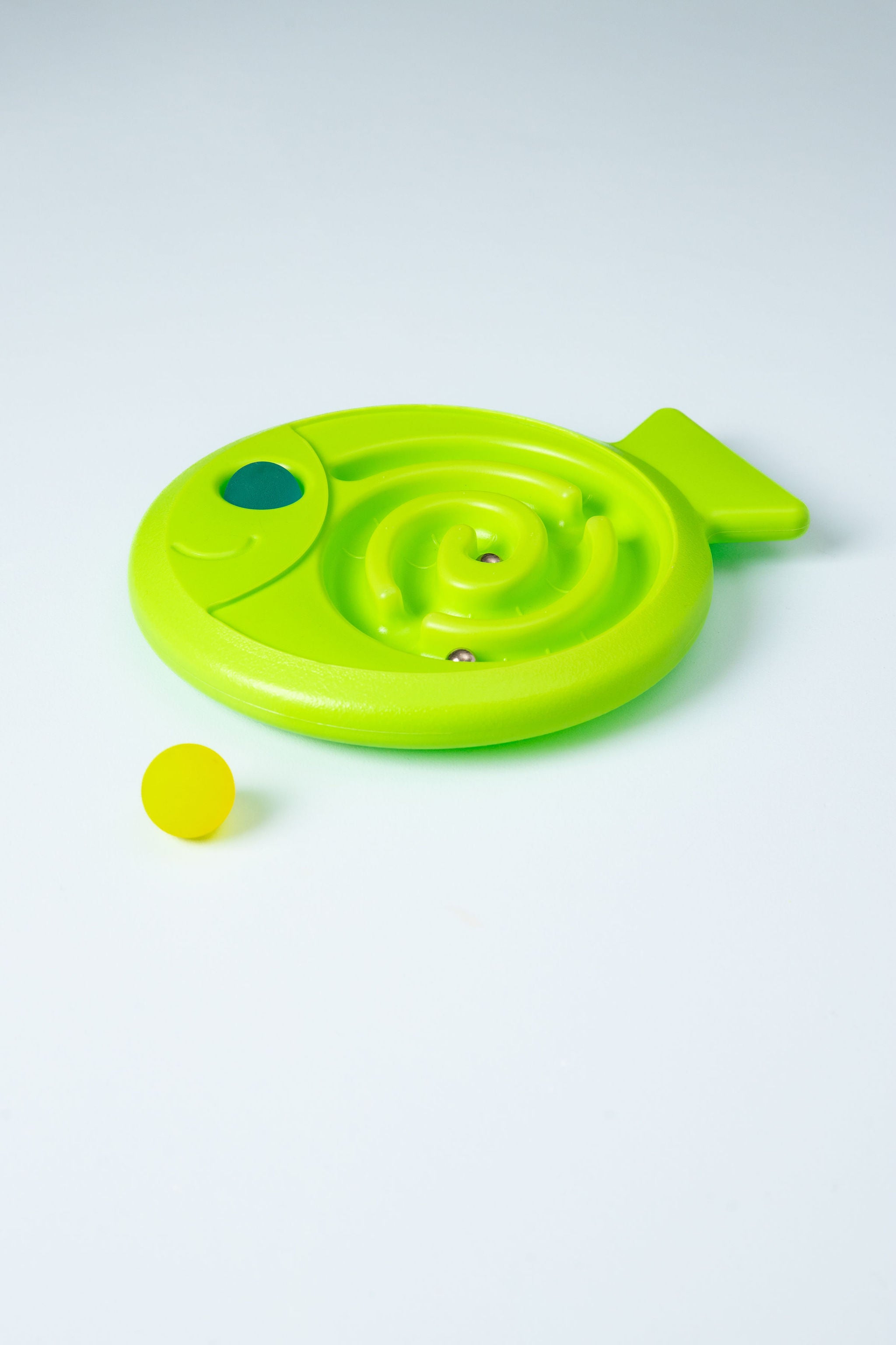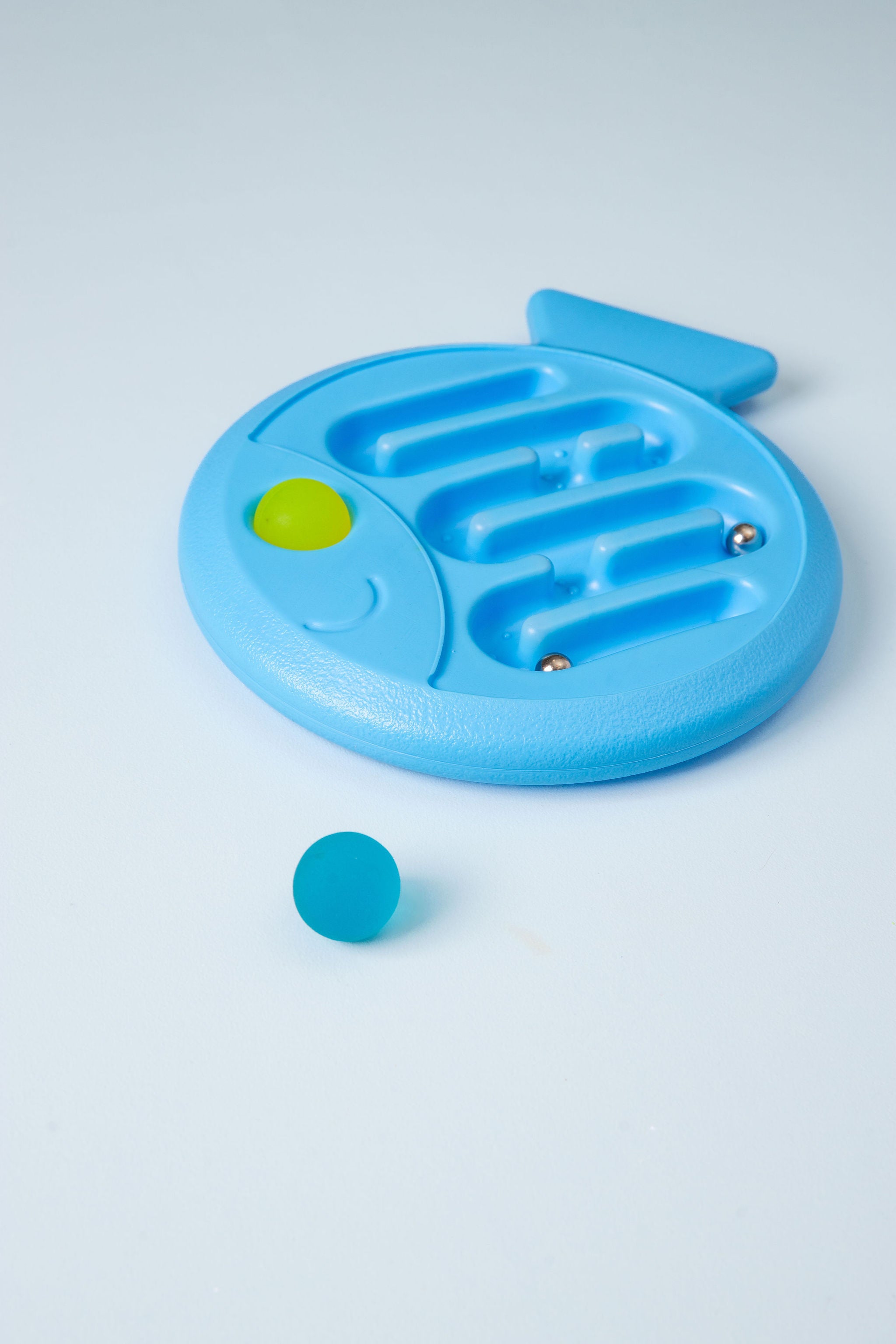 Train your coordination skills in two ways with this coordination game. This plastic balance board in the shape of a fish has a maze on one side and a shallow track on the other. Hold the board in 2 hands, roll the small ball through the maze and make sure it ends up in the right place. On the other side of the fish, let the included bouncy ball roll through the shallow track. Keep your balance and don't let the ball fall off the fish! Train your motor skills and coordination skills with this balance game. Includes 2 large bouncy balls and 2 small metal balls.