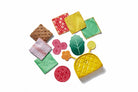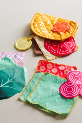 - The 12-piece infant toy includes a soft foam taco shell, 3 smooth fabric pieces, 3 textured crinkle pieces, 3 food-shaped fabric pieces, 2 attached textured pieces