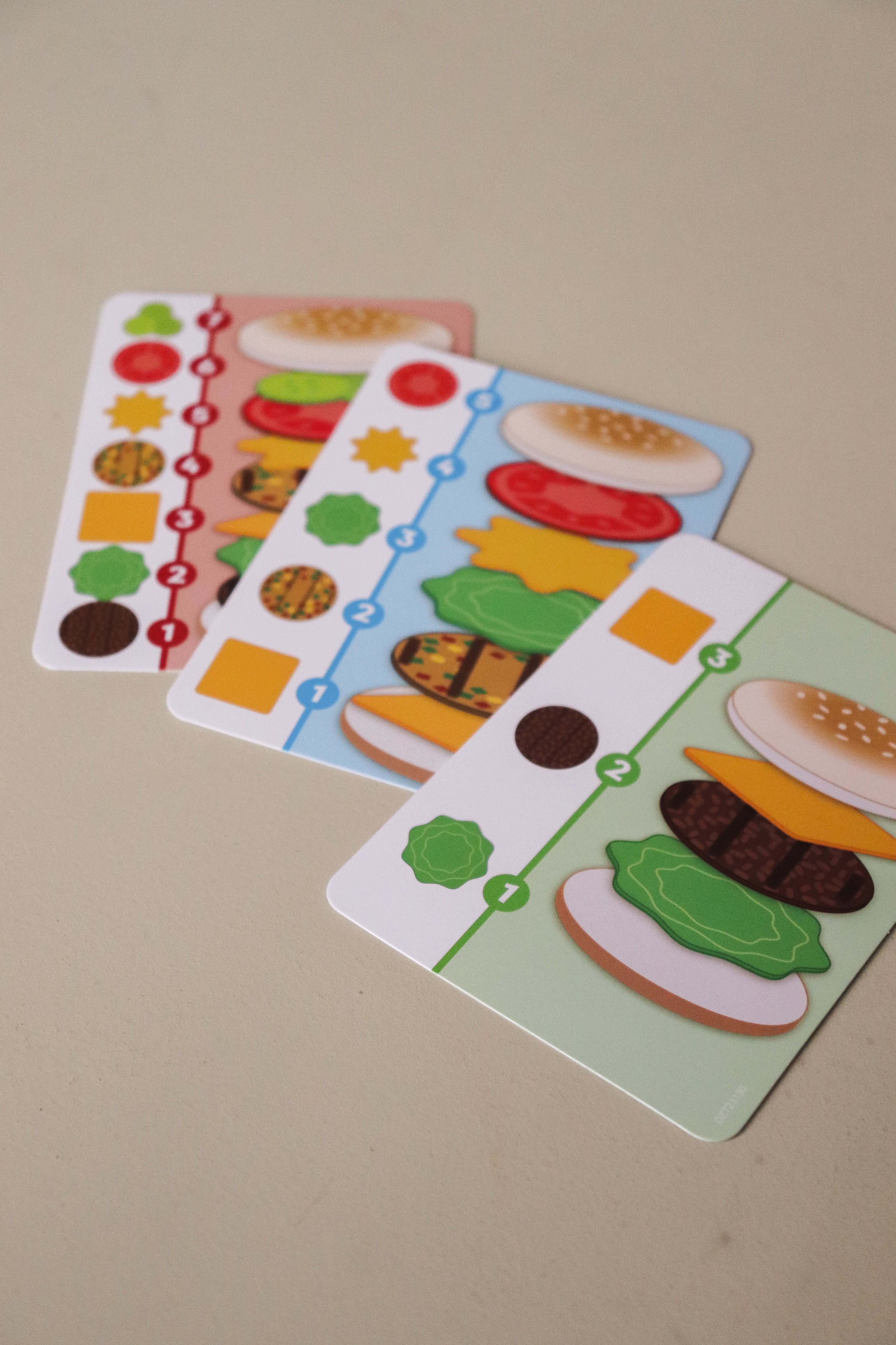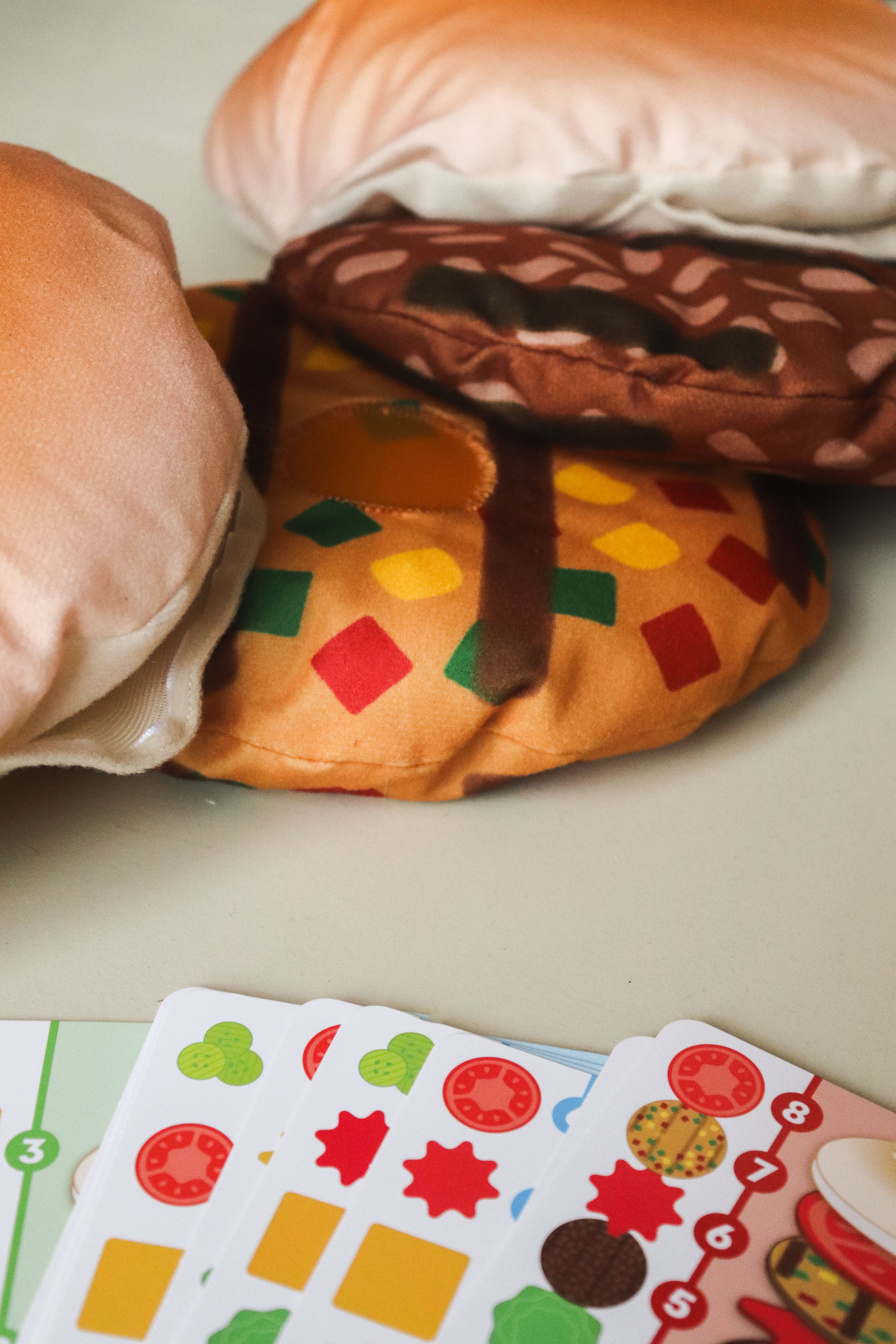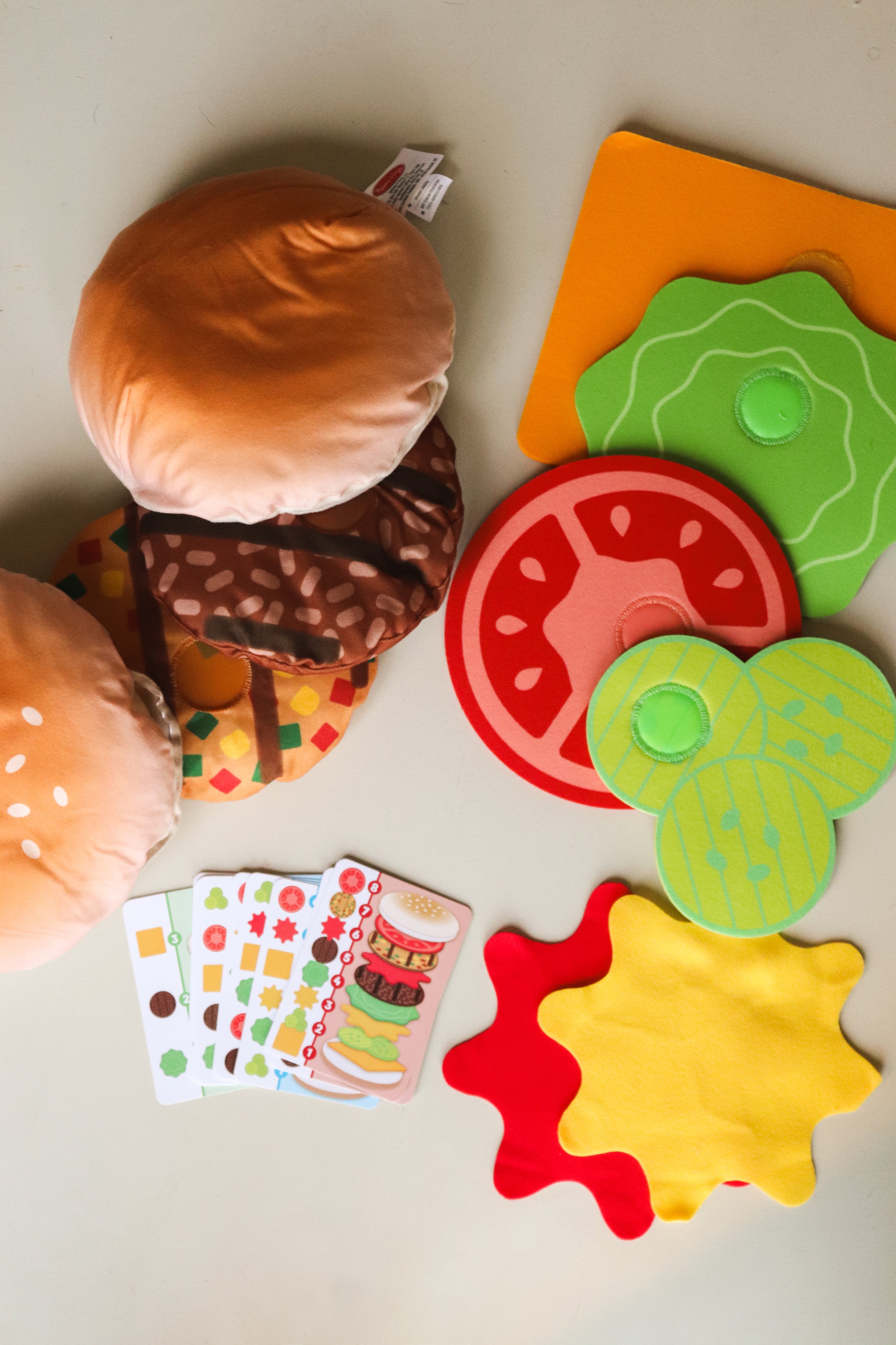 - 2 burger bun gloves, burger patty, veggie burger patty, felt lettuce, tomatoes, pickles, ketchup splat, mustard splat, 10 double-sided ingredient playing cards, illustrated game instructions (4 game suggestions for various ages)