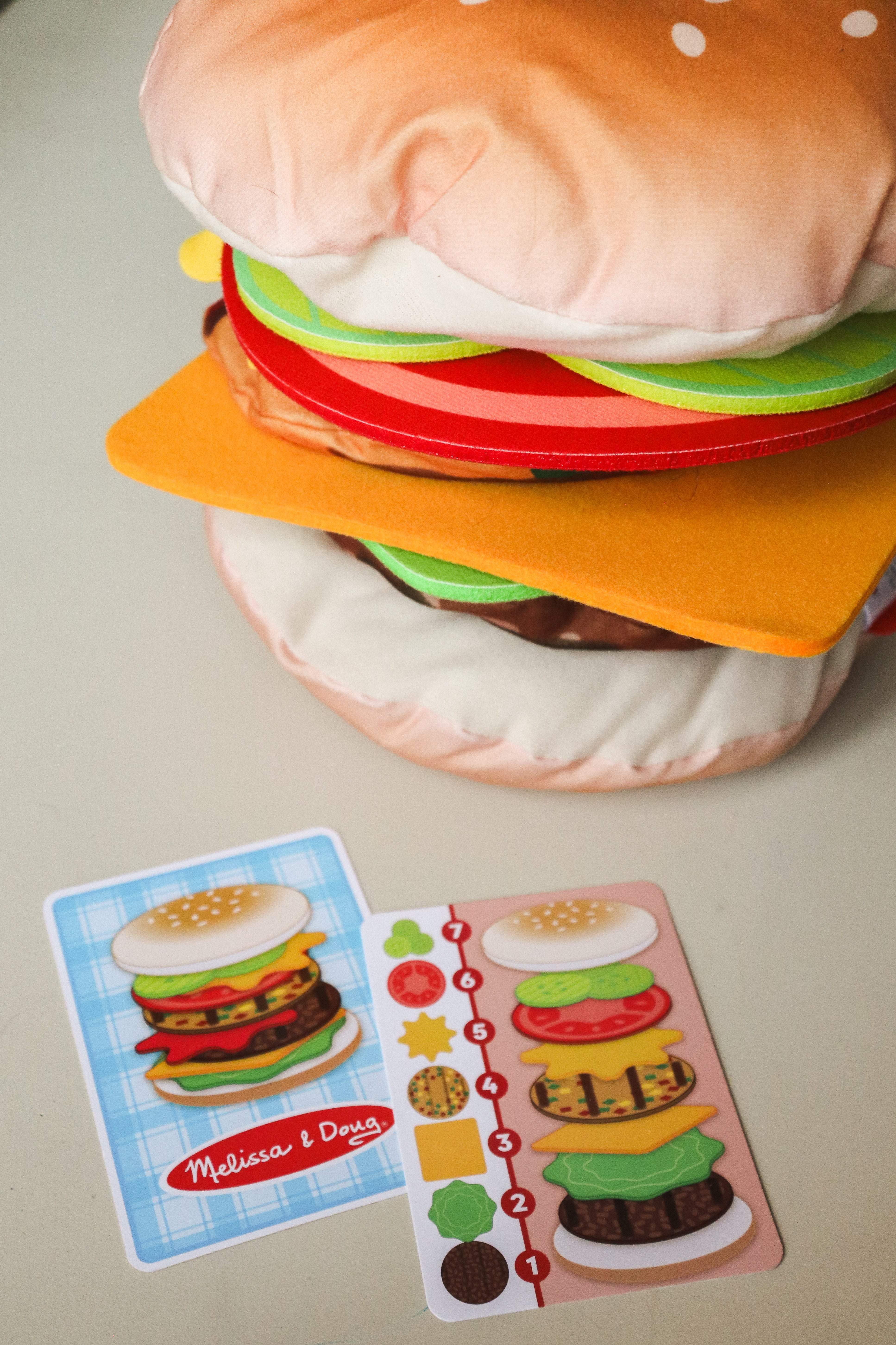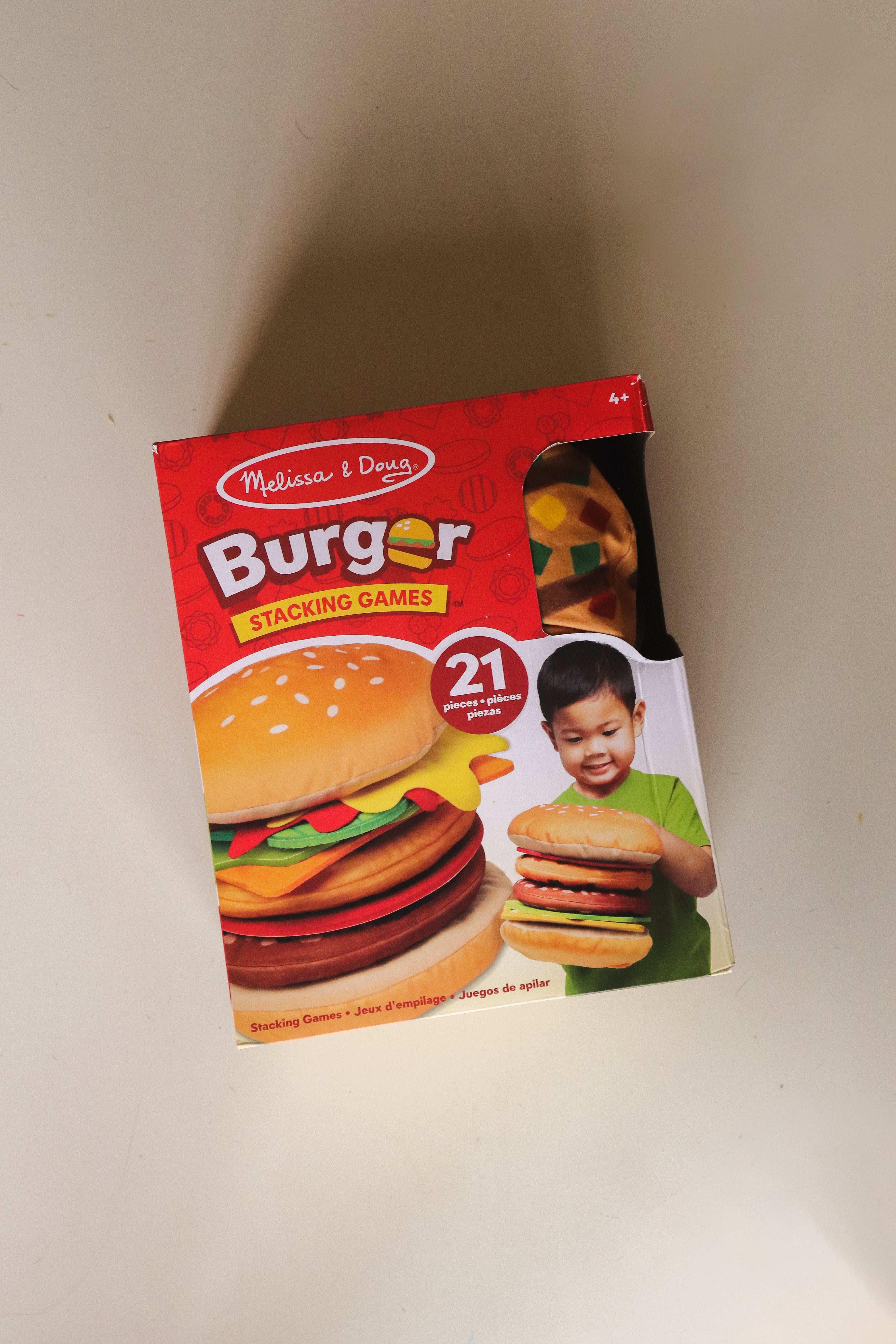 Play with your food with this new Melissa & Doug Burger Matching, Catching, and Stacking Games. With its jumbo fabric burger ingredients and bun gloves, kids can enjoy various games like matching orders, racing to pick up ingredients, and of course, pretend food play. Great for all ages, it comes with 10 double-sided ingredient play cards and 4 game suggestions. Play, learn and grow with Melissa & Doug Burger Games.
