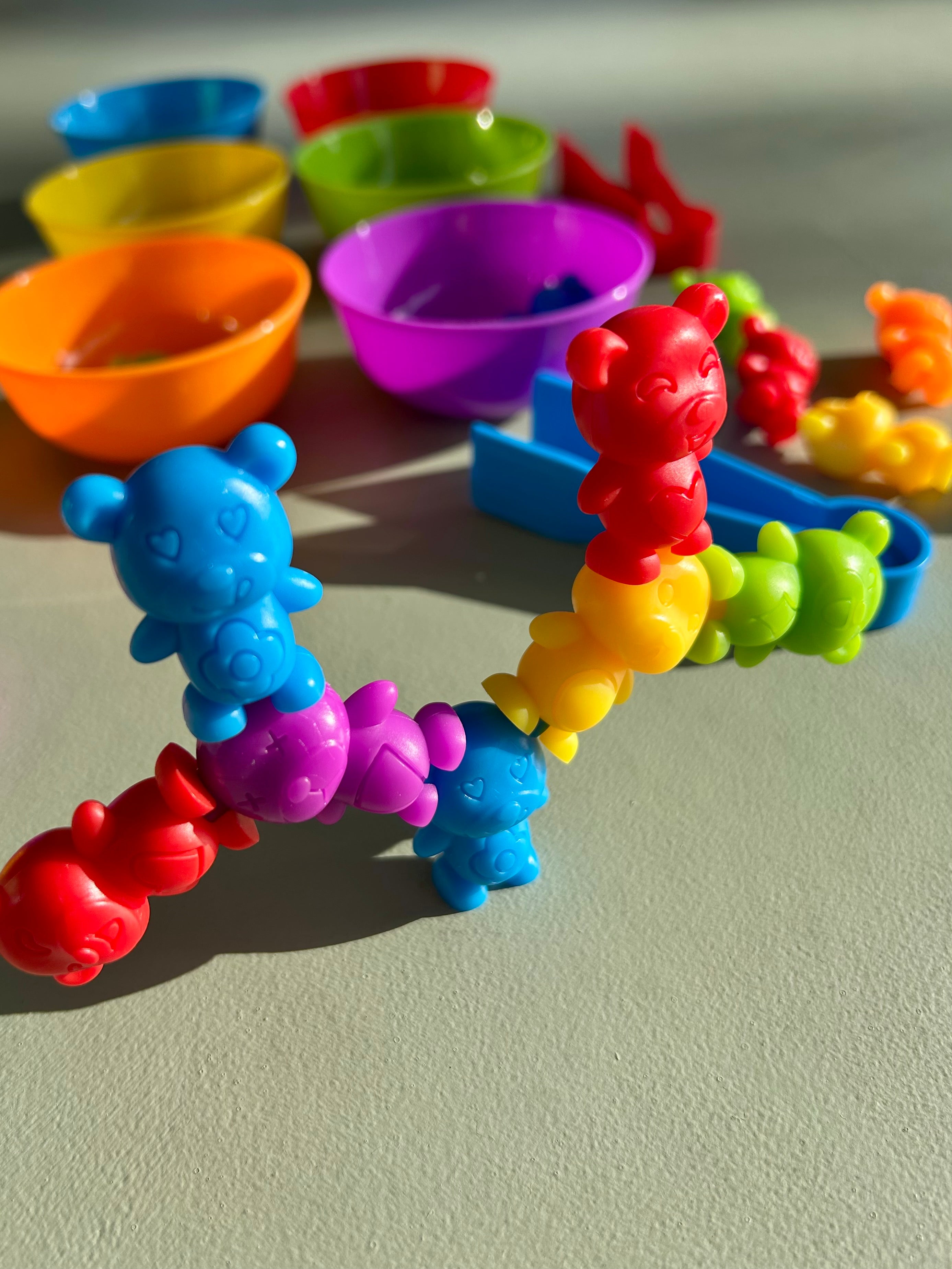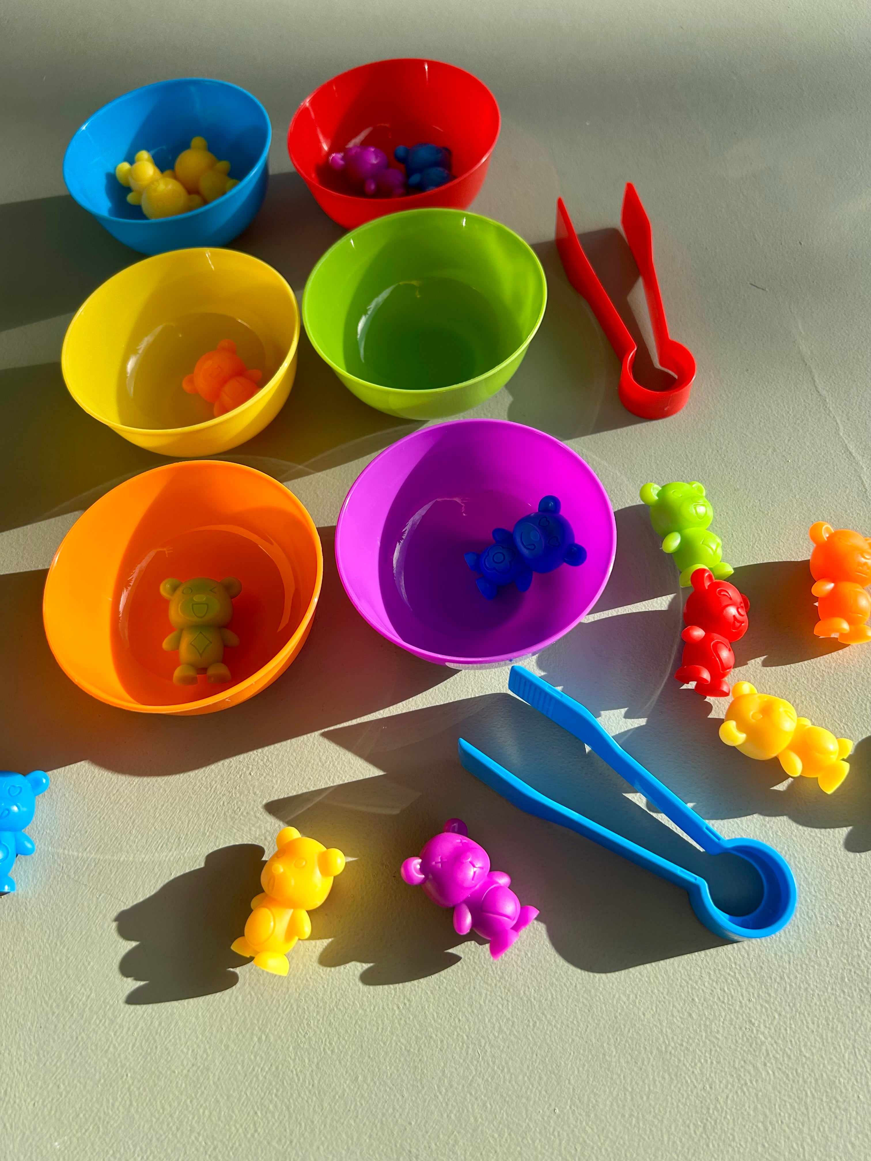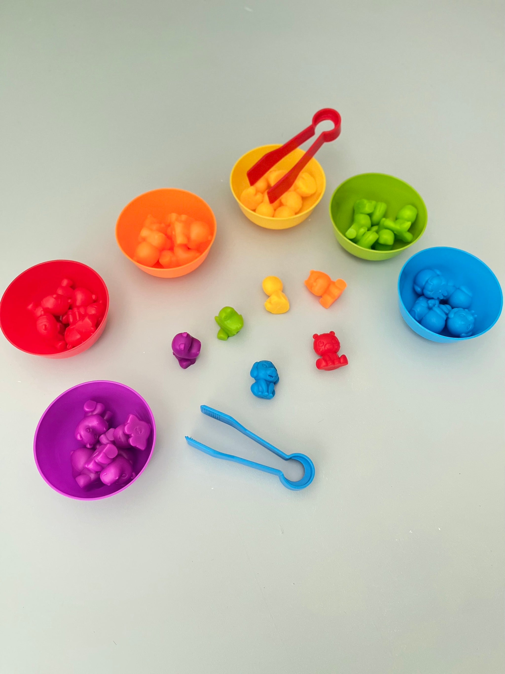 The tweezers are particularly valuable. They require more precision and hand strength than fingers alone, making each transfer a purposeful fine motor challenge. Paired with the colour bowls, they also introduce the concept of matching and categorising, foundational thinking skills for both maths and language.