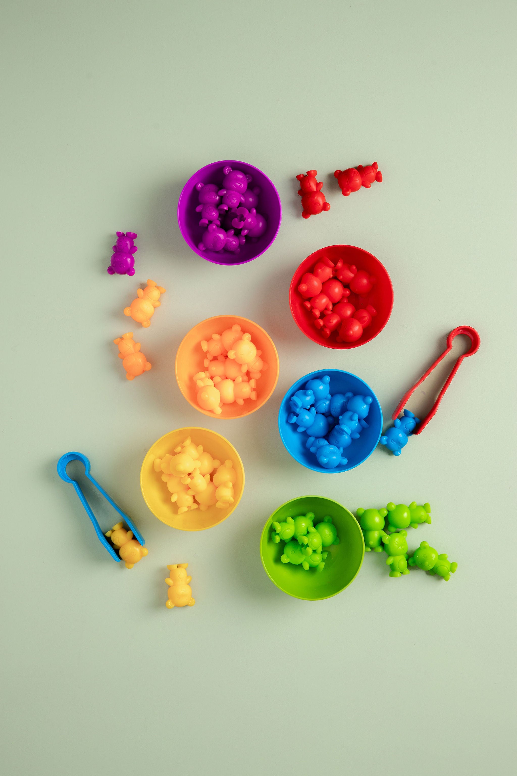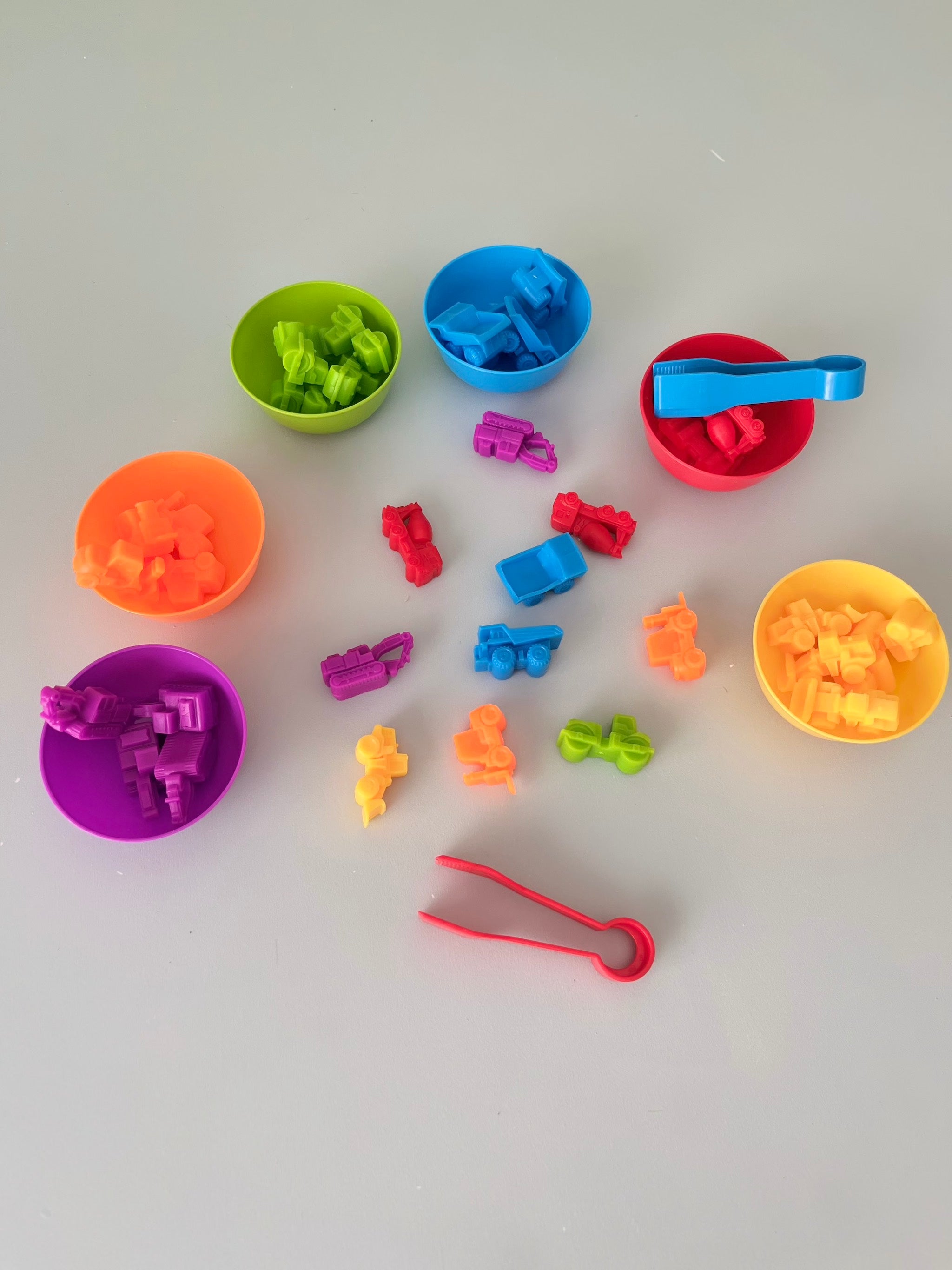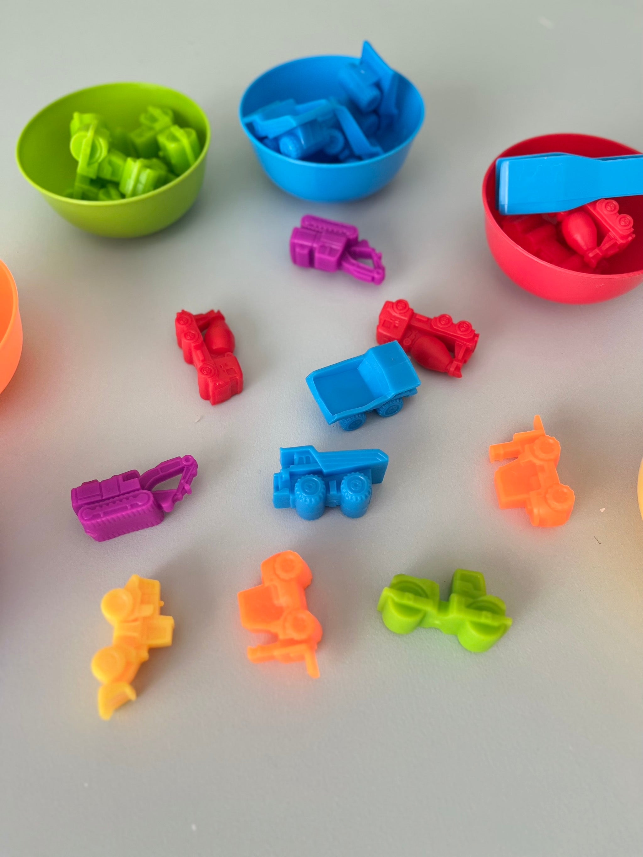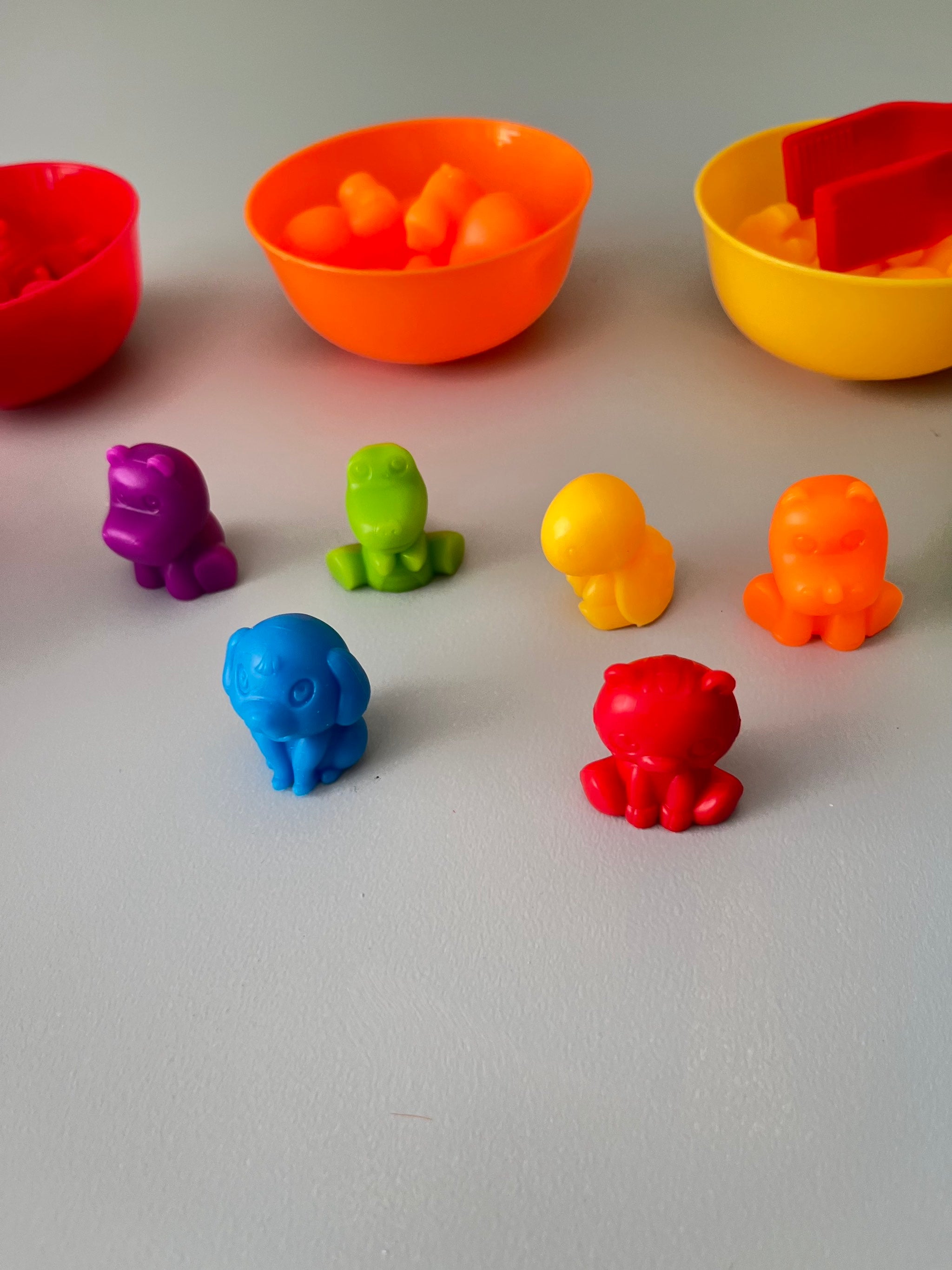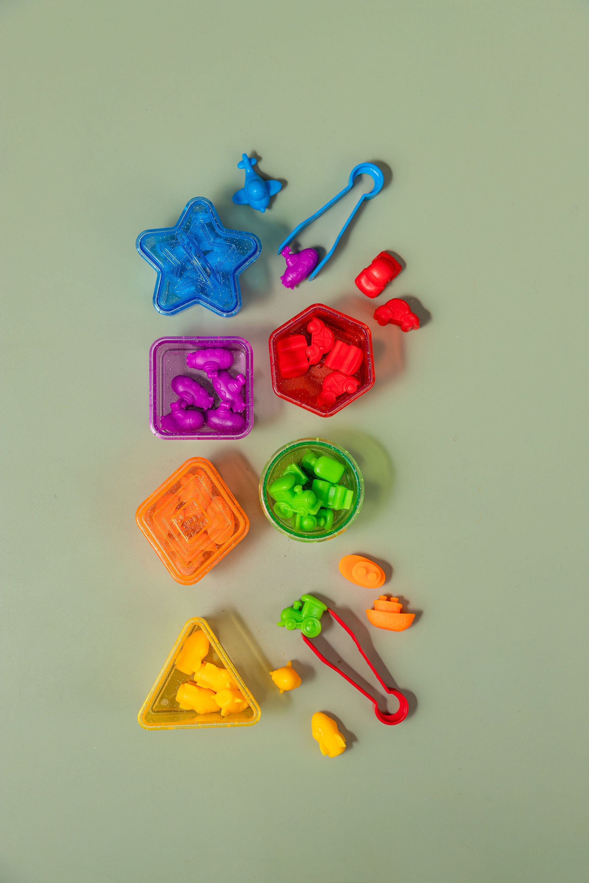 Lay out the colour bowls and let your child sort the figures by colour, type, or size using the tweezers. Then count, compare, and talk about what they find.