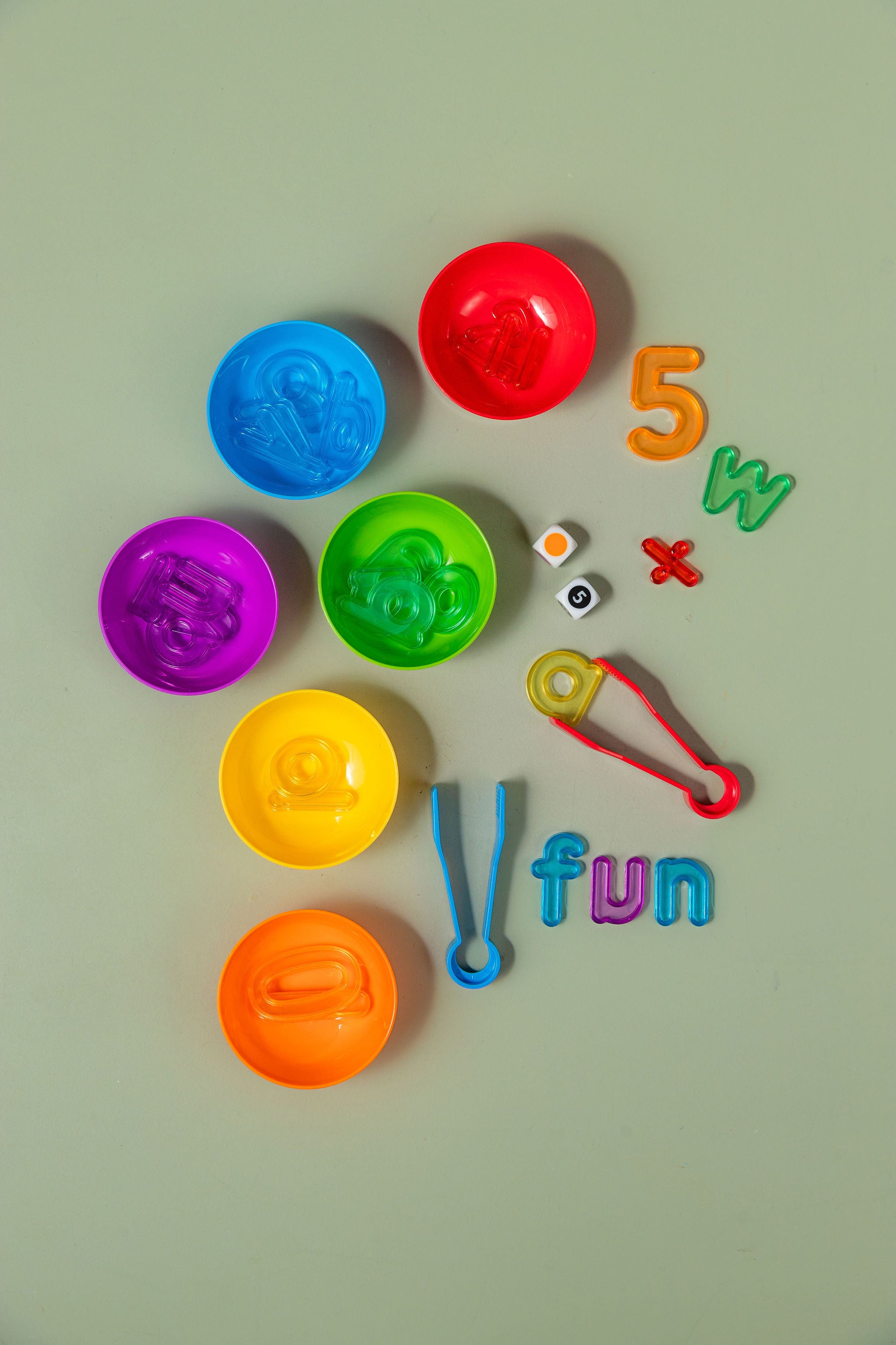 - Alphabet Sorting Set (2 tweezers, 6 sorting cups, 2 dice, 11 numbers, 6 maths equations, 26 lowercase letters)