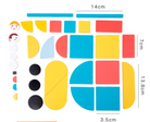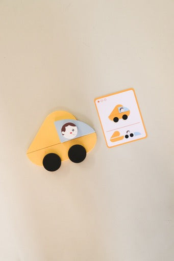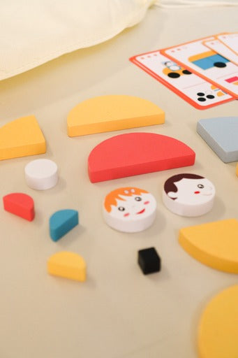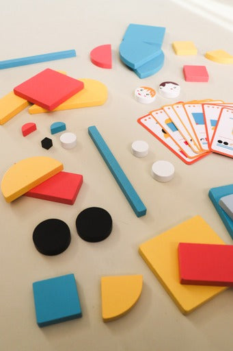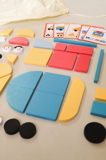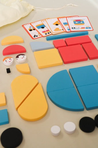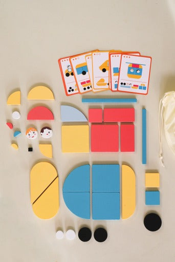 This set comes with 33 wooden pieces in geometric shapes and 20 vehicle template cards (with 3 levels of difficulty shown by stars).