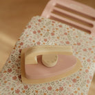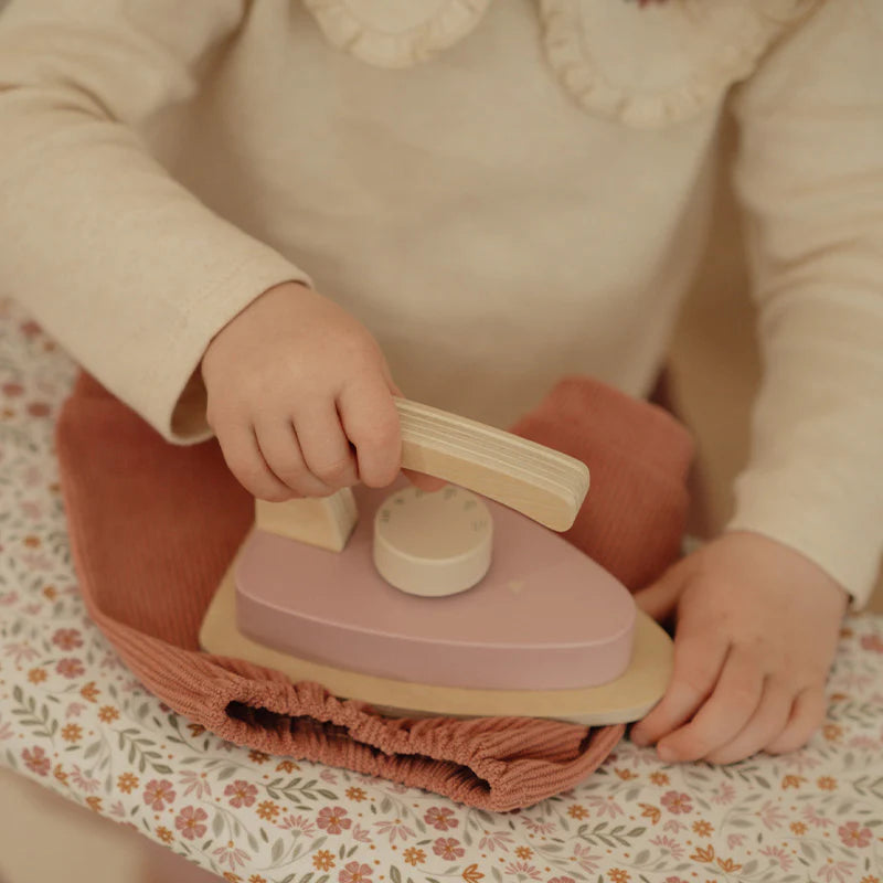 Iron like the grown-ups! With this beautiful wooden ironing board and matching iron, little ones can neatly smooth their dolls' or stuffed animals' clothes. The board folds flat for easy storage. A perfect addition to role-play and a great way to playfully explore household chores!