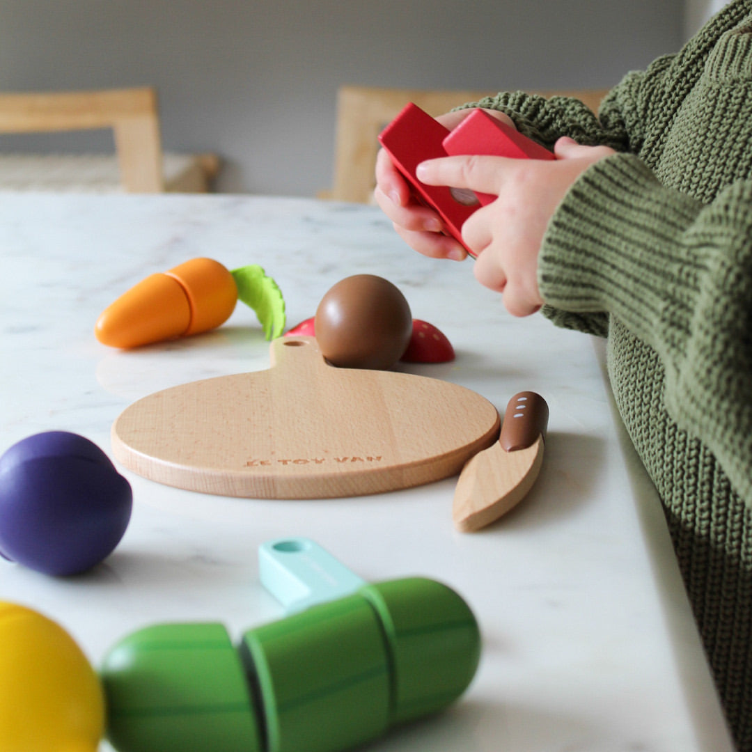 Chop, chop! Budding chefs will love preparing delicious meals with this delightful 18 piece chopping board set. This imaginative toy is sustainably made using FSC® - certified wood and makes a lovely addition to role play scenarios. Comprising a natural wooden chopping board, peeler, knife plus a selection of tasty looking fruit and veggies that can be ‘chopped up’ using the clever Velcro detailing. A great gift to encourage social skills, improve dexterity and hone fine motor skills.