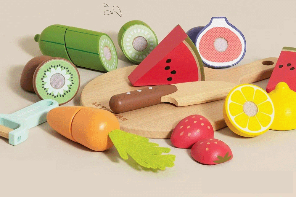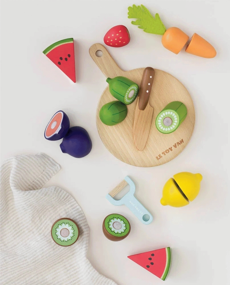- 15 x velcro fruit pieces, chopping board, peeler and knife