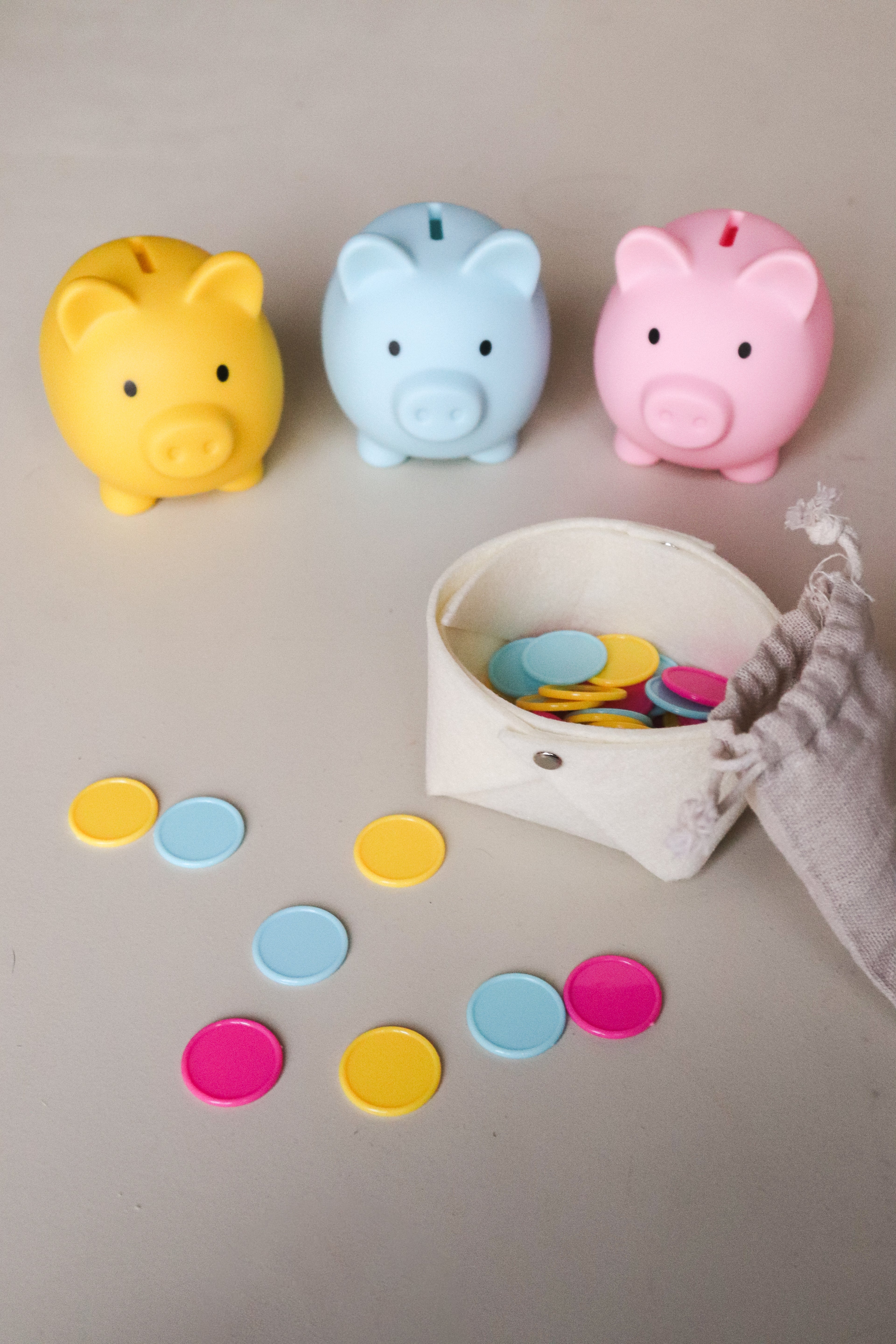 - 3 Soft silicone piggy banks (Yellow, Blue, Pink)
