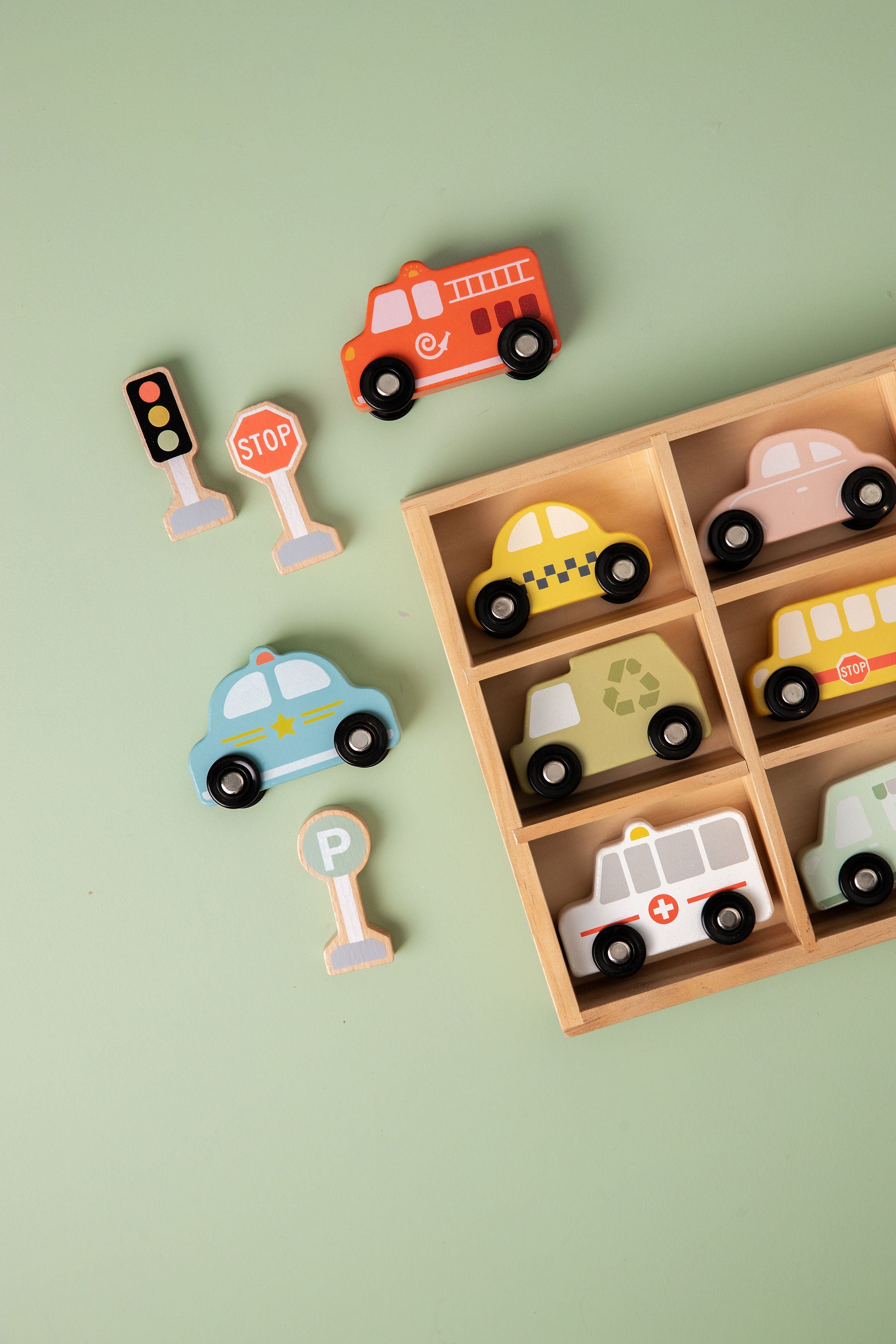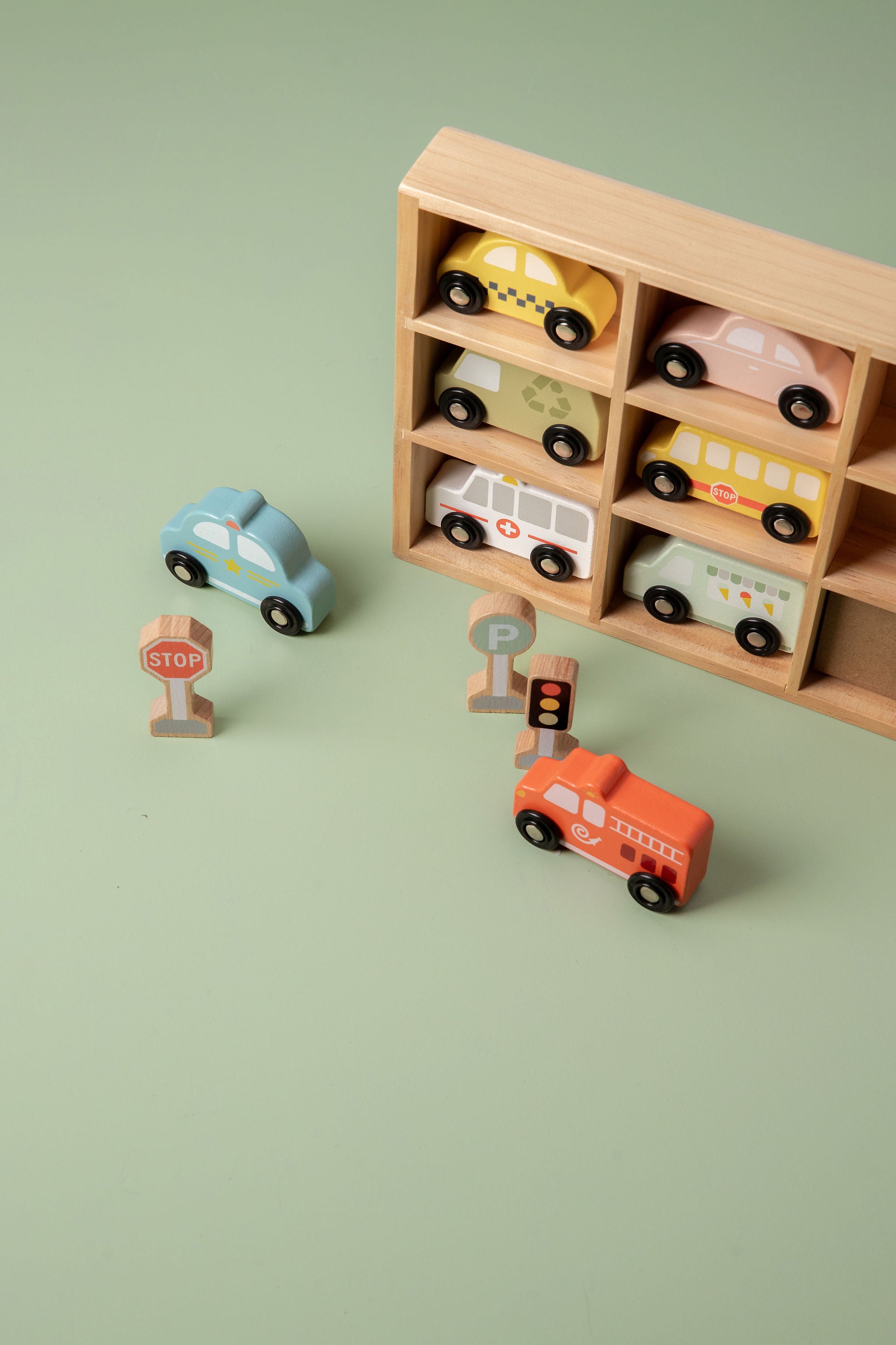 Introduce your child to a world of travel and pretend-play with the Transportation & Street Sign Set from TookyToy. This engaging set includes 8 wooden vehicles and 3 common signs, providing everything car-loving kids need to create bustling streets and lively scenes with their train sets and blocks.